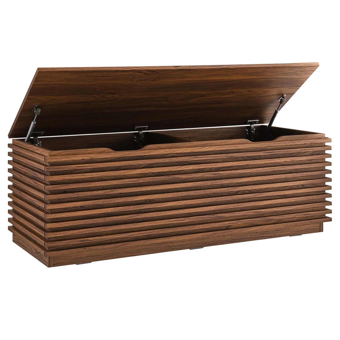 • Tap into mid-century aesthetics with the Render Storage Bench. This installment of the Render collection features a durable particleboard frame with a smooth wood grain laminate and retro slatted detail. With a hinged top, this versatile accent bench features a solid construction with a pleasing look and practical functionality. Perfect for the living room, bedroom, entryway, or mudroom, this 47" bench offers ample storage space for linens, clothes, blankets, or whatever else suits your needs. Includes cutouts as a safety measure. Assembly required.