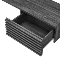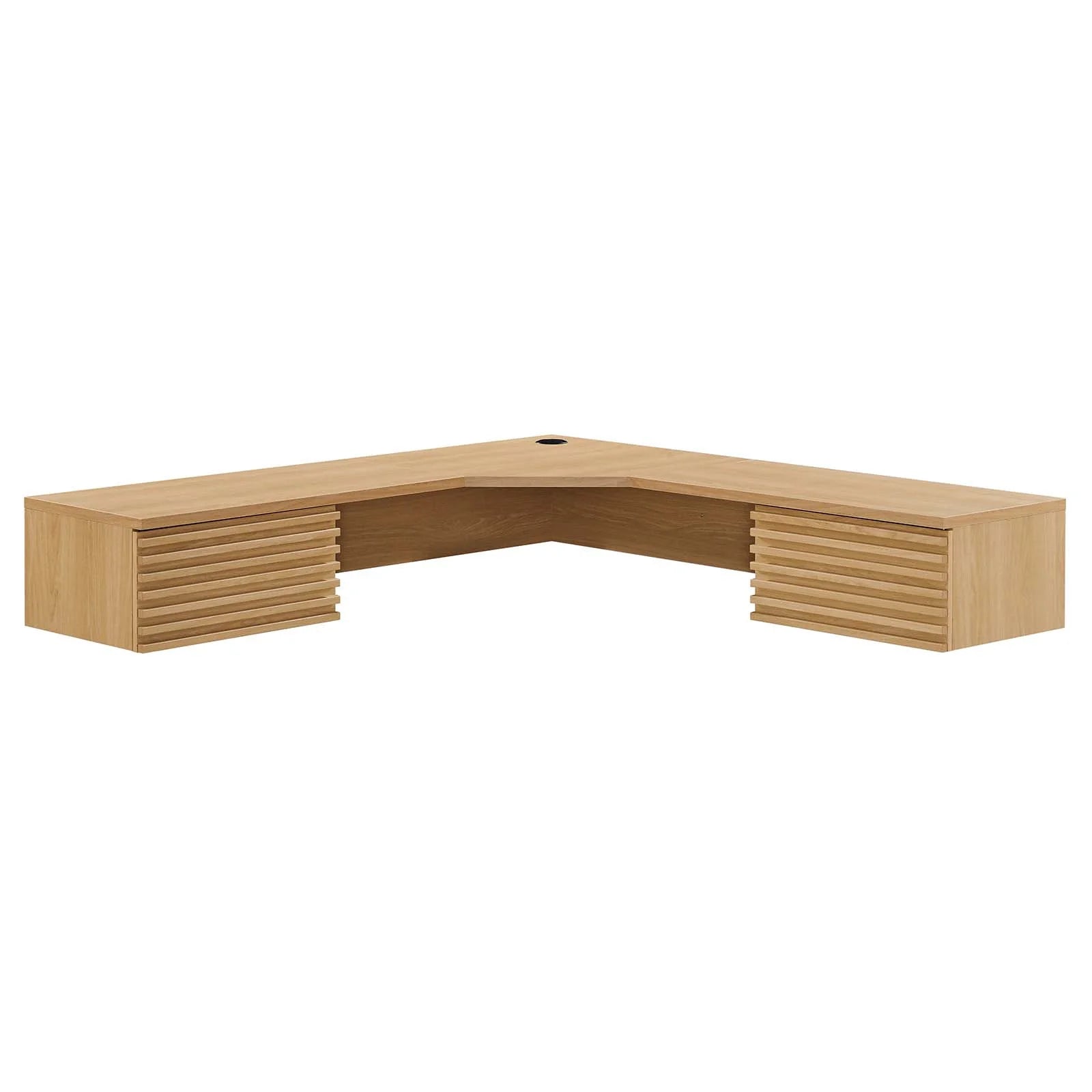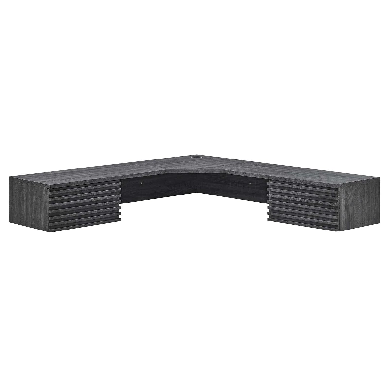 • Tap into mid-century aesthetics with the Render Wall-Mount Corner Office Desk. This corner office desk features a durable particleboard frame with smooth wood grain laminate, a cable management hole, and two full-extension glide drawers for ample storage space of all your office essentials. Boasting a mid-century modern style and nestling into the corner of an office, this computer desk features a solid construction with a pleasing look and practical functionality. Perfect for the apartment, home office, or dorm room. Assembly required. Weight Capacity: 200 lbs.