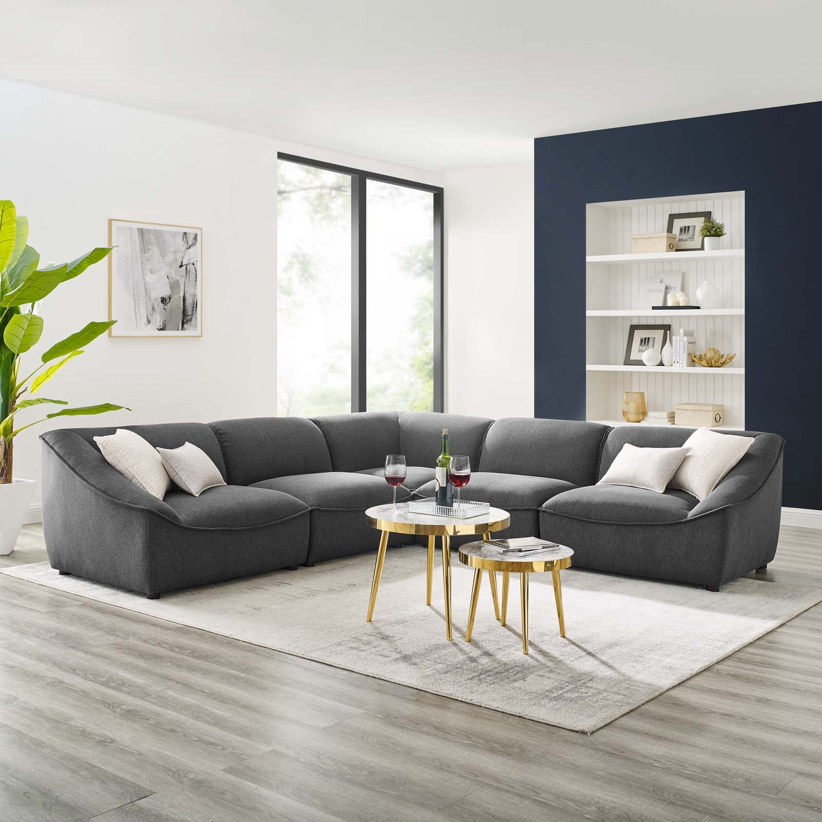 • Indulge in cozy relaxation in the comfort of your own home with the Comprise Upholstered 5-Piece Sectional Sofa. A casual design accented with French piping details, this sectional sofa features dense foam padding, soft polyester upholstery and a pocket coil spring system to offer a premium seating experience. Solidly constructed with solid wood and plywood, this upholstered sofa rests atop sturdy rubberwood legs with secure connectors between modular pieces. Create a custom living room or lounge area with the Comprise Living Room Furniture Collection. Set Includes: 1 Left-Arm Chair, 1 Right-Arm Chair, 1 Corner Chair, 2 Armless Chairs