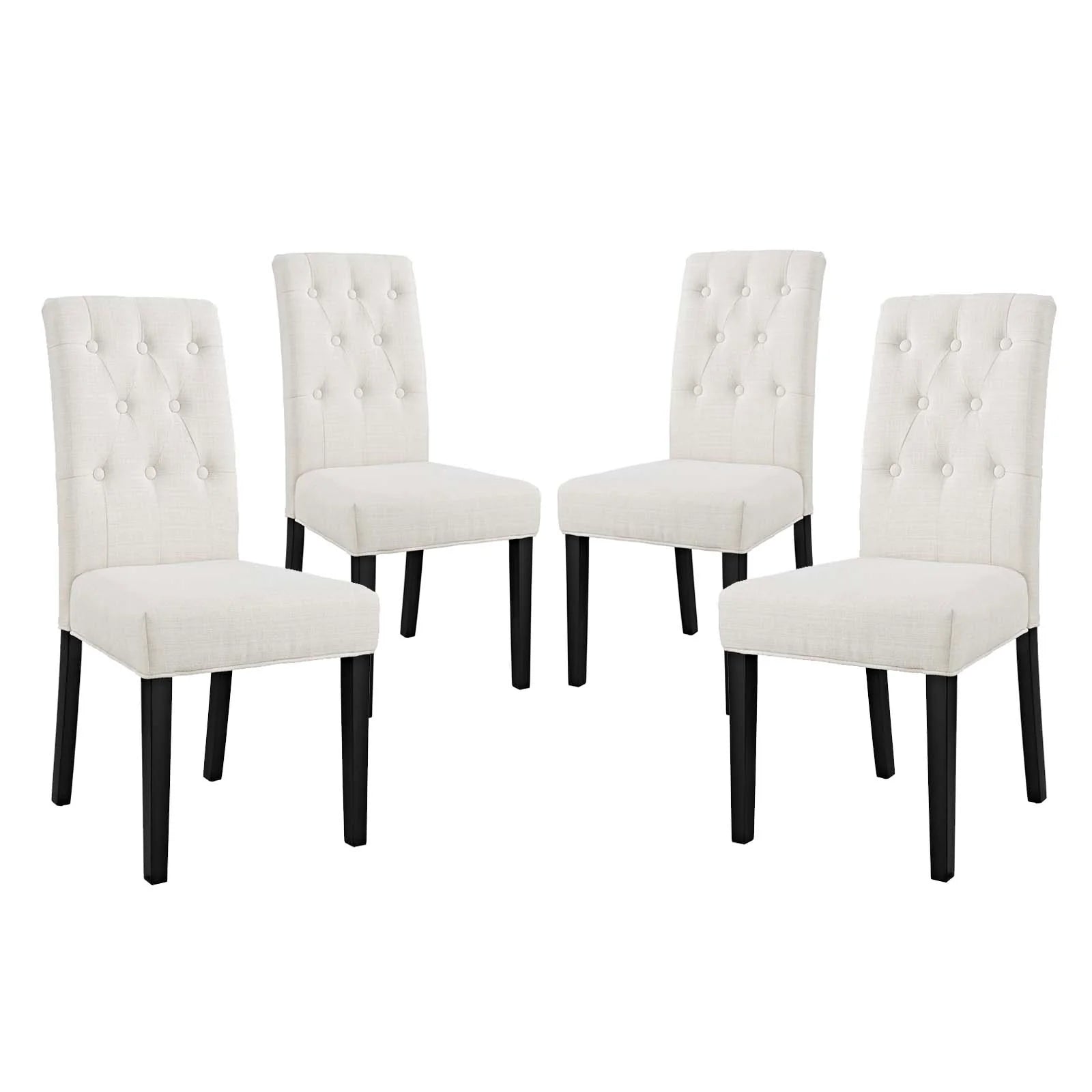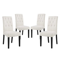 • Endow your dining room with vintage glamour style Confer Button Tufted Fabric Upholstered Dining Side Chair set. Confer Dining Accent Chair luxuriously combines dense foam padding with soft and durable fabric upholstery for a singular piece of comfortable elegance. Fashioned with eight tufted buttons and supported by a solidly constructed wood frame and stained hardwood legs, Confer Fabric Upholstered Dining Side Chair is a richly designed piece that blankets your dining experience in a layer of magnificence.