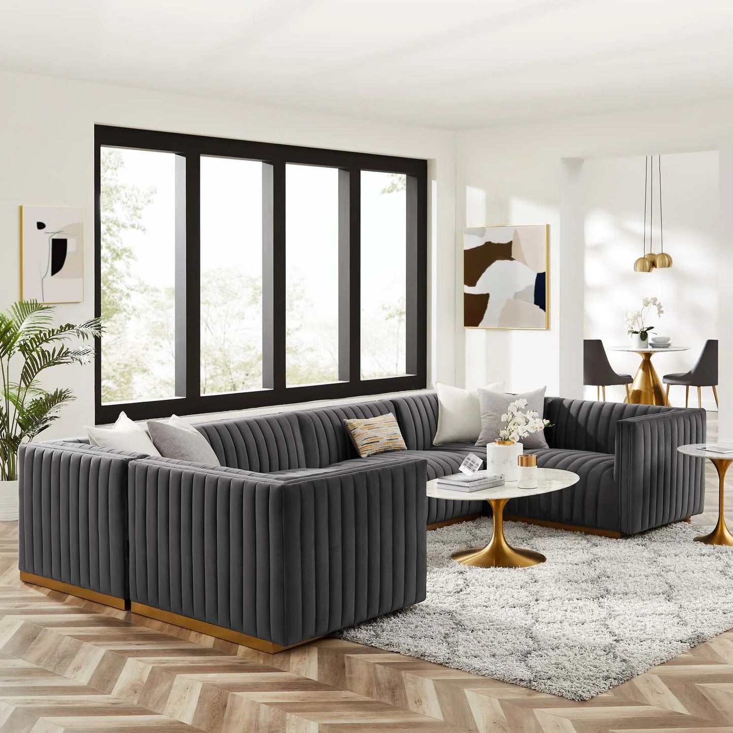 • Modern appeal surrounds the Conjure Channel Tufted Performance Velvet Upholstered 6-Piece U-Shaped Sectional Sofa. Luxuriously soft, stain-resistant performance velvet upholstery covers dense foam padding and an individually wrapped spring coil system for a supportive living room sofa that will become the go-to lounge spot for family and friends. Vertical channel tufting and subtle French piping adds depth to this vintage inspired sectional sofa that effortlessly becomes the focal point in your living room. Solidly constructed from wood and plywood, this sofa features non-marking foot caps and boasts a brushed gold stainless steel base. Versatile and elegant, this sectional sofa is ideally suited for a variety of decor styles in your living room, lounge, or home office. Each Seat Weight Capacity: 331 lbs.
