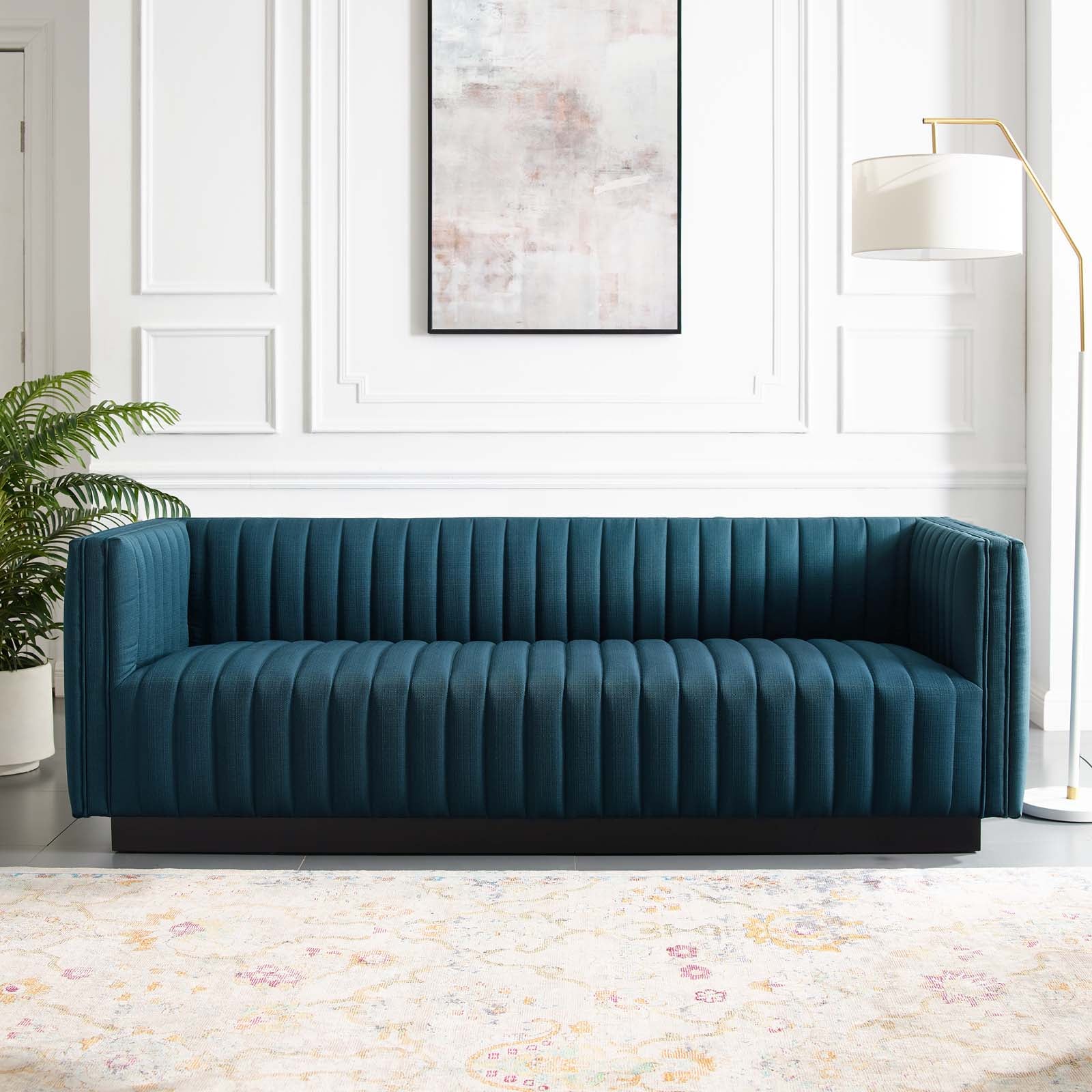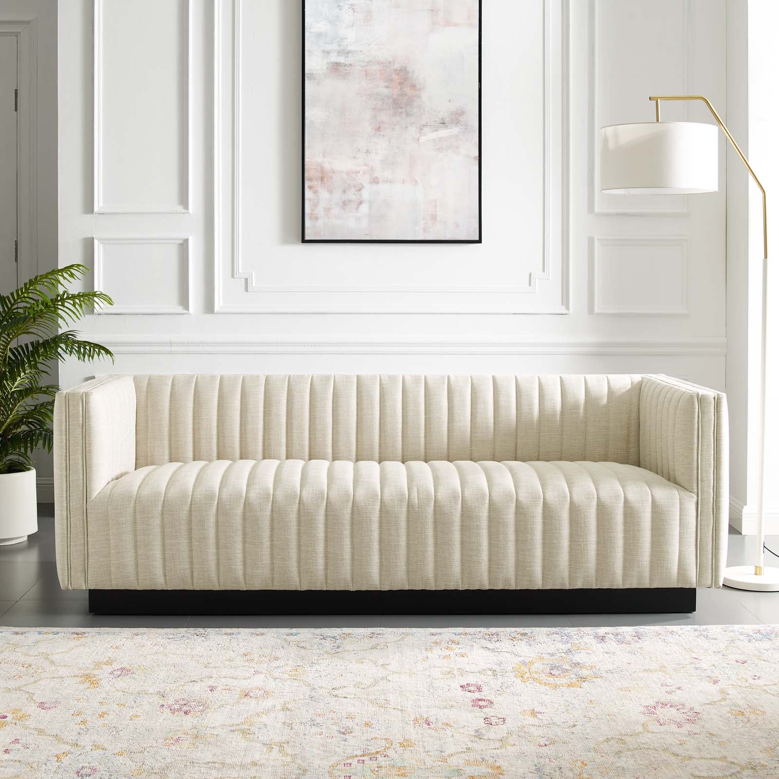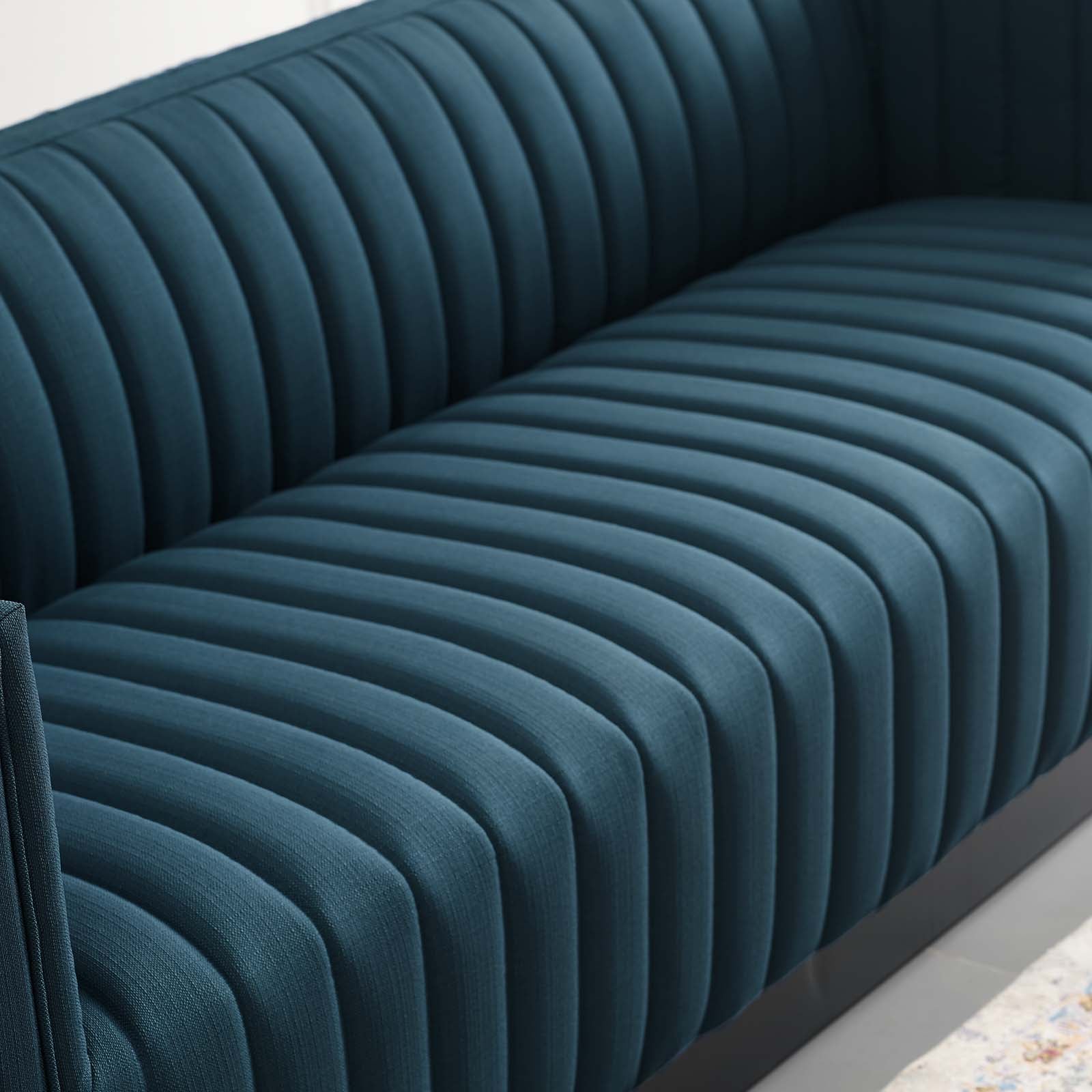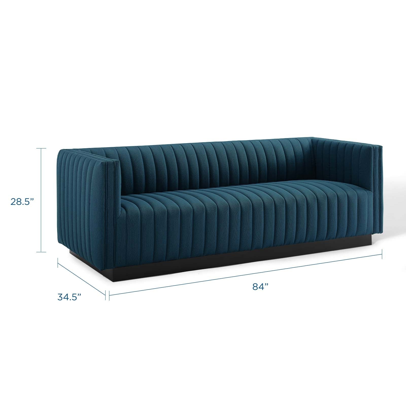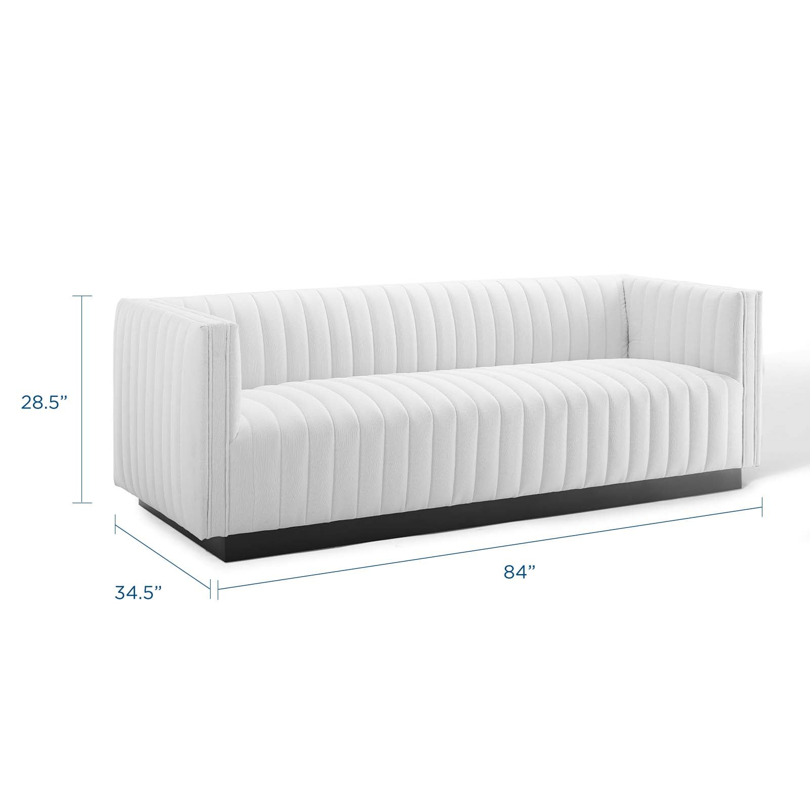 • Magnetic cachet follows the organic linear design of the Conjure Channel Tufted Fabric Upholstered Living Room Sofa. Relax into the glam deco style and allow the streamlined effect of the vertical channel tufting details to direct your living room decor. Conjure Sofa adds a charming retro modern style to your living room, lounge room, or home office. Individually wrapped spring coils are covered with dense foam padding and a soft polyester fabric upholstery for a premium seating experience. This elegant living room couch rests securely on a matte black wooden base that complements any modern home or apartment. Sofa Weight Capacity: 1323 lbs. Comes Fully Assembled.