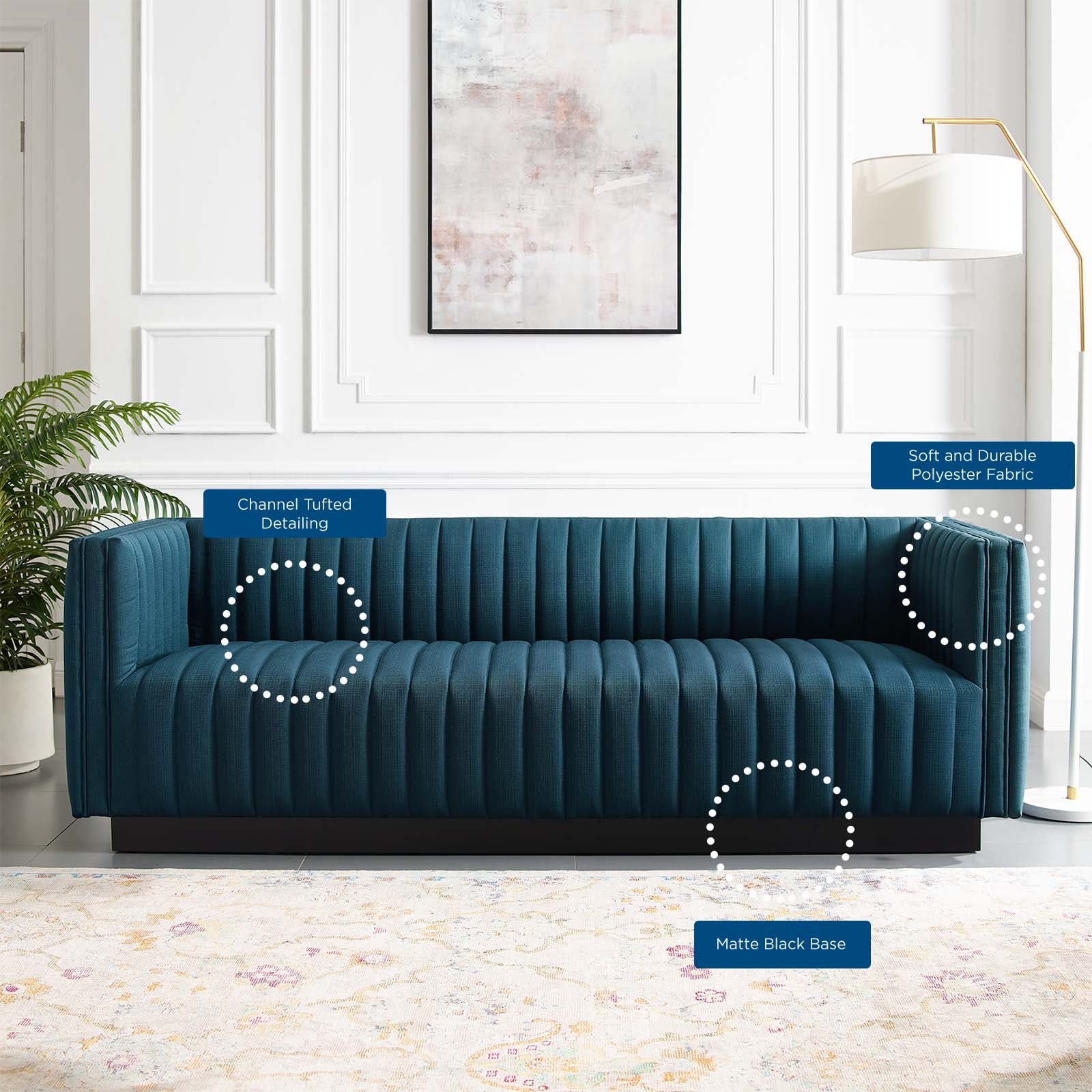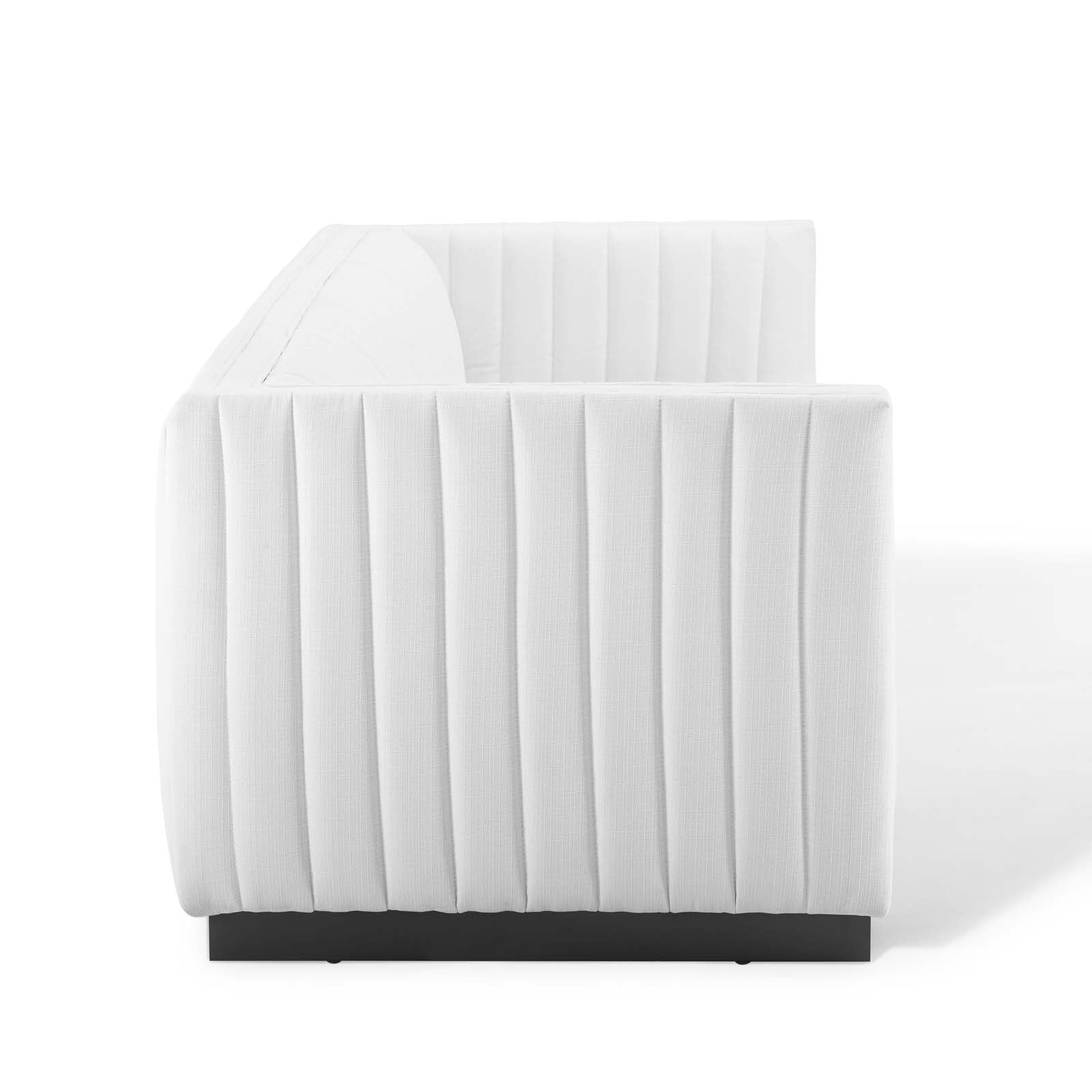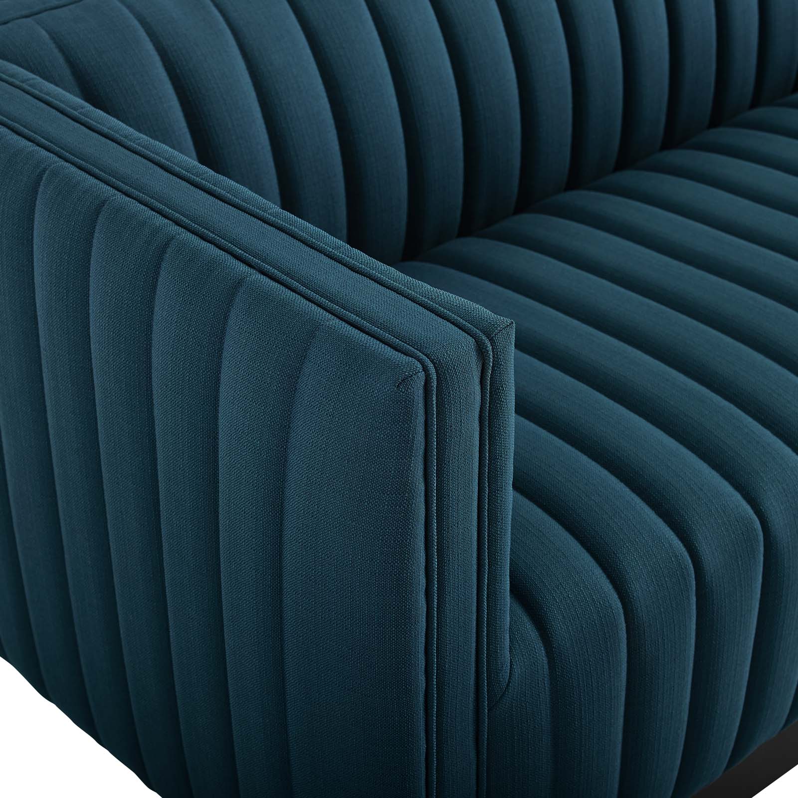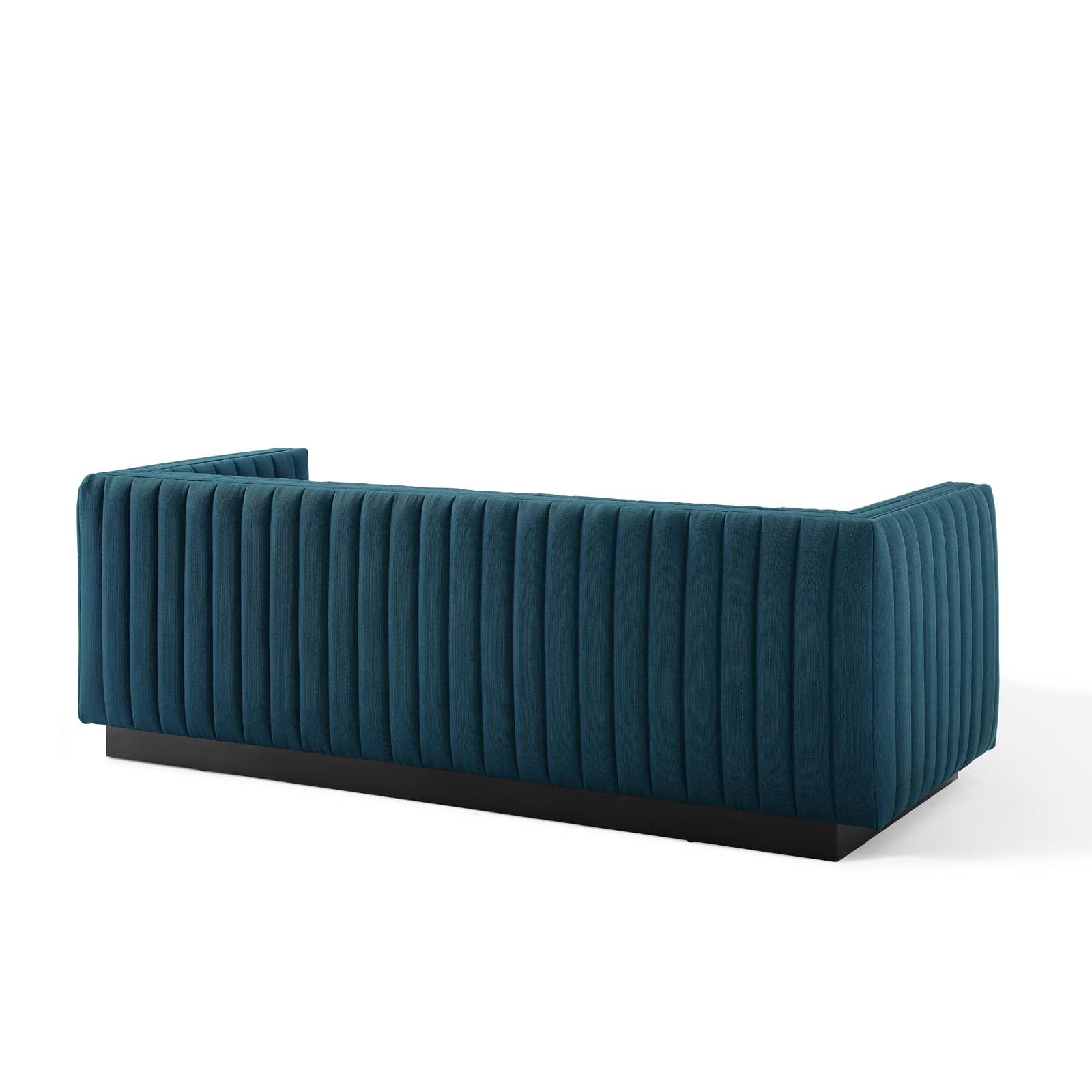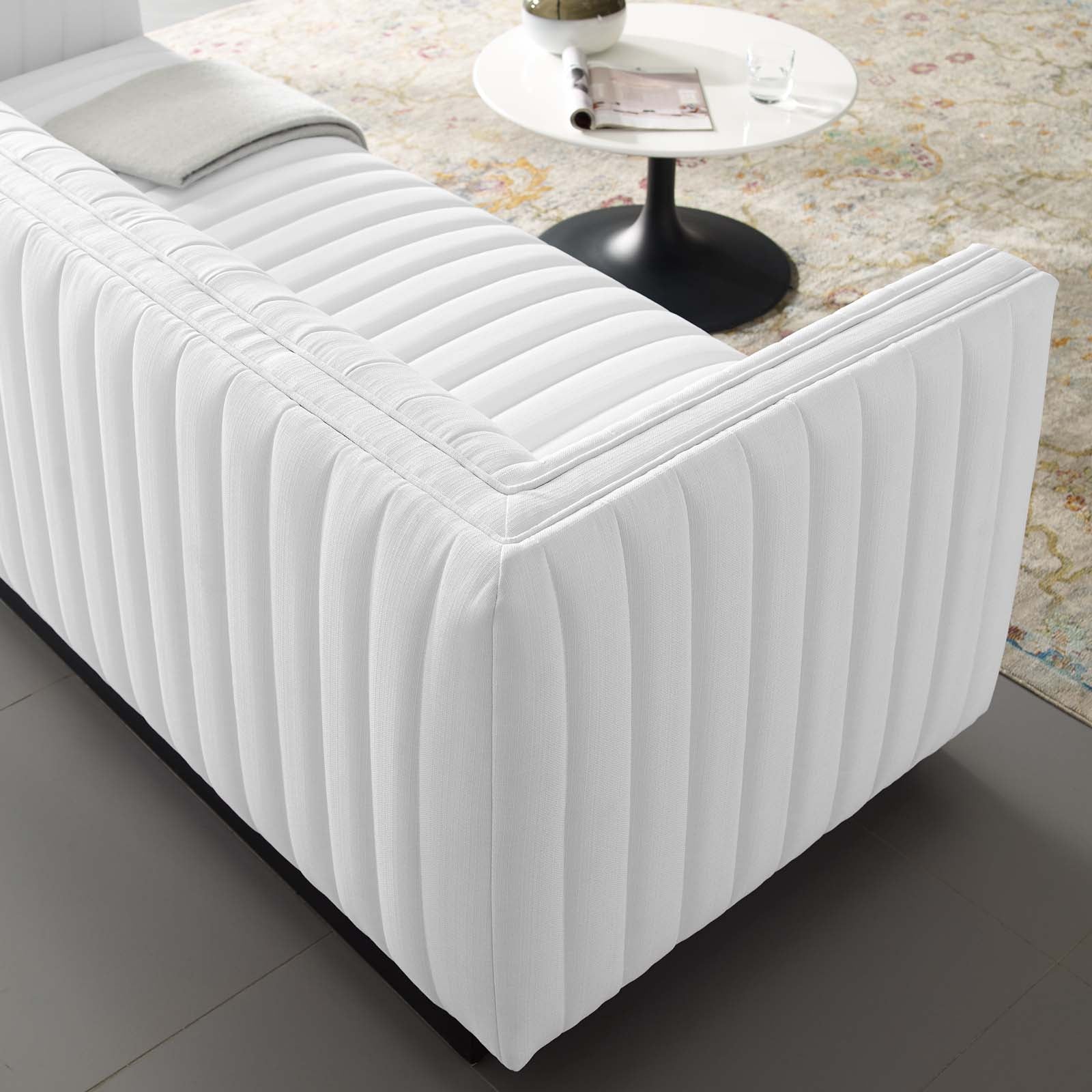 • Magnetic cachet follows the organic linear design of the Conjure Channel Tufted Fabric Upholstered Living Room Sofa. Relax into the glam deco style and allow the streamlined effect of the vertical channel tufting details to direct your living room decor. Conjure Sofa adds a charming retro modern style to your living room, lounge room, or home office. Individually wrapped spring coils are covered with dense foam padding and a soft polyester fabric upholstery for a premium seating experience. This elegant living room couch rests securely on a matte black wooden base that complements any modern home or apartment. Sofa Weight Capacity: 1323 lbs. Comes Fully Assembled.