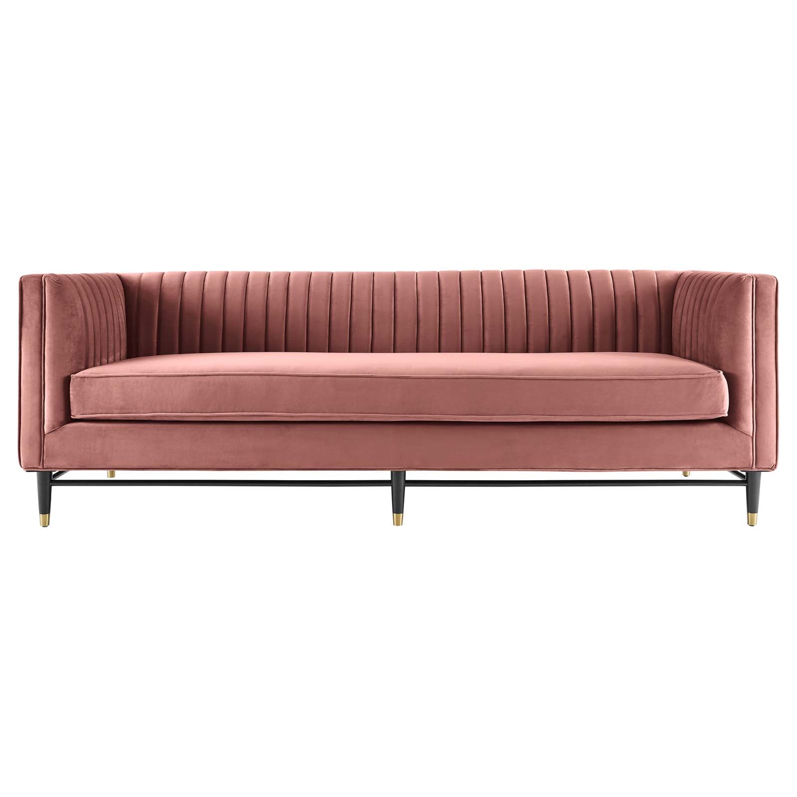 • Introduce the flowing lines of the Devote Channel Tufted Performance Velvet Sofa to your living room, bedroom, or office decor. Putting a retro twist on classic tufting, this sofa is enriched with vertical channel tufting that adds visual depth and glam deco style to any space. This living room sofa is upholstered in stain-resistant performance velvet and padded in dense foam for a premium seating experience. Durably crafted, this sofa rests atop black rubberwood legs with gold stainless steel sleeves that add subtle interest. Includes non-marking foot caps. Assembly required. Sofa Weight Capacity: 1322 lbs.