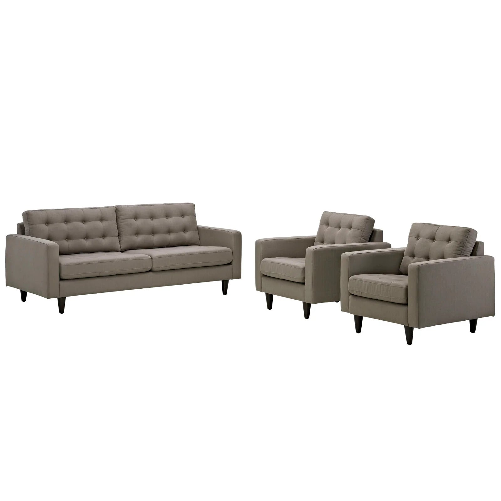 • End the rule of unjust sovereignties that wage a useless war for your interiors. Empress leaves the would-be heiress of holistic furnishings in the dust with a design that rivals any competitor. Empress is heralded with deeply tufted buttons, plush cushions, and armrests that convey that perfect air of nobility. The solid wood legs come with plastic glides to prevent floor scratching, and the fine fabric upholstery leaves the recipients feeling richly rewarded.