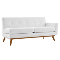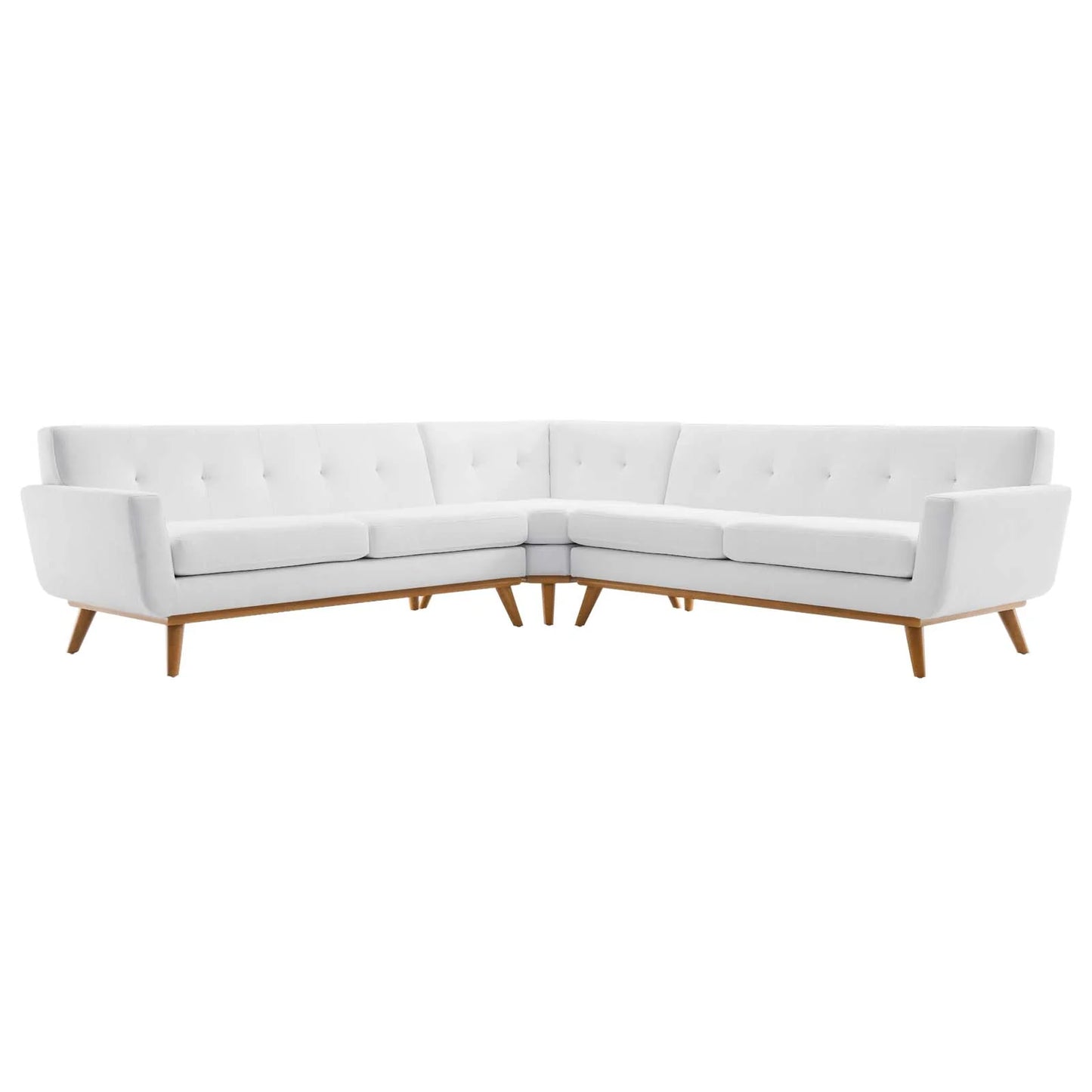• Gently sloping curves and large dual cushions create a favorite lounging spot. Whether relaxing after a long day at work, settling in with coffee and brunch, or entering a spirited discussion with friends, the Engage Sectional Sofa is a welcome presence in your home. Buttons create eye-catching appeal, adding depth that brings your sitting décor to center stage. Four rubberwood legs and frame supply a solid base to the comfortable upholstered material.