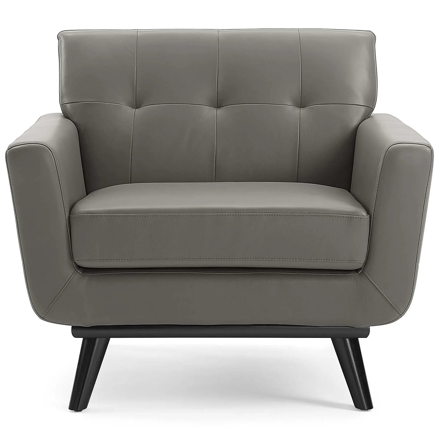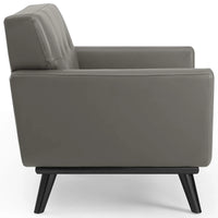 • Gently sloping curves and plush removable seat cushions create a favorite living room accent chair. Whether lounging in solitude or entering a spirited discussion with friends, the Engage mid-century modern top-grain leather upholstered living room lounge accent armchair is a welcome presence in your home. Three buttons create eye-catching appeal, adding depth to a sleek retro modern accent chair that brings your sitting décor to center stage. Four splayed wood legs and frame supply a solid base to the comfortable quality leather chair for your living room, lounge room, office or other seating area. Chair Weight Capacity: 441 lbs.