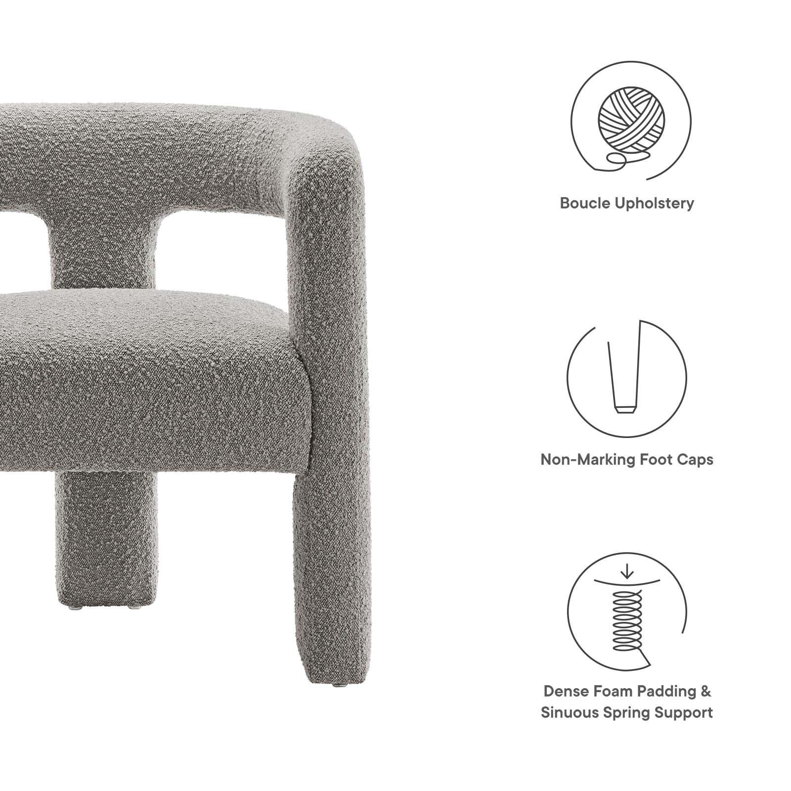 • Experience unmatched comfort and sleek modernity with the Kayla Boucle Armchair. Its progressive design and rounded open profile make a chic statement in any space. The boucle fabric adds a delightful touch with its charming nubby texture. Crafted with a sturdy wood frame, sinuous spring support, and dense foam padding, this accent chair offers premium comfort and durability. Non-marking foot glides protect your floors. Elevate your space with the Kayla Boucle Armchair€”where modern luxury meets everyday elegance. Weight Capacity: 330 lbs.