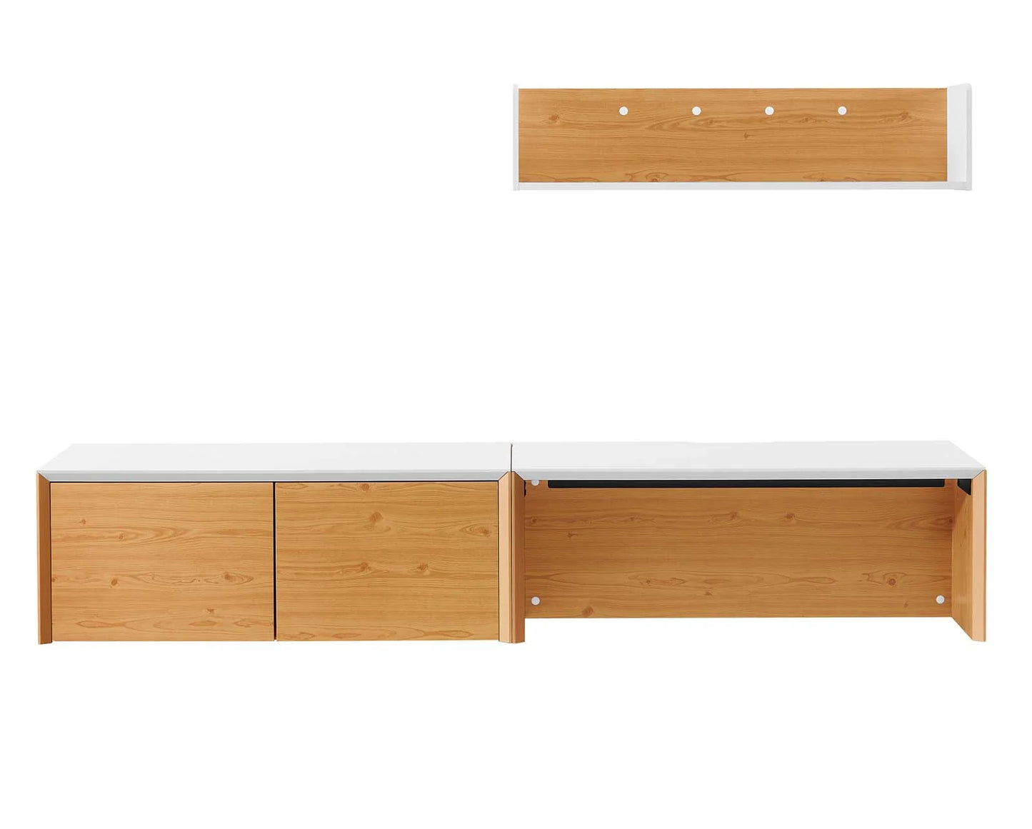 • A perfect workspace for the home office, college dorm, bedroom, living room, or any other work area, the 3-Piece Kinetic Wall-Mount Office Furniture Set introduces style and function to the modern home or apartment. Crafted from durable, lightweight particleboard with a complementing melamine top, this office desk features a spacious work area and flip-up cable management compartment to keep things neat and organized while the wall-mount storage cabinet is complete with magnetic-close doors to conceal its shelved storage area. With an organic wood grain design, this wall-mount office desk, storage cabinet, and accent shelf brings natural elegance to any space and mounts directly to the wall to save valuable floor space. Assembly required.