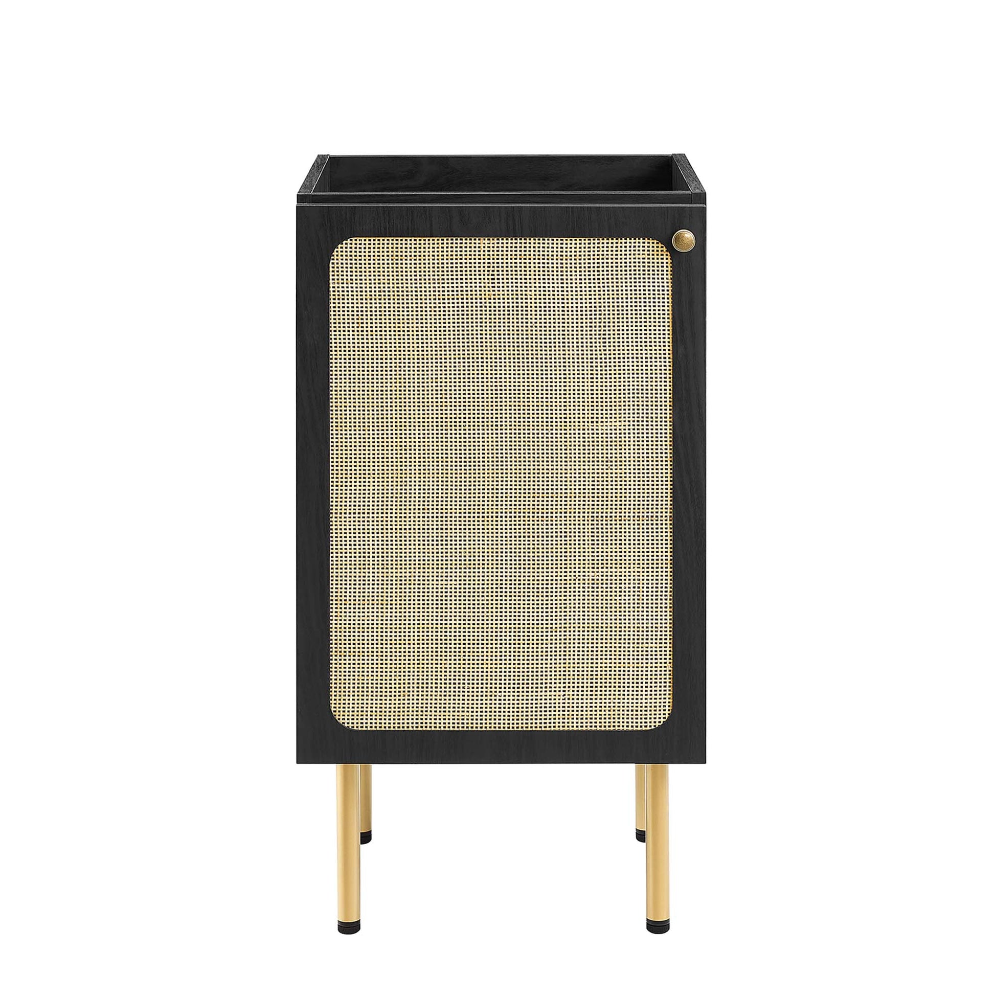 Refresh your washroom with the textured detail of the Chaucer 18" Bathroom Vanity Cabinet. Featuring beautiful rattan weaving on its door, this vanity cabinet instantly updates any bathroom or powder room. A spacious adjustable top shelf and a fixed bottom shelf hidden behind its hinged door offer ample storage space for toiletries, towels, and other bathroom essentials. Enriched by a stylish round metal cabinet knob and resting on sleek legs with adjustable feet for added stability, this bathroom cabinet is durably crafted with MDF, particleboard, and wood grain laminate to bring natural organic aesthetics to your decor. Assembly required. Fixtures and sink basin not included. Top Shelf Weight Capacity: 33 lbs. Bottom Shelf Weight Capacity: 66 lbs.