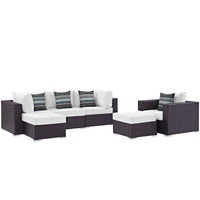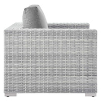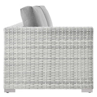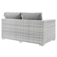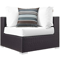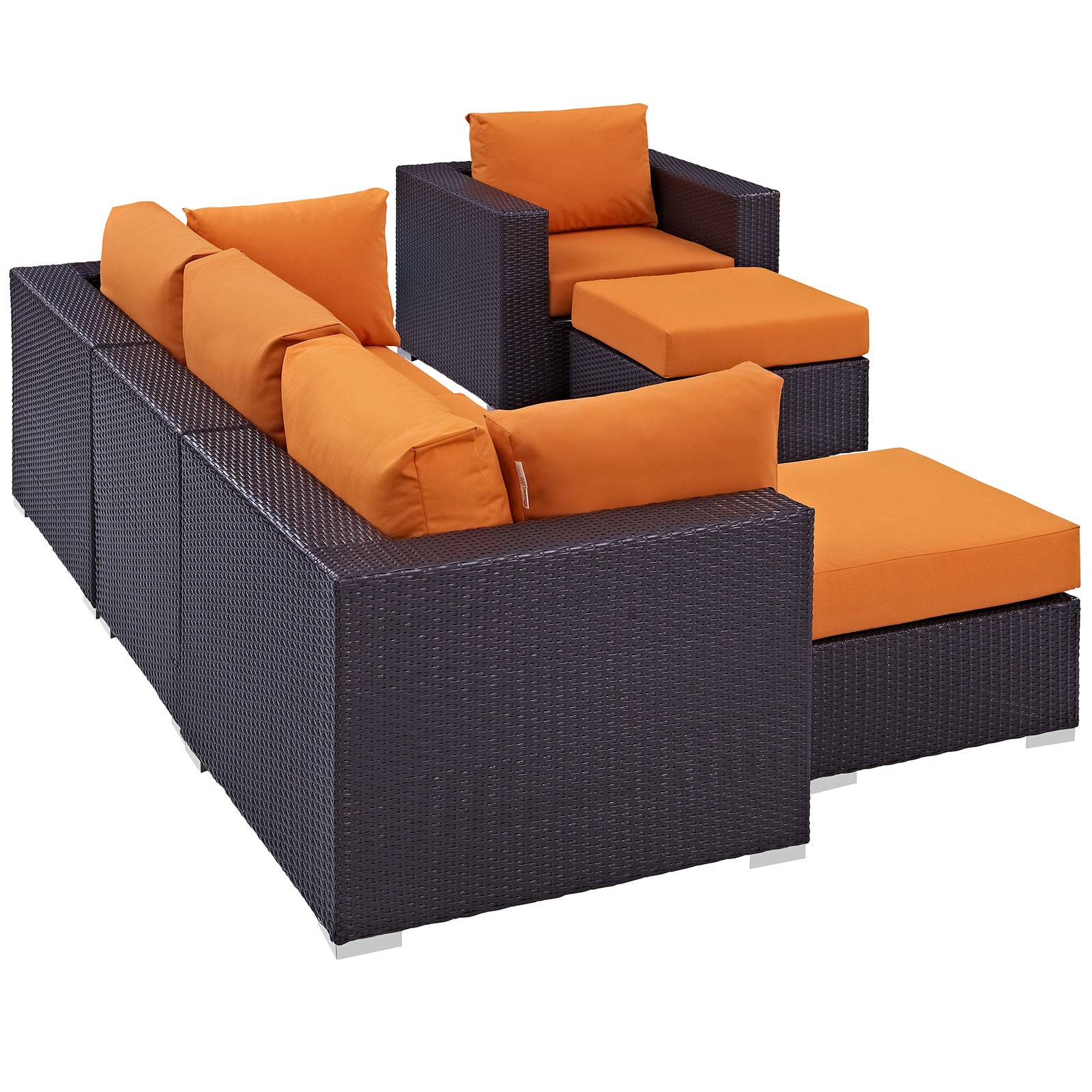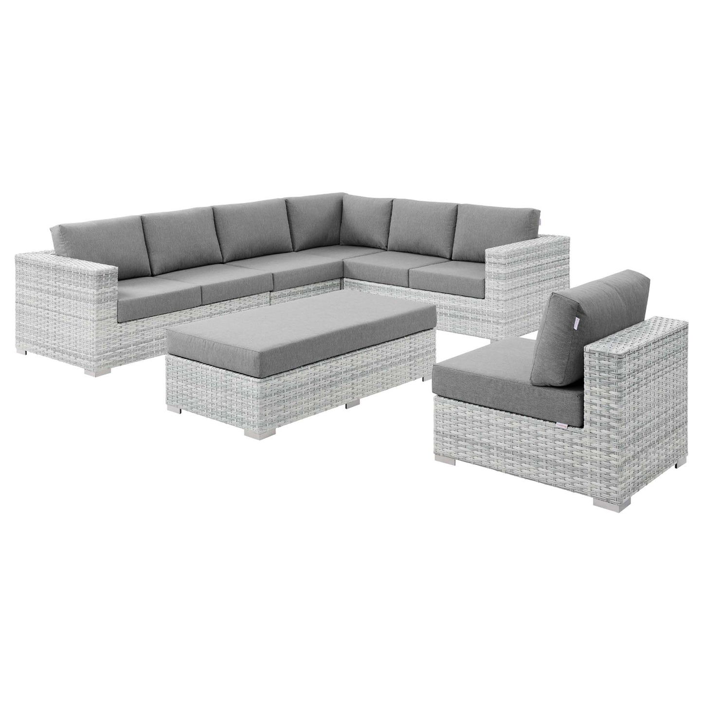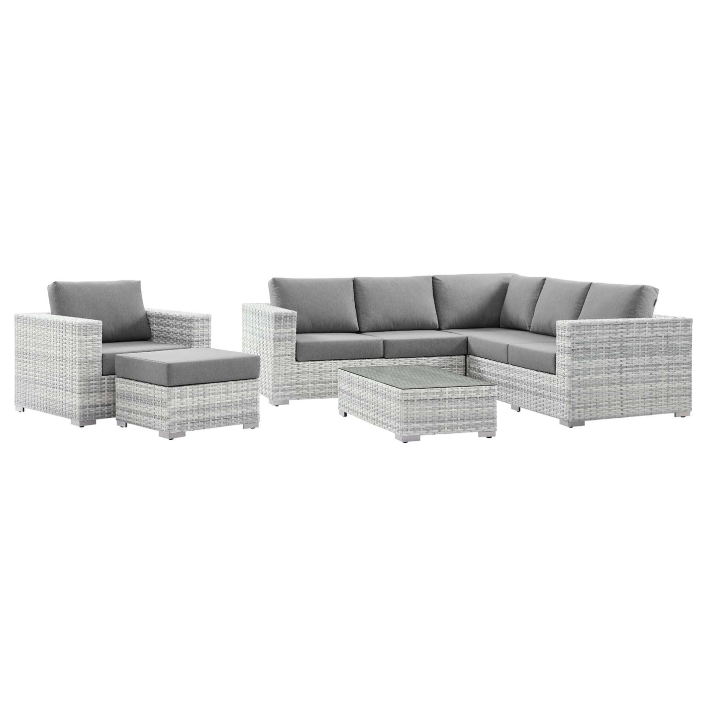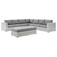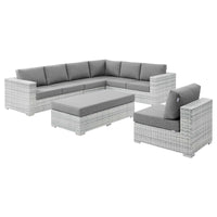 Gather stages of sensitivity with the Convene Outdoor Sectional series. Made with a synthetic rattan weave and a powder-coated aluminum frame, Convene is a versatile outdoor furniture set that shifts and combines according to the spontaneous needs of the moment. Outfitted with all-weather fabric cushions, leave a positive impression on friends and family while enhancing your patio, backyard, or poolside repast in this series of palpable distinction. This installment of the series is an Outdoor Patio Sectional Sofa Set.