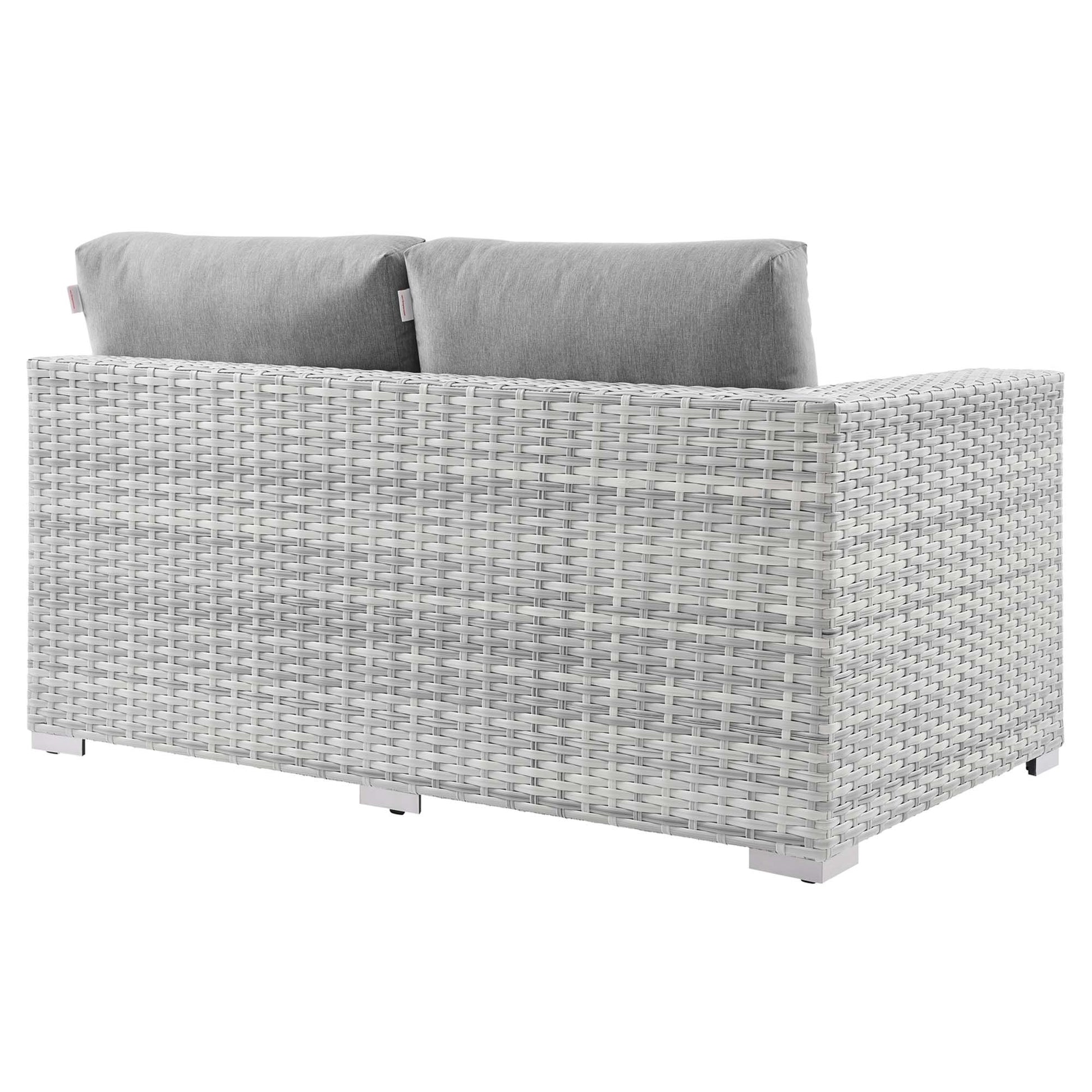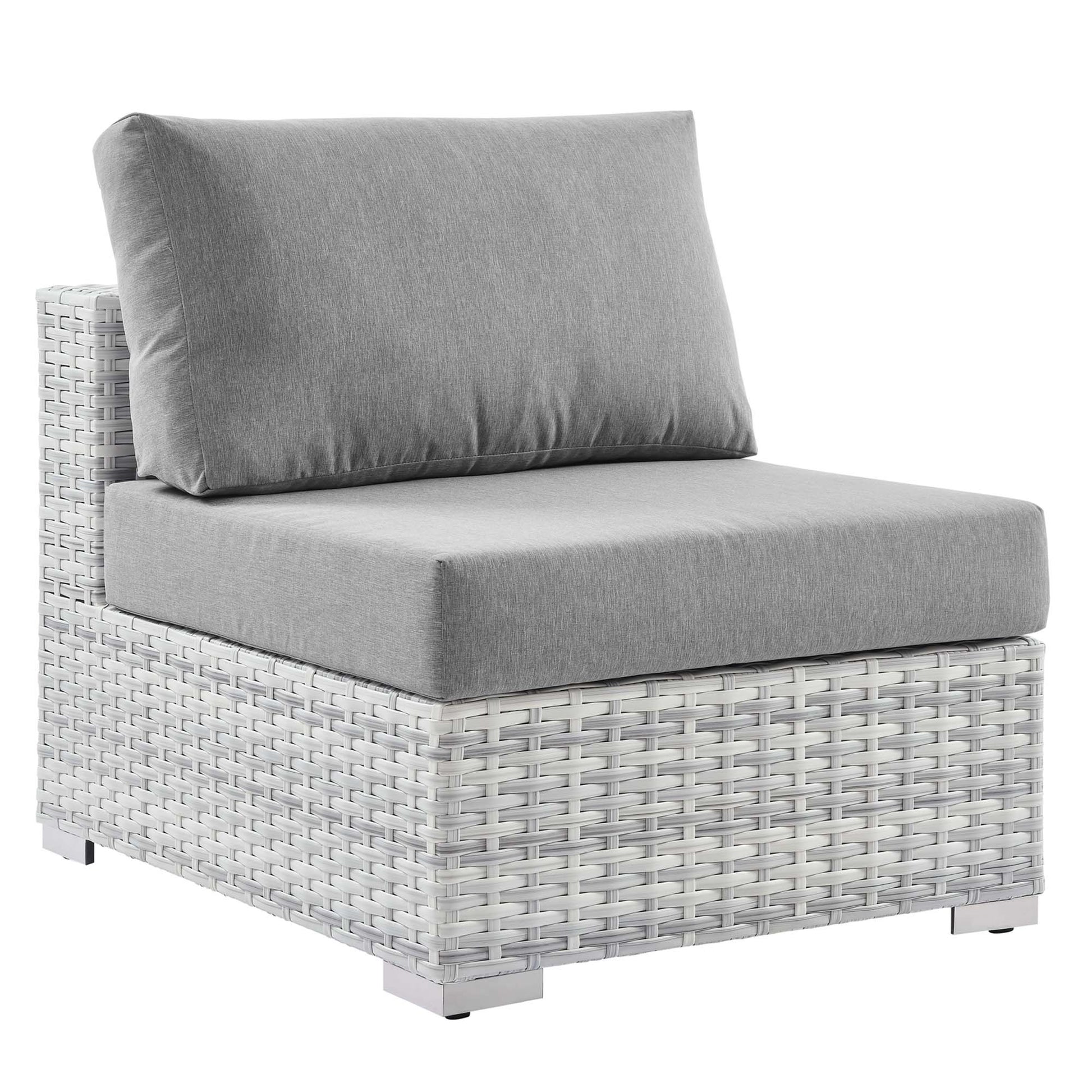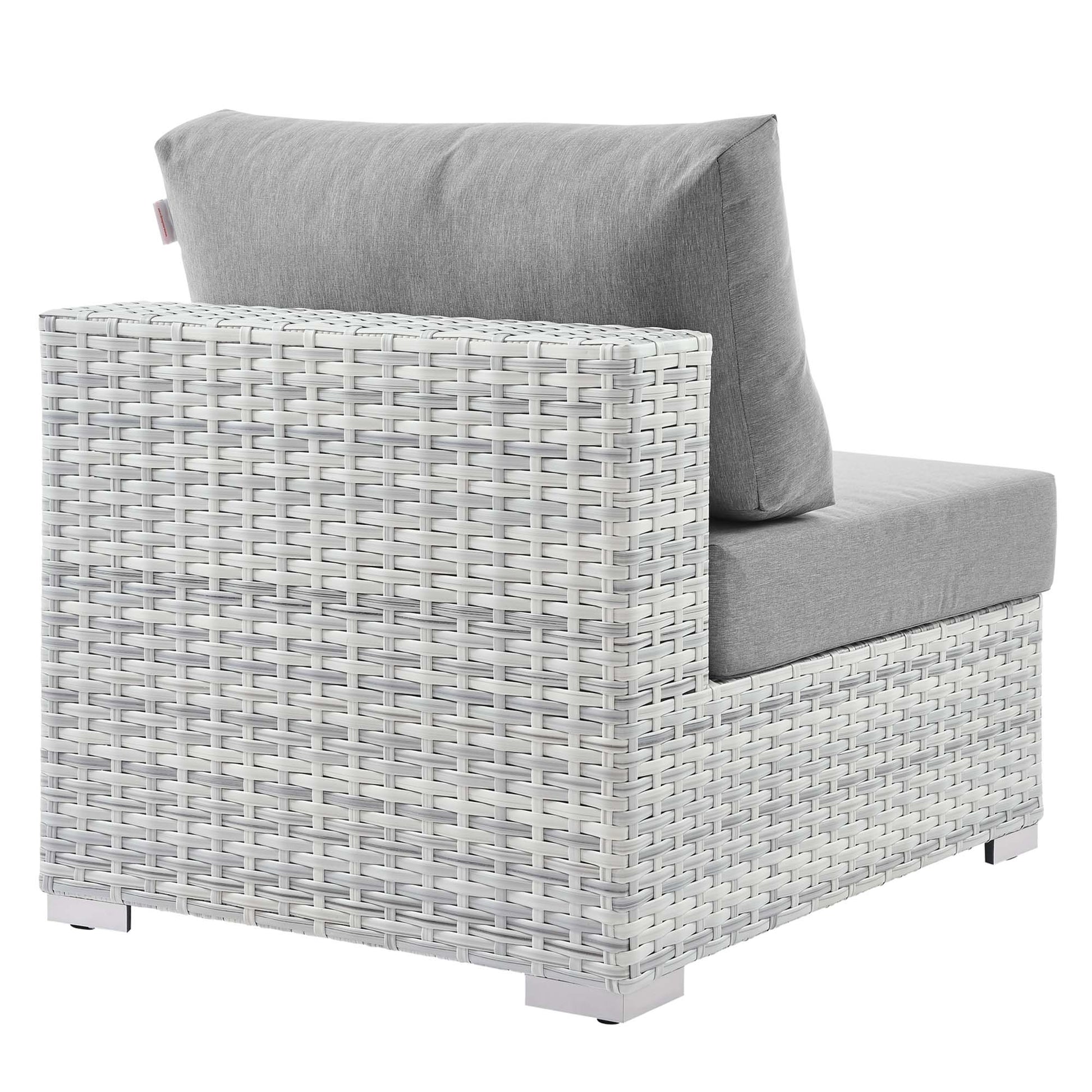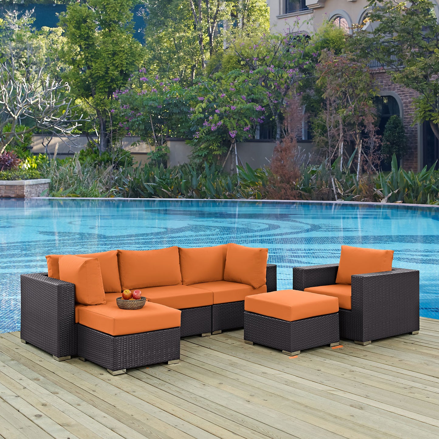 Gather stages of sensitivity with the Convene Outdoor Sectional series. Made with a synthetic rattan weave and a powder-coated aluminum frame, Convene is a versatile outdoor furniture set that shifts and combines according to the spontaneous needs of the moment. Outfitted with all-weather fabric cushions, leave a positive impression on friends and family while enhancing your patio, backyard, or poolside repast in this series of palpable distinction. This installment of the series is an Outdoor Patio Sectional Sofa Set.