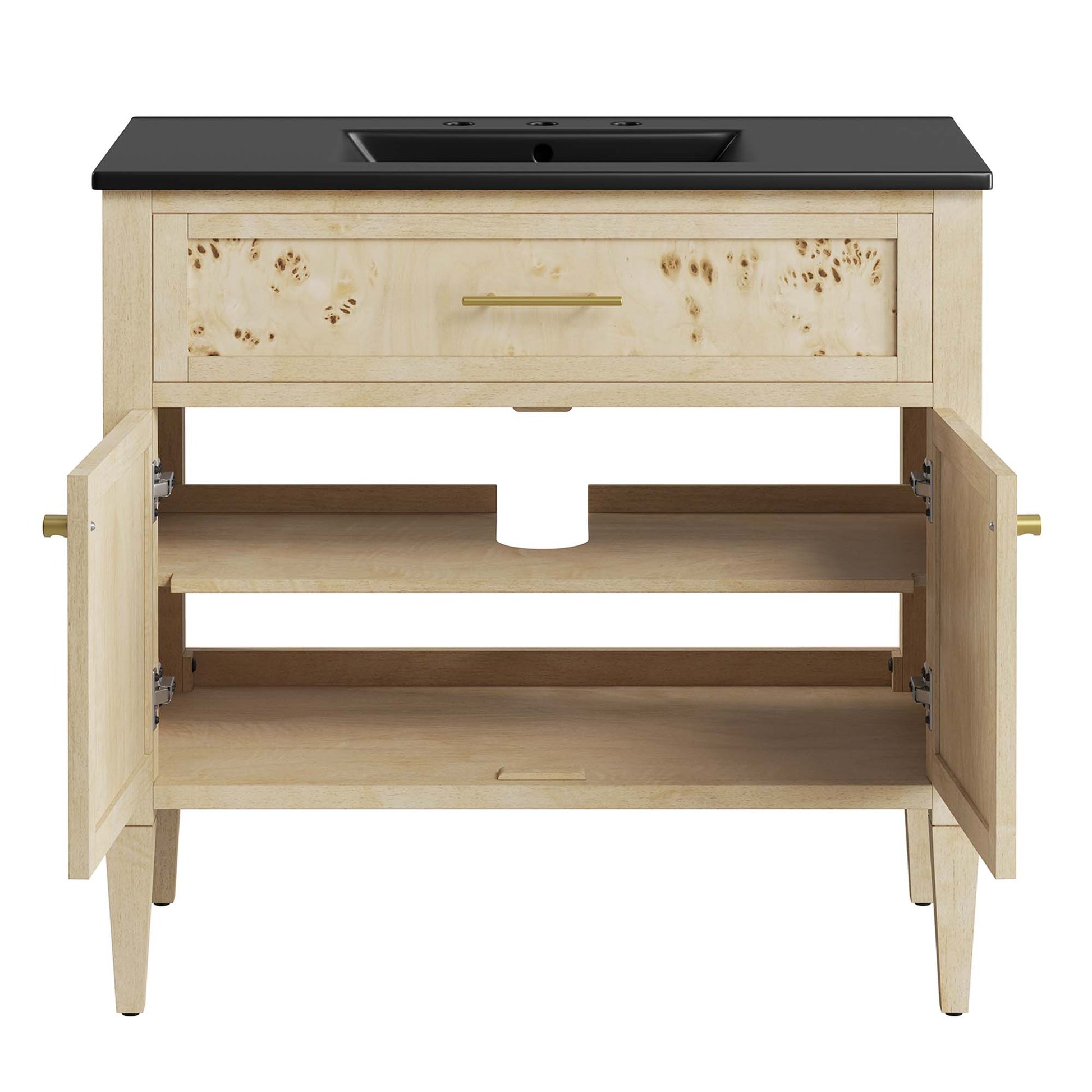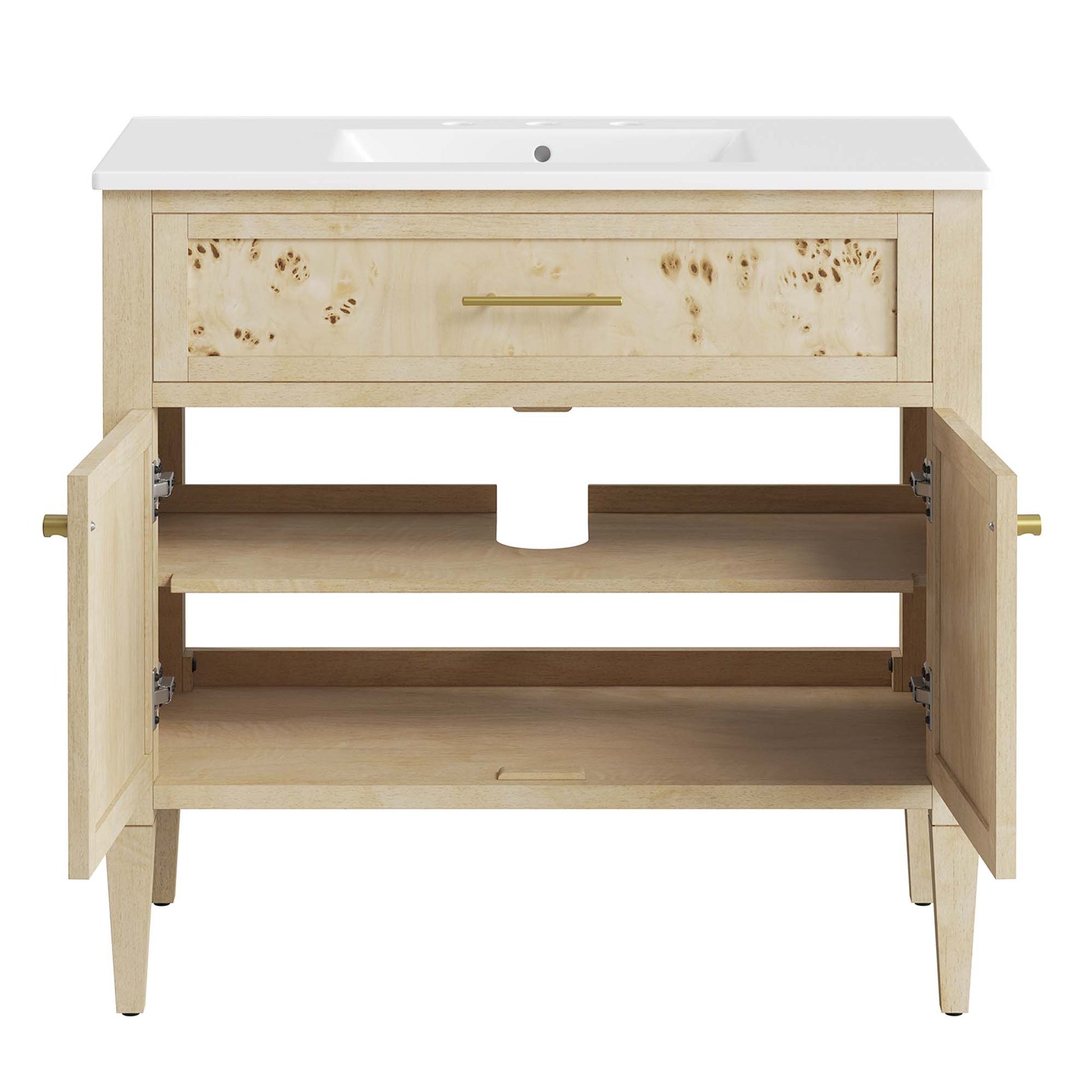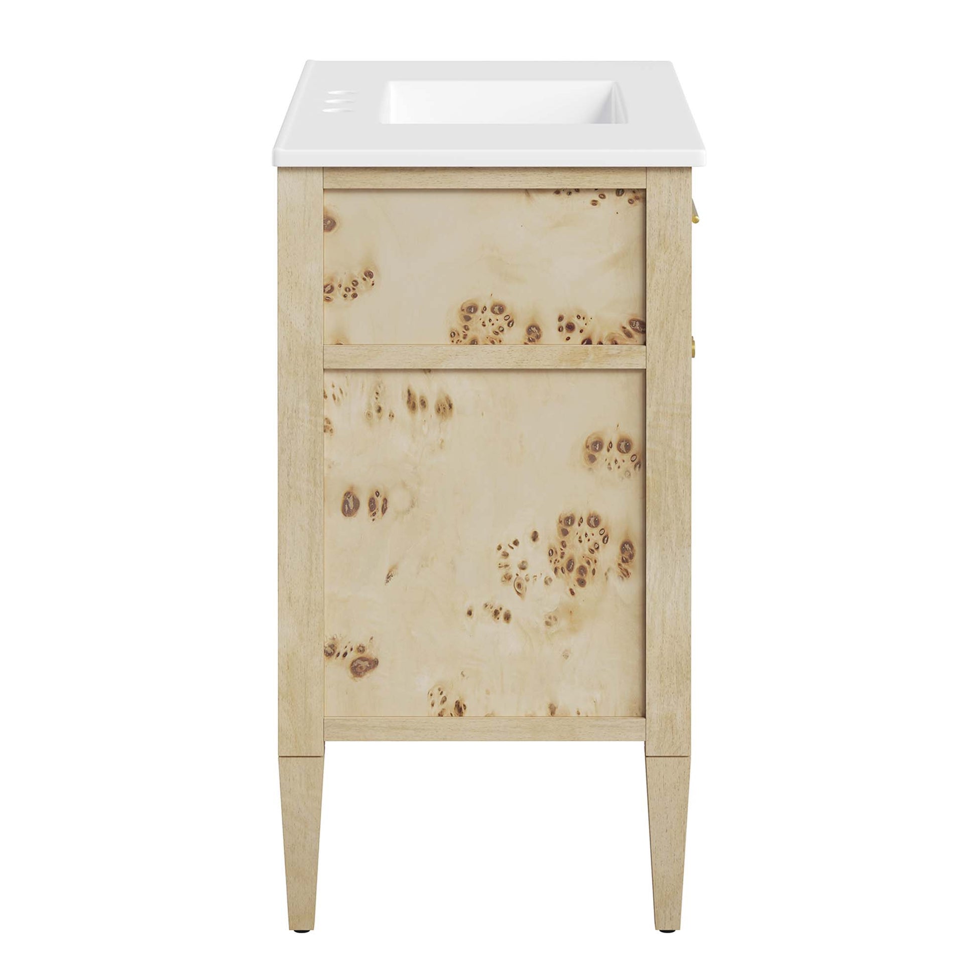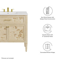 Discover the epitome of organic aesthetics and practicality with the Elysian 36" Burl Wood Bathroom Vanity. Each vanity cabinet is uniquely crafted from exquisite mango wood, further adorned with a rich burl wood veneer, radiating a distinctive charm and character. This bathroom vanity's centerpiece is an elegant ceramic sink basin, thoughtfully designed with an integrated countertop and 8" centerset holes ready for your choice of fixtures (not included). A fixed top drawer and tapered wood legs add to the sleek design, while the spacious shelving beneath–complete with a convenient plumbing cutout–offers ample storage space for all your bathroom essentials. While assembly is required, this vanity includes easy-to-follow assembly instructions.