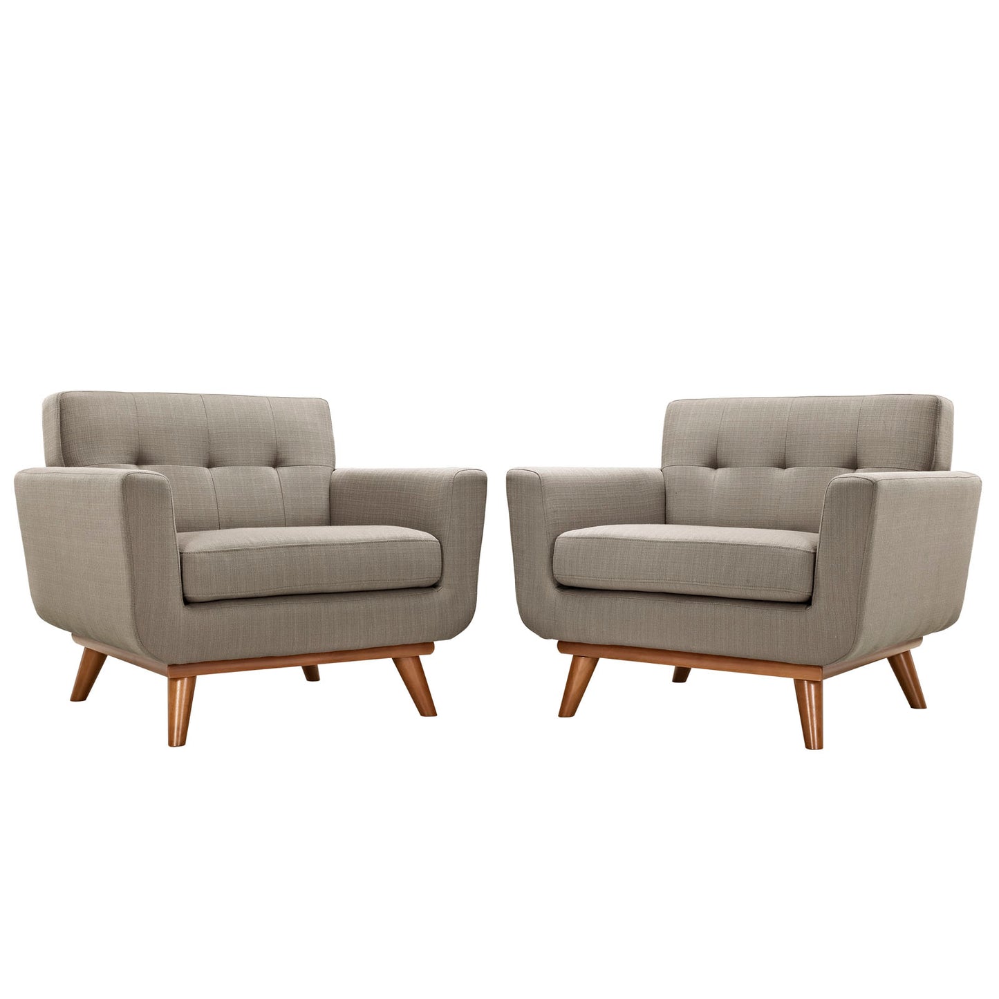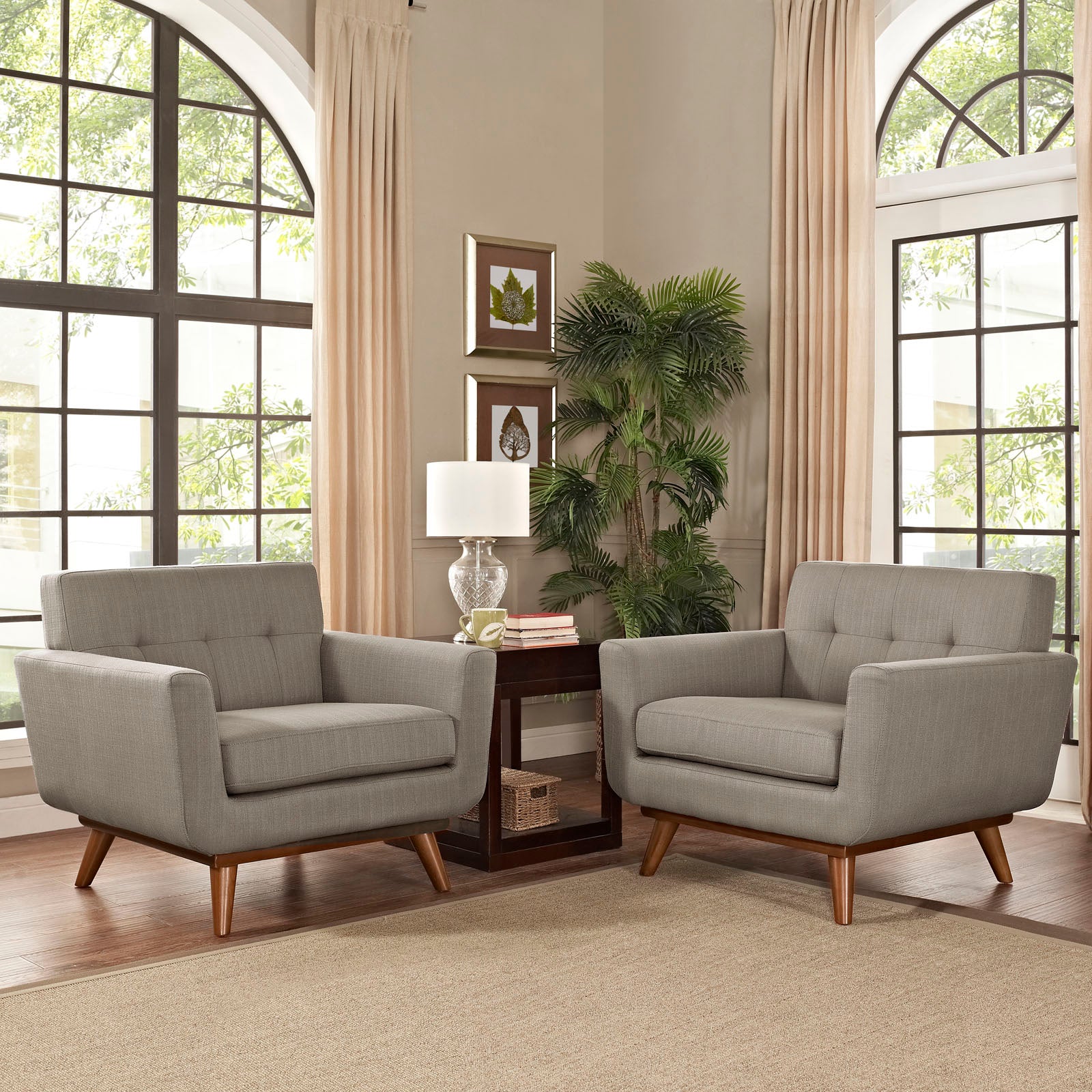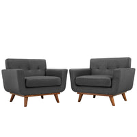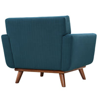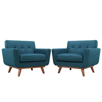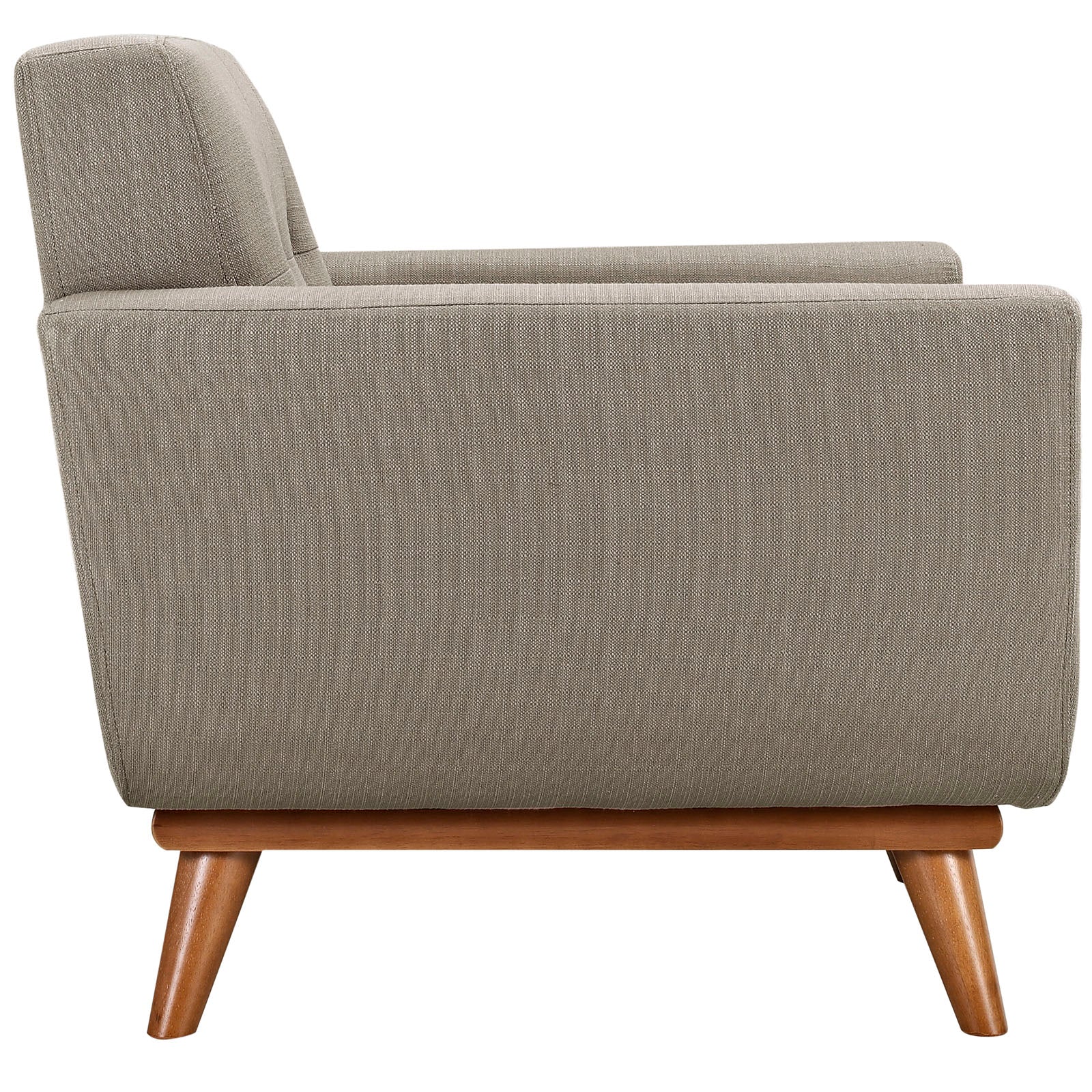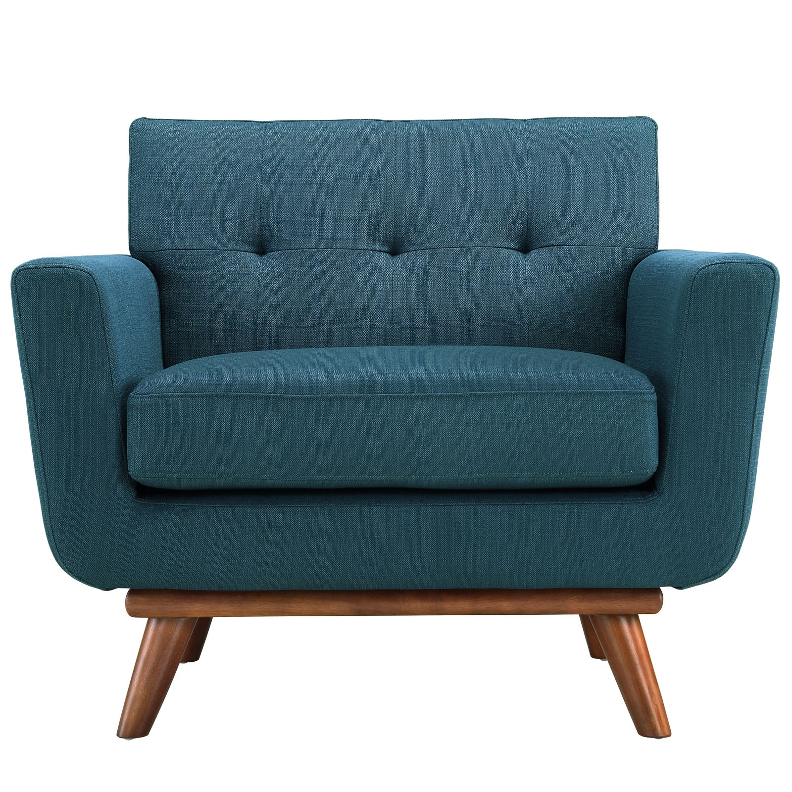 Gently sloping curves and large dual cushions create a favorite lounging spot. Whether plopping down after a long day at work, settling in with coffee and brunch, or entering a spirited discussion with friends, the Engage armchair is a welcome presence in your home. Seven tufted buttons create eye-catching appeal, adding depth that brings your sitting décor to center stage. Four cherry color rubberwood legs and frame supply a solid base to the comfortable upholstered material.