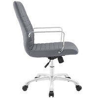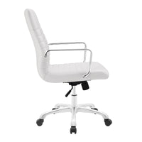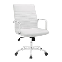 Sweet precision and simple details go into making Finesse a pleasantly rewarding office chair. Designed with a delicately ribbed vinyl cushioned mid back and waterfall seat, Finesse delivers a touch of everything that matters. Equipped with chrome steel armrests, and a polished aluminum base with five dual-wheel black nylon casters, easily glide over carpeted surfaces in style. Finesse also comes with a height adjustable pneumatic lever and tension knob to control the chair’s backward tilt.
