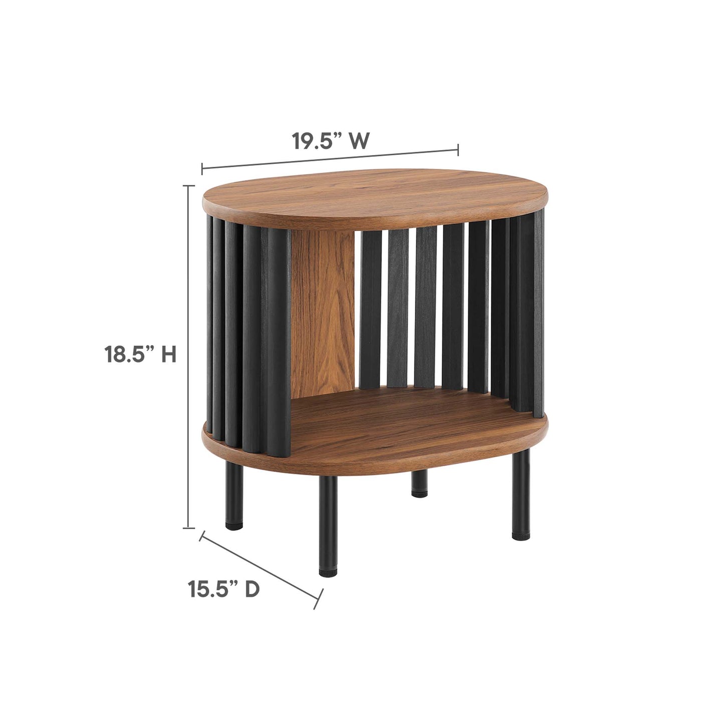 Add contemporary style to your home with the Fortitude Side Table. Its captivating oval shape, timber style strip design, straight round black metal legs, and open storage area make it a versatile addition to any room. Fortitude is perfect as a side table in your living room or as a nightstand in your bedroom. Made from MDF and particleboard with a wood grain finish, this side table features an easy-to-clean surface. With a top weight capacity of 200 lbs, it can hold your essentials with ease. Includes non-marking foot caps. Assembly required.