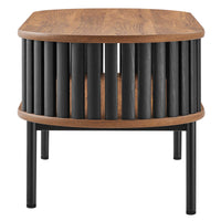 The Fortitude Coffee Table brings modern style to your living room. Its sleek oval shape and open timber style strip design create a spacious feel, while the round metal legs add an industrial touch. Made from MDF and particleboard with a wood grain finish, this coffee table is both sturdy and stylish. Perfect for holding drinks, magazines, or decorative items, this coffee table is an ideal addition to your living room, office, lounge, or other seating area. Includes non-marking foot caps. Assembly required.