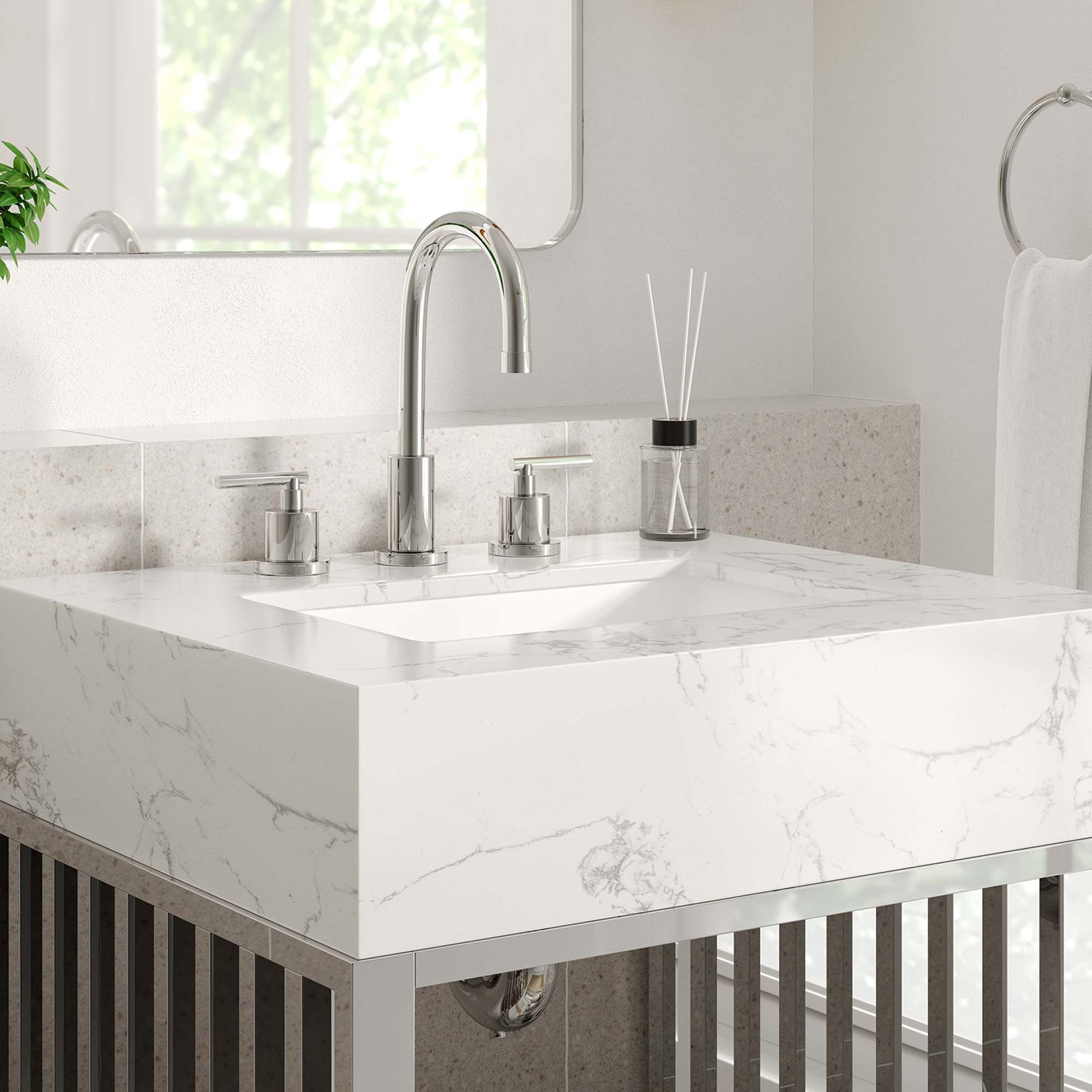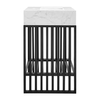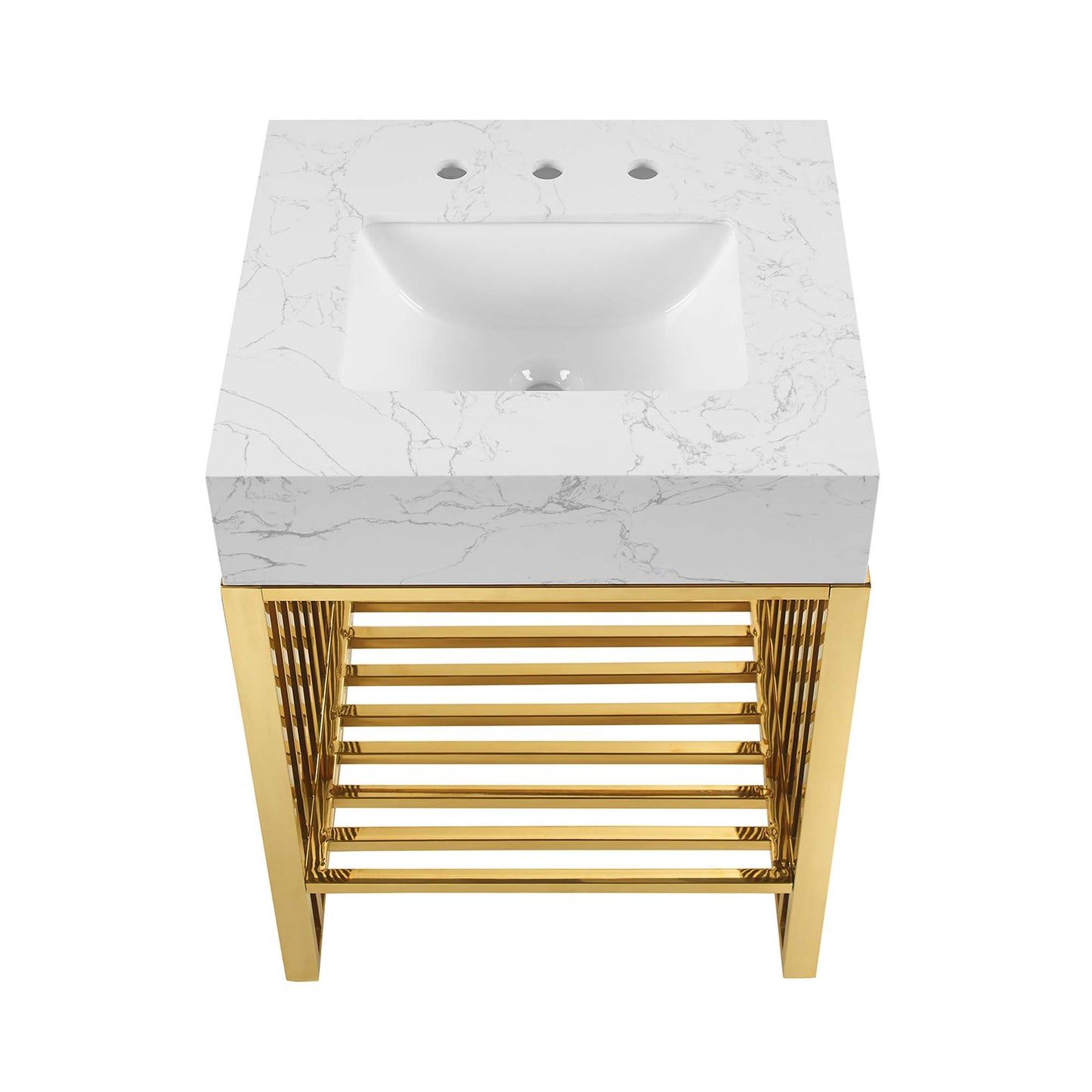 Introduce stark modernity to your bathroom space with the straight lines, polished detail, and angular profile of the Gridiron 24" Bathroom Vanity. Crafted with durable stainless steel, this open-concept vanity offers ample storage space underneath for towels, bathroom essentials, and more. This bathroom vanity features an artificial marble sink with an integrated countertop and 8" centerset faucet holes. A striking addition to the bathroom, this sink vanity rests on adjustable non-marking foot pads to protect flooring. Assembly required. Sink fixtures not included.