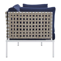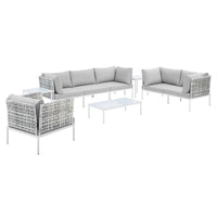 Engage life with Harmony. Enjoy casual conversation under the open sky with an all-weather waterproof furniture set that delivers an exceptional outdoor porch, patio, balcony or garden experience. An exceptional modern furniture set that exceeds expectations, Harmony comes with long-lasting machine washable Sunbrella® fabric cushions, synthetic rattan basket weave, square powder coated aluminum bases, tempered glass top tables, and non-marking foot caps. A sectional that arranges according to the spontaneous needs of your guests, set your sights on open and inspired moments with the Harmony Outdoor Patio Collection. Set Includes: 1 Loveseat, 1 Armchair, 2 Corner Chairs, 1 Armless Chair, 2 Side Tables, 1 Coffee Table