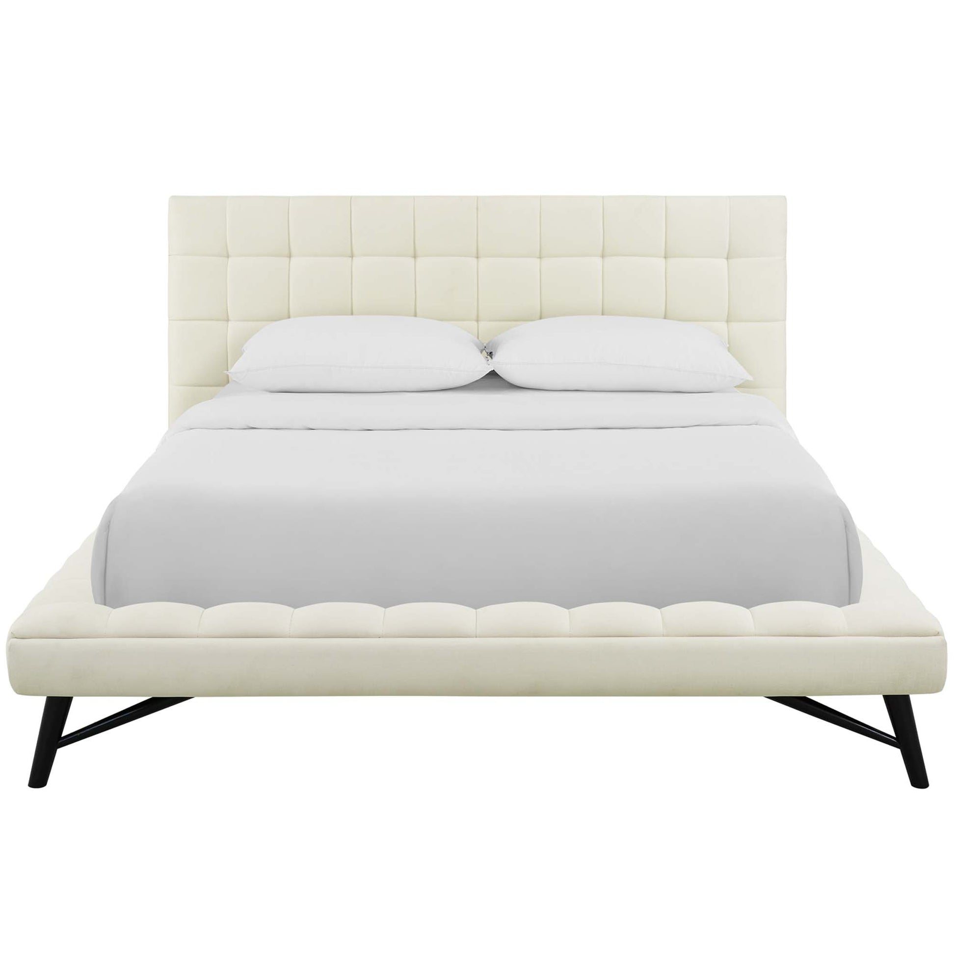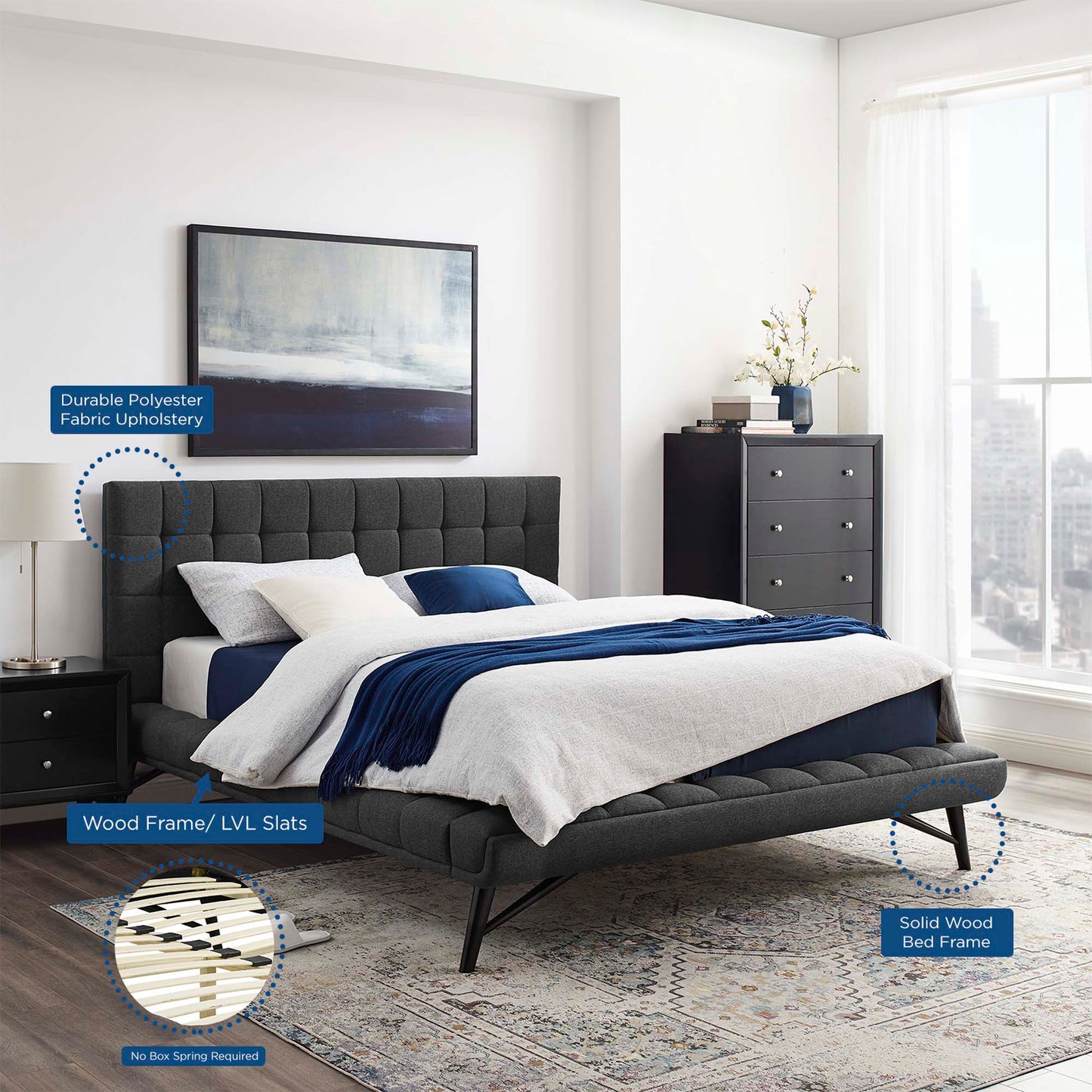 Anchor your bedroom with the charm and sophistication of the Julia Queen Platform Bed. Julia's sturdy, low-profile plywood frame sits atop four splayed and tapered wood legs for an open expanse of restful luxury. Mid-century elegance sweeps into your master suite or guest room decor with Julia's biscuit tufting and polyester fabric upholstery that spans both headboard and frame. Julia's soft and durable fabric upholstery covers dense foam padding creating the perfect recline for resting, conversing or reading in bed. Julia comes with a wood slat support system that eliminates the need for a box spring and accommodates memory foam, spring, latex, and hybrid mattresses. This sturdy queen bed frame with a queen size headboard provides support for up to 800 lbs.