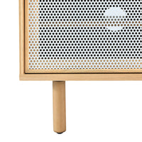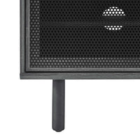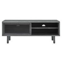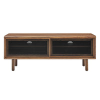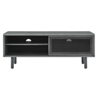Bring urban flare to your living space with the modern design of the Kurtis 47" TV Stand. Featuring sliding metal mesh doors, this entertainment center brings industrial design to the living room, bedroom, home office, or lounge area. This media stand is crafted from MDF and particleboard with a natural wood grain design. Offering ample storage space for all your media essentials, this TV console features an open shelving area concealed by mesh sliding doors with cable management holes that keep things organized and allow for flow through ventilation. Resting on sturdy wood legs with non-marking foot pads to protect flooring, this low-profile TV stand accommodates flat screen TVs up to 52 inches. Assembly required. Weight Capacity: 137 lbs.