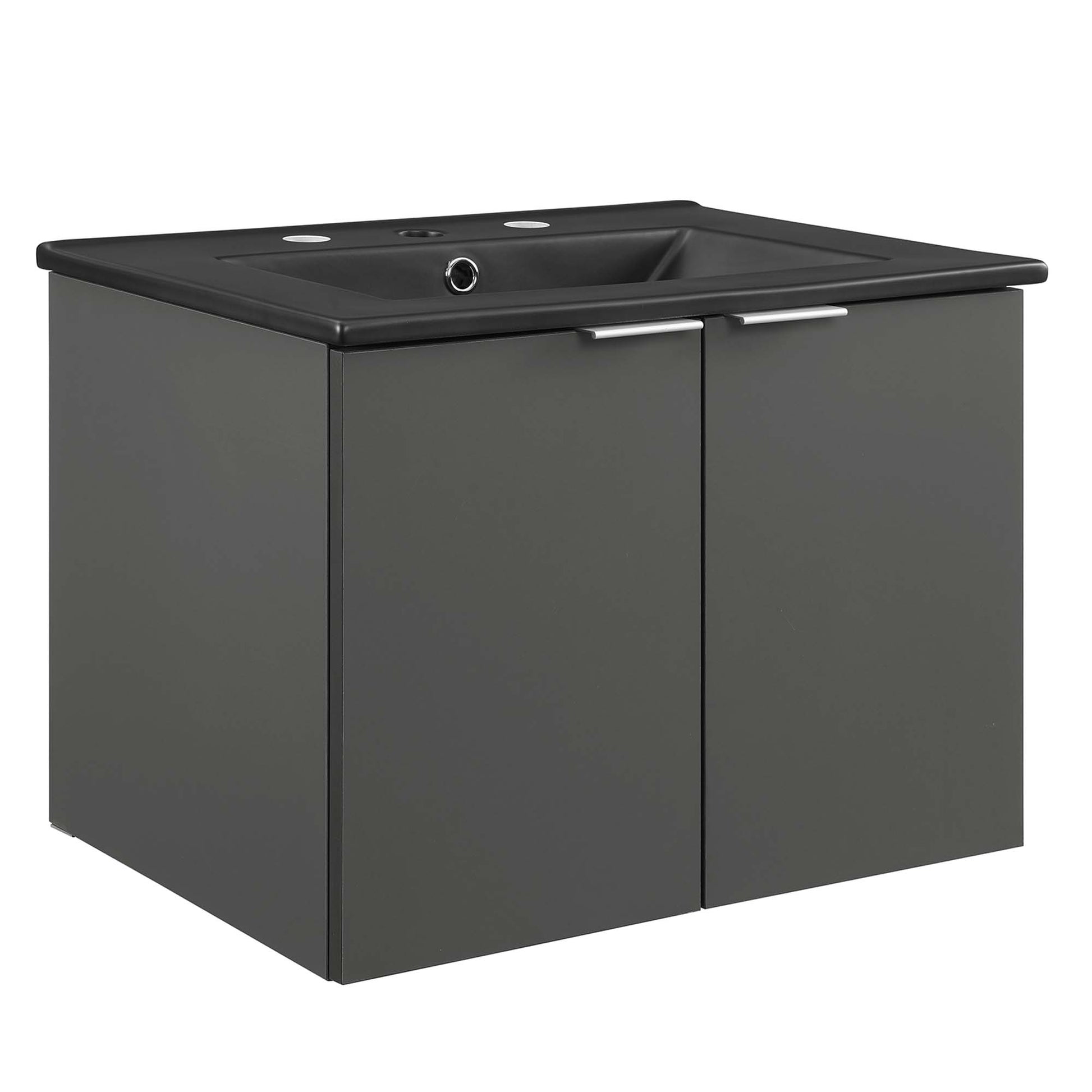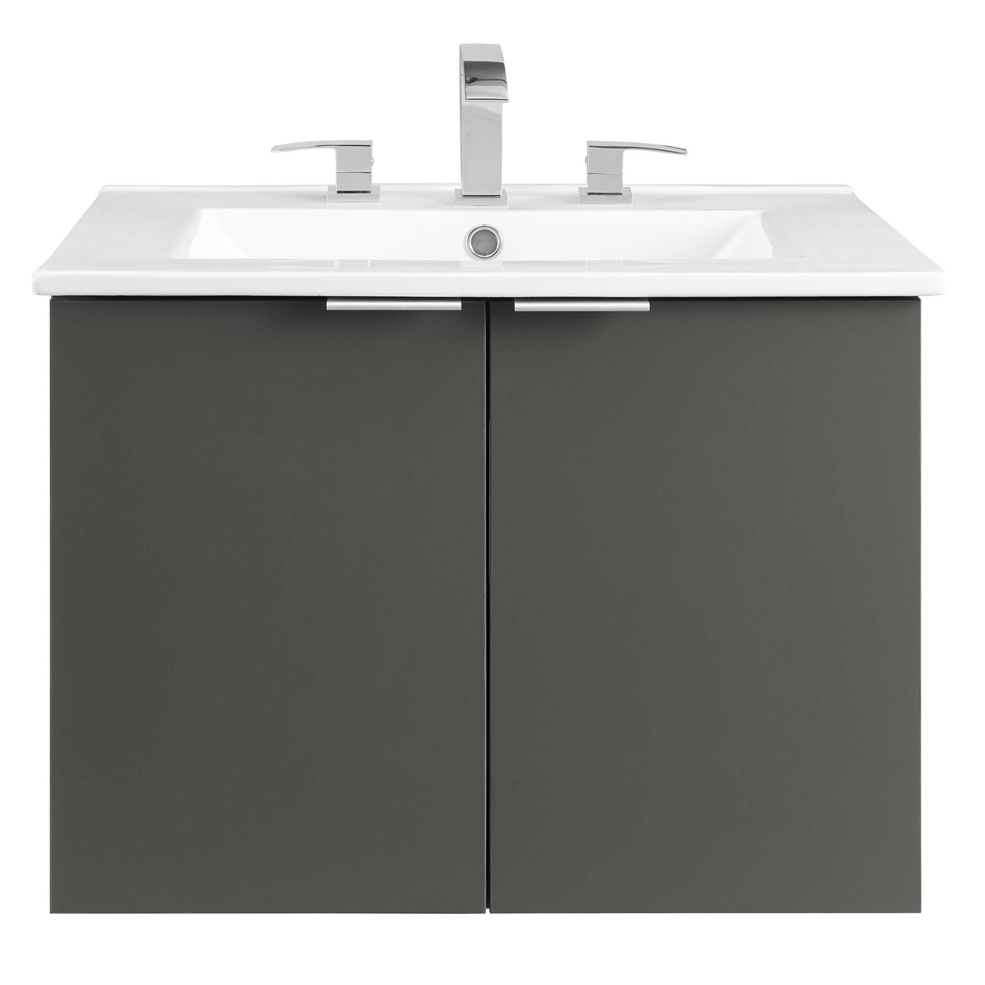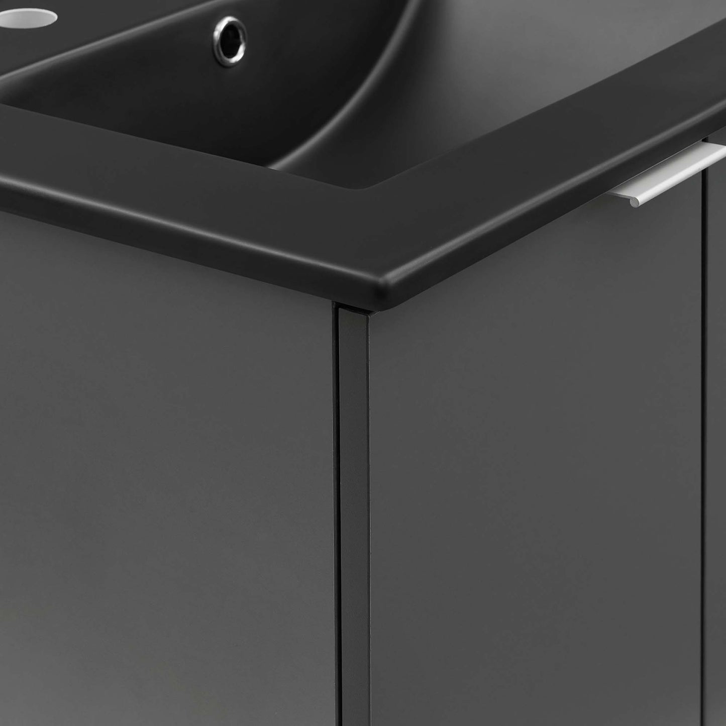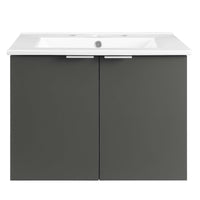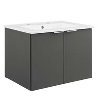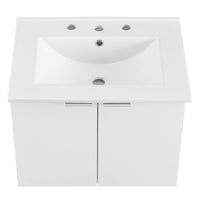 Incorporate modern aesthetics and contemporary style into your bathroom decor with the Maybelle 24" Bathroom Vanity. This vanity features a durable melamine construction with ample storage space for all your bathroom essentials behind two soft-close hinge doors with metal L-shaped handle pulls. Continuing the look of this modern vanity is a ceramic sink with an integrated countertop and 8" centerset faucet holes. Mounting directly to the wall, this bathroom sink vanity saves a substantial amount of floor space. Assembly required. Sink fixtures not included.