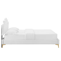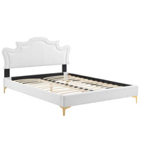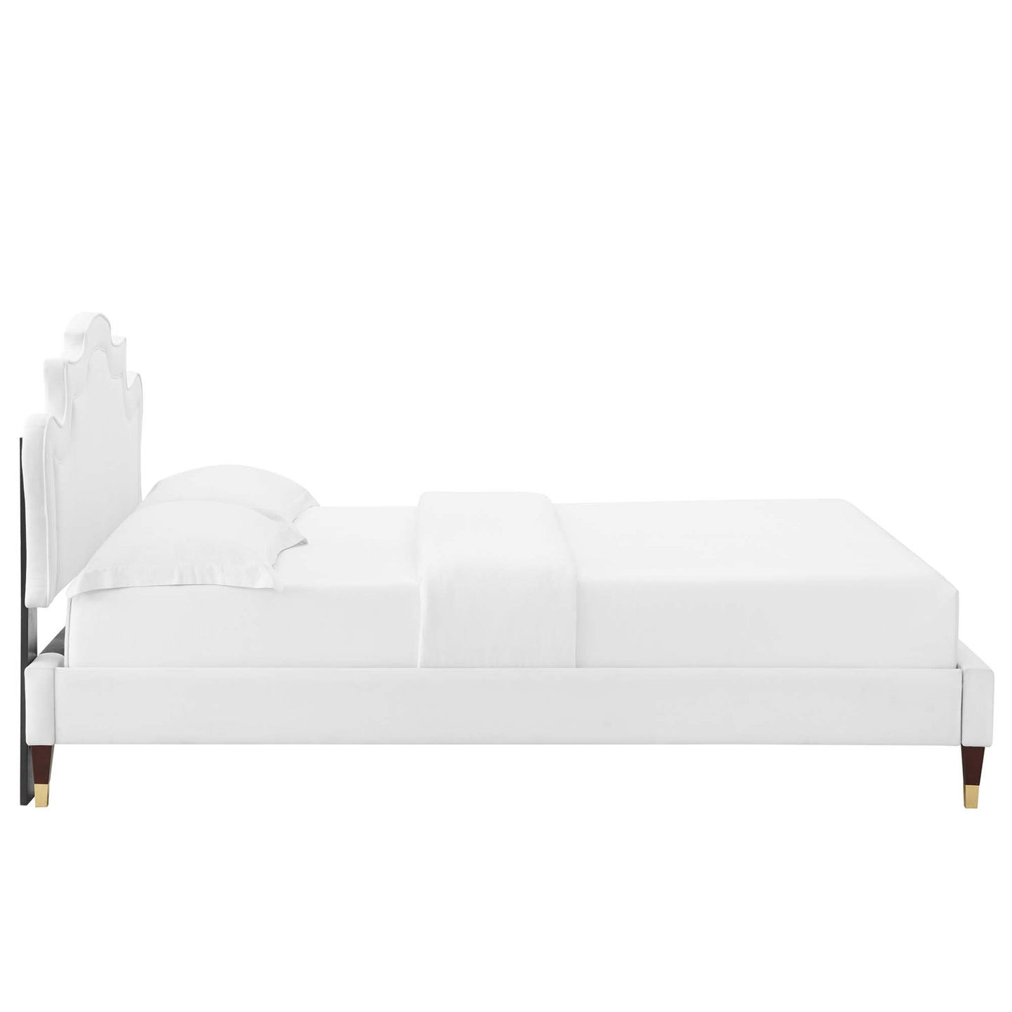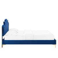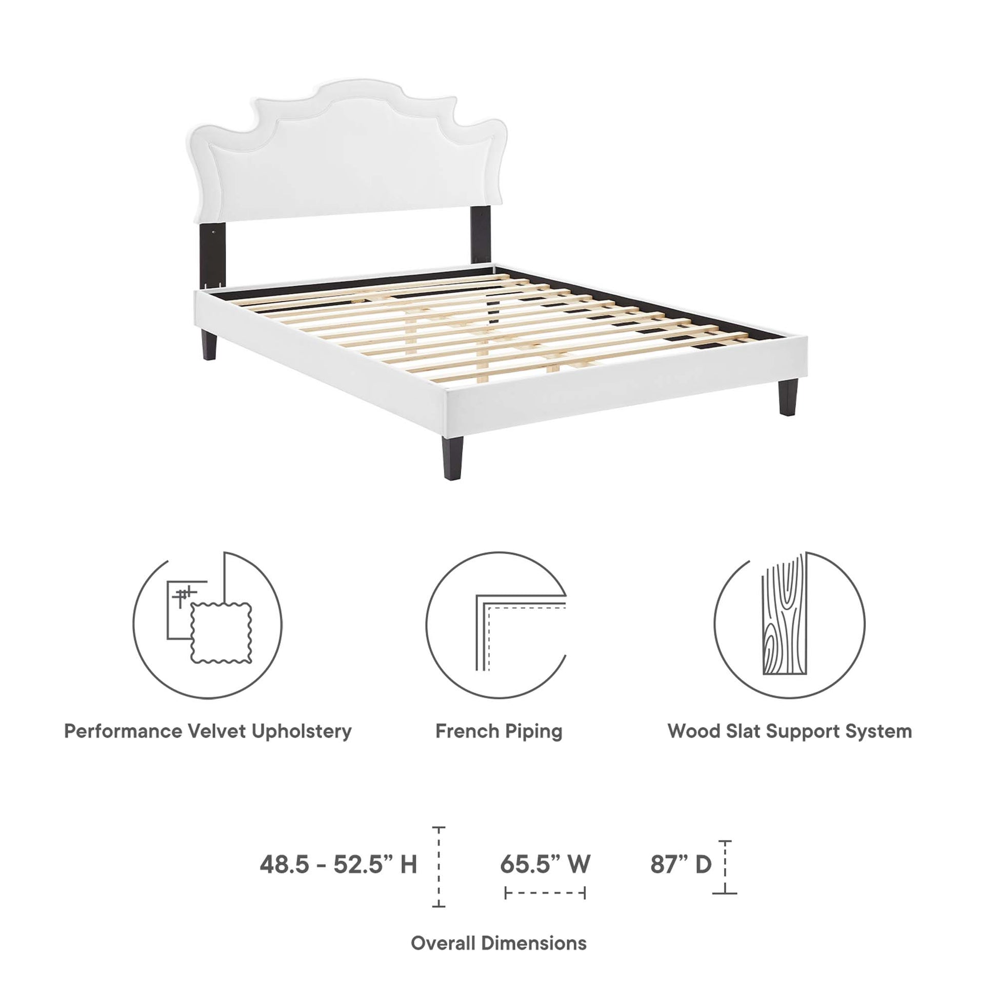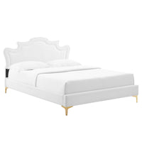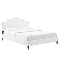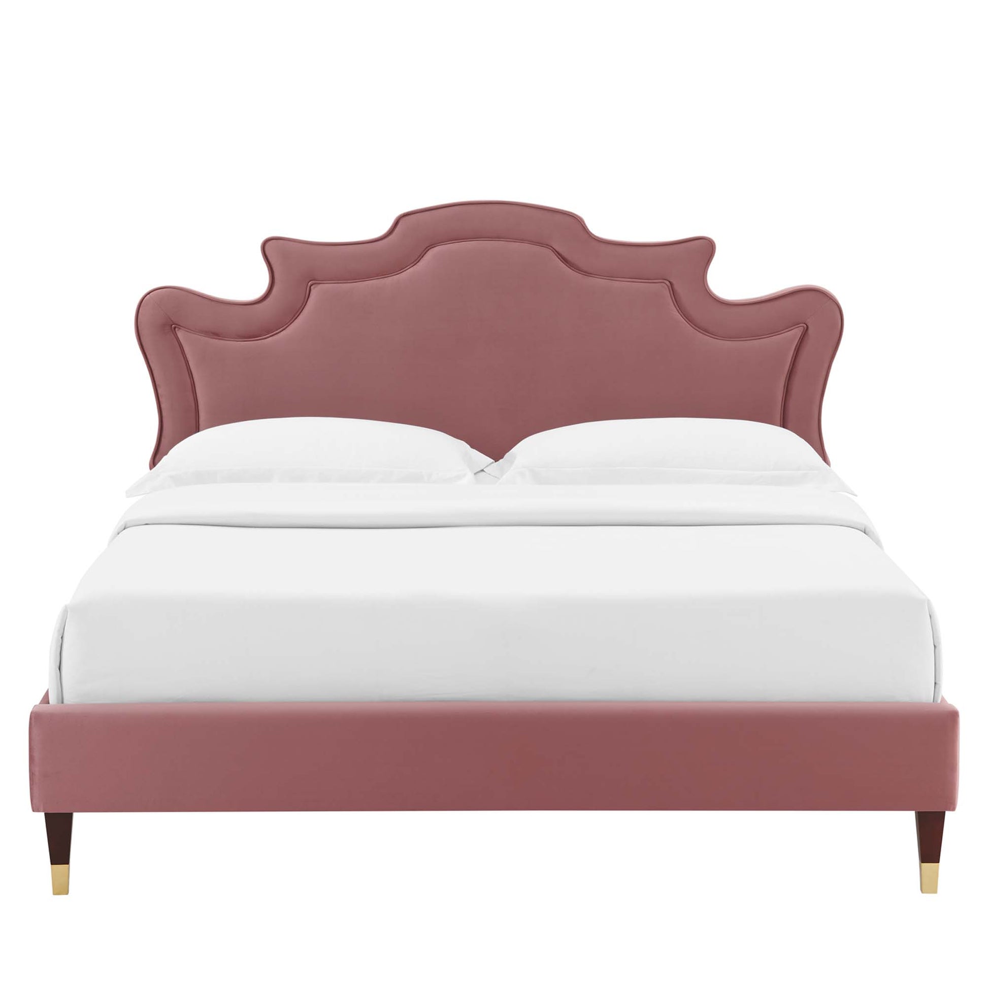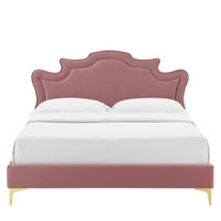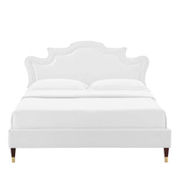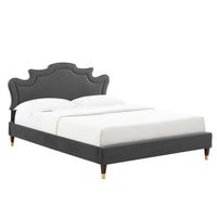 Create a luxe retreat in a master bedroom or guest room with the Neena Performance Velvet King Bed. The Victorian-style upholstered headboard is sturdily constructed on a solid plywood and MDF frame with dense foam padding. Boasting gentle curves and soft angles enriched by delicate French piping, this king platform bed is a harmonious focal point in your guest bedroom. Complementing mid-century modern or eclectic decors, this glam deco upholstered bed is tailored in stain-resistant performance velvet. The well-crafted MDF platform bed frame provides an enduring foundation for memory foam, innerspring, latex, and hybrid mattresses. This modern king bed features a well-crafted poplar wood slat support system, eliminating the need for a box spring, and a reinforced center beam with two support legs for enhanced stability. The slatted bed frame rests on gold metal legs with non-marking foot caps. Assembly required. Weight Capacity: 800 lbs.