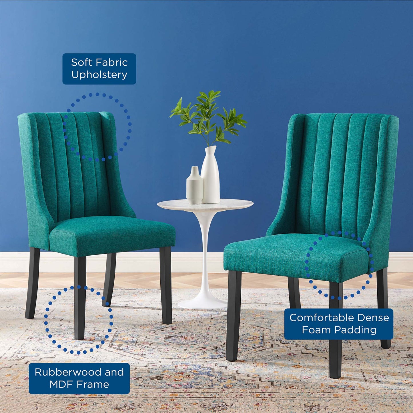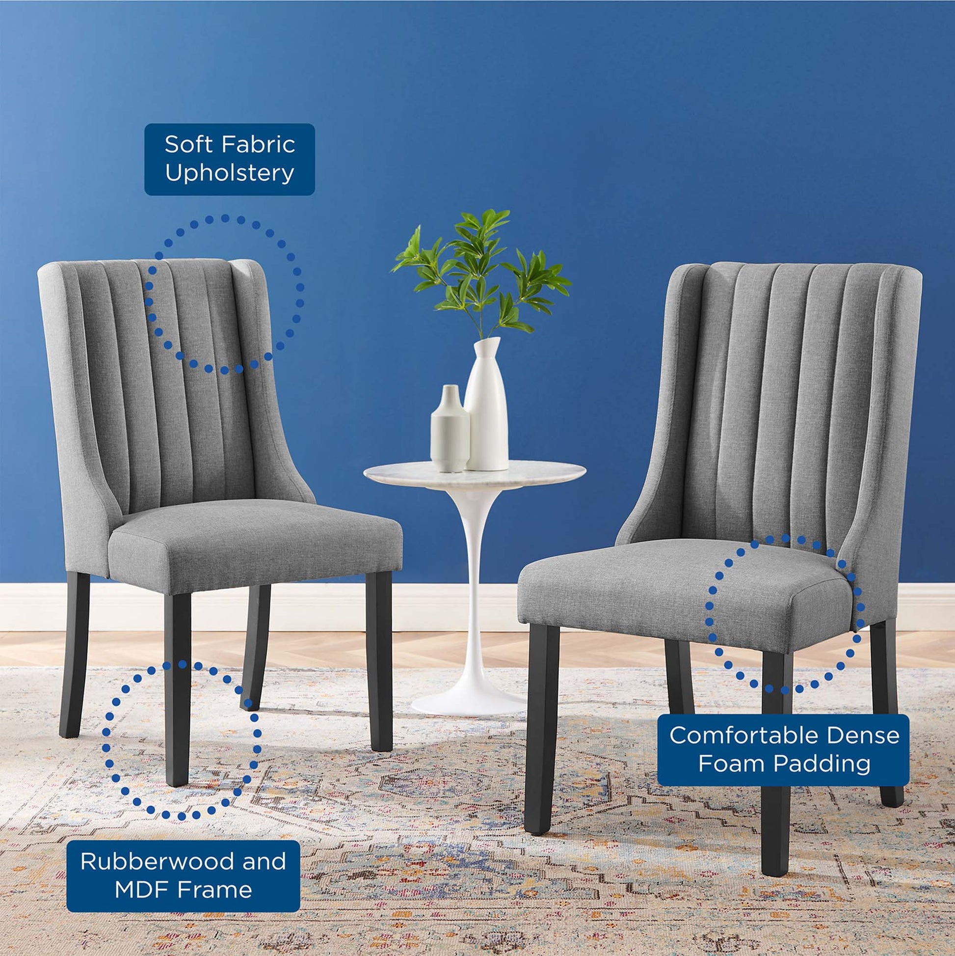 Revitalize your dining space with the Renew Fabric Dining Chairs. A set of two, these Parsons dining chairs bring glam deco style to your dining space with soft fabric upholstery and channel tufting. This fabric dining chair set features a sturdy rubberwood and MDF construction with dense foam padding and spring support system to offer a premium seating experience that encourages relaxation and conversation. Resting atop four black legs with plastic foot glides to prevent damage to flooring, these tufted accent chairs make a striking statement in the dining room, kitchen, living room, office, or other seating area.