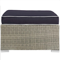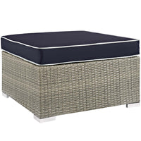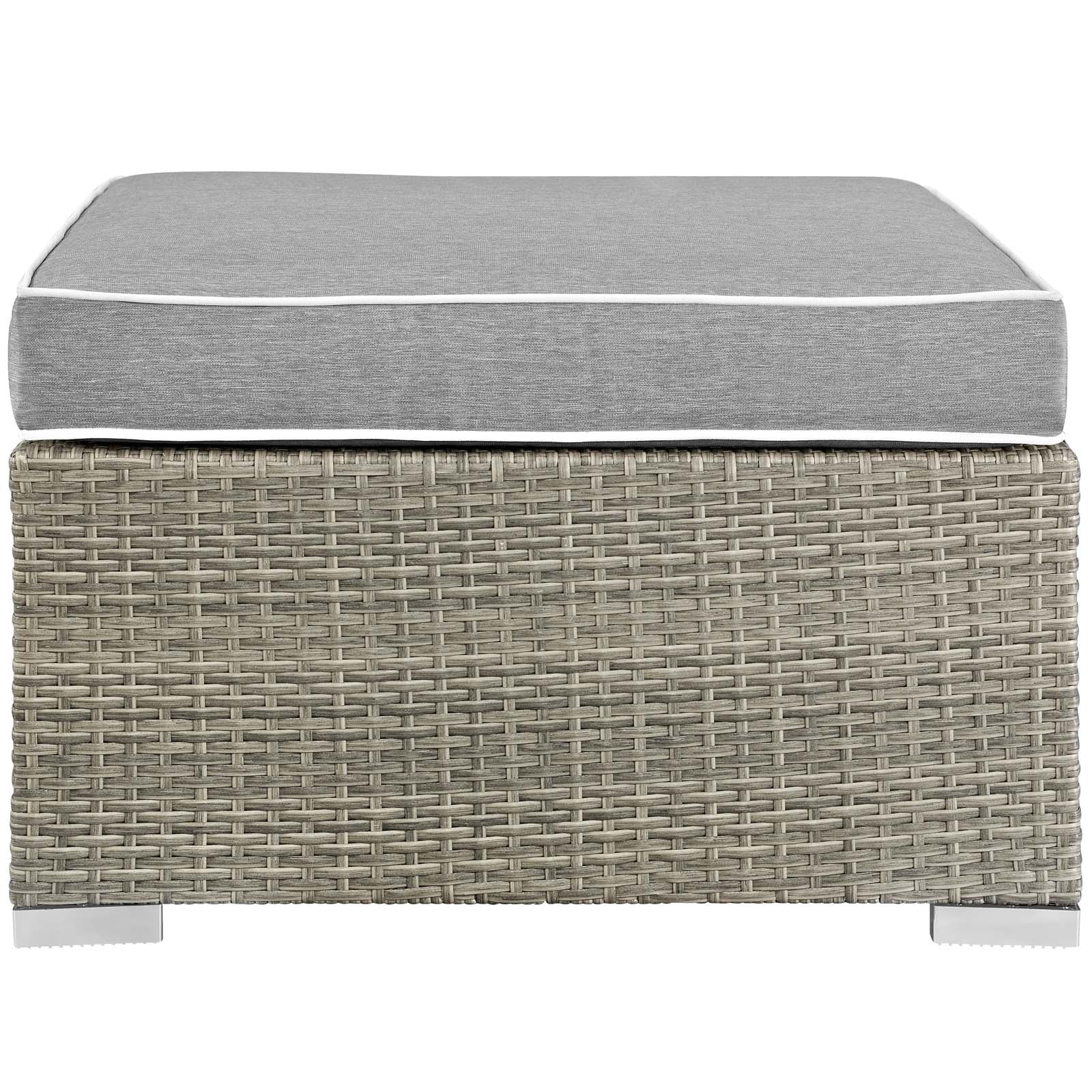 Enjoy the outdoors while benefiting from style and comfort of the Repose Outdoor Patio Furniture Series. Repose Patio Ottoman offers a detailed tan and gray synthetic rattan weave with UV protection for eye-catching appeal and durability, plush 4” thick all-weather polyester cushions with contrasting color French piping, non-marking foot pads, and a sturdy powder-coated aluminum frame that supports up to 331 pounds. Subtle style defines the Repose outdoor sectional collection making it a natural choice for enhancing your patio, backyard, or poolside gatherings. This installment of the series is an outdoor patio ottoman.