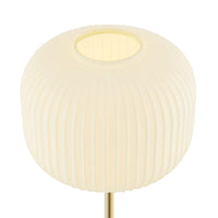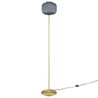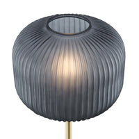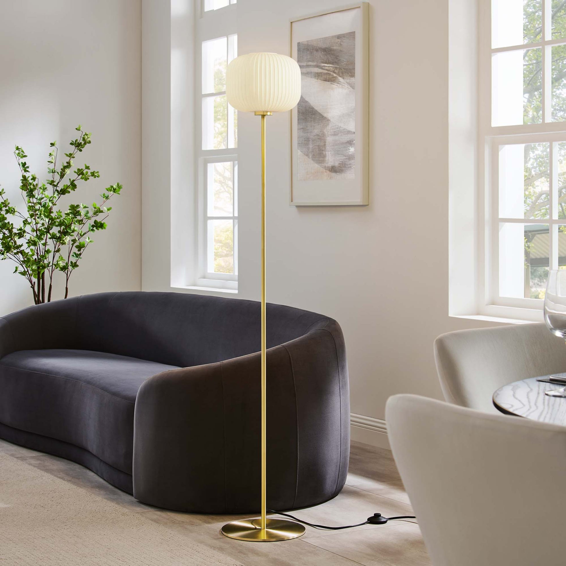 Introduce ingenuity and nuanced retro style into your home lighting design. The iconically shaped Reprise Glass Sphere Floor Lamp brings structure, texture, and a warm transparent glow in your bedroom, living room, entryway, or office. The opaque glass shade is softly textured with embossed horizontal lines creating a commanding living room floor lamp in mid-century modern, contemporary, or eclectic decors. This tall standing lamp combines elegance and functionality with rich satin brass accents and an open top allowing easy bulb access. Reprise is a dimmable standing lamp for the bedroom (dimmer switch not included), requiring 1 E26 60W max bulb or LED equivalent (not included). Easy access on/off floor switch on a black cable. Assembly required. Clean with a soft, damp cloth.
