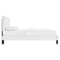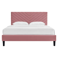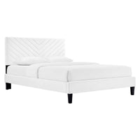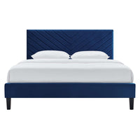Update your master bedroom or guest room with glam deco decor with the Roxanne Chevron Tufted Performance Velvet King Platform Bed. With a squared profile, this king bed grants a luxurious presence to your bedroom with its angular channel tufted detail and vintage modern style. The padded king headboard and side rails come covered in soft, stain-resistant performance velvet upholstery that grants rich texture to the luxurious design. Resting atop tapered black wood legs, this platform bed frame crafted with MDF and LVL is a sturdy mattress foundation for memory foam, innerspring, latex, and hybrid mattresses. With supporting legs and a reinforced center beam, this upholstered bed is complete with a poplar wood slat support system that offers lasting stability and healthy air circulation. Mattress not included. Assembly required. King Bed Weight Capacity: 800 lbs.