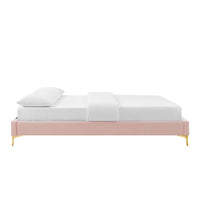 Uplift your master bedroom or guest bedroom decor with the Sutton Performance Velvet Twin Bed Frame. A Twin size bed frame covered in stain-resistant performance velvet, this upholstered bed frame is a sturdy mattress foundation for memory foam, innerspring, latex, and hybrid mattresses. Eliminating the need for a box spring, the MDF frame of this Twin bed is complete with a wood slat support system crafted with poplar for lasting durability and support. This slatted bed frame rests on gold metal legs with non-marking foot caps and includes a reinforced center beam with two support legs for enhanced stability. The Sutton Bed Frame is compatible with a variety of different headboard styles, or makes a statement as a stand-alone piece in the bedroom. Bed frame interchangeable with Paige, Alyson, Angela, Veronique, Evelyn, Dawn, Cecilia, Lucia, Rosalind, Delilah, Greta, Louisa, Eloise, Daisy, Sadie, Sloane, Fallon, and Lizzy. Mattress not included. Assembly required. Twin Size Bed Frame Weight Capacity: 800 lbs.
