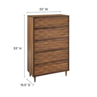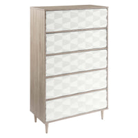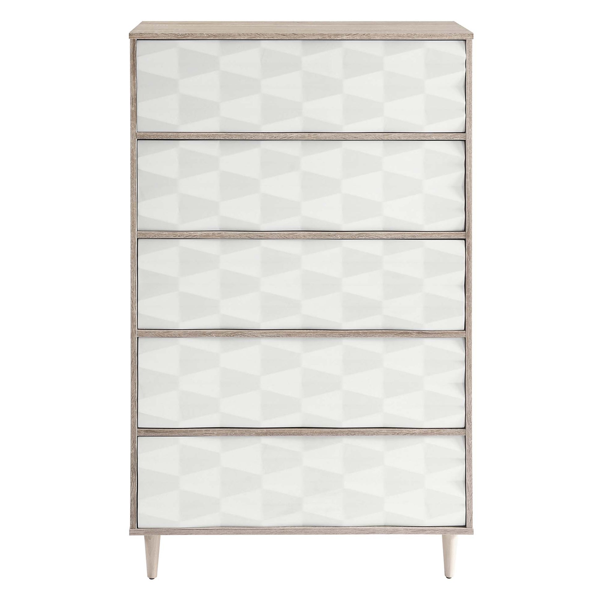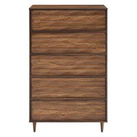 The Vespera Five-Drawer Chest brings contemporary modern intrigue to the home or apartment featuring a grooved wave design on the front, tapered legs, and ample concealed storage space. Functional, beautiful, and streamlined, this spacious chest stores clothes, linens, home essentials, and more without sacrificing style. A sturdy mindi wood and particleboard construction with a wood grain finish make it a durable addition in a variety of spaces in the home. Five full-glide drawers provide ample storage space and non-marking foot glides protect your flooring. Easy to follow assembly instructions included. PLEASE NOTE: For the greatest design pattern effect, please place the product in a well-lit room.