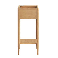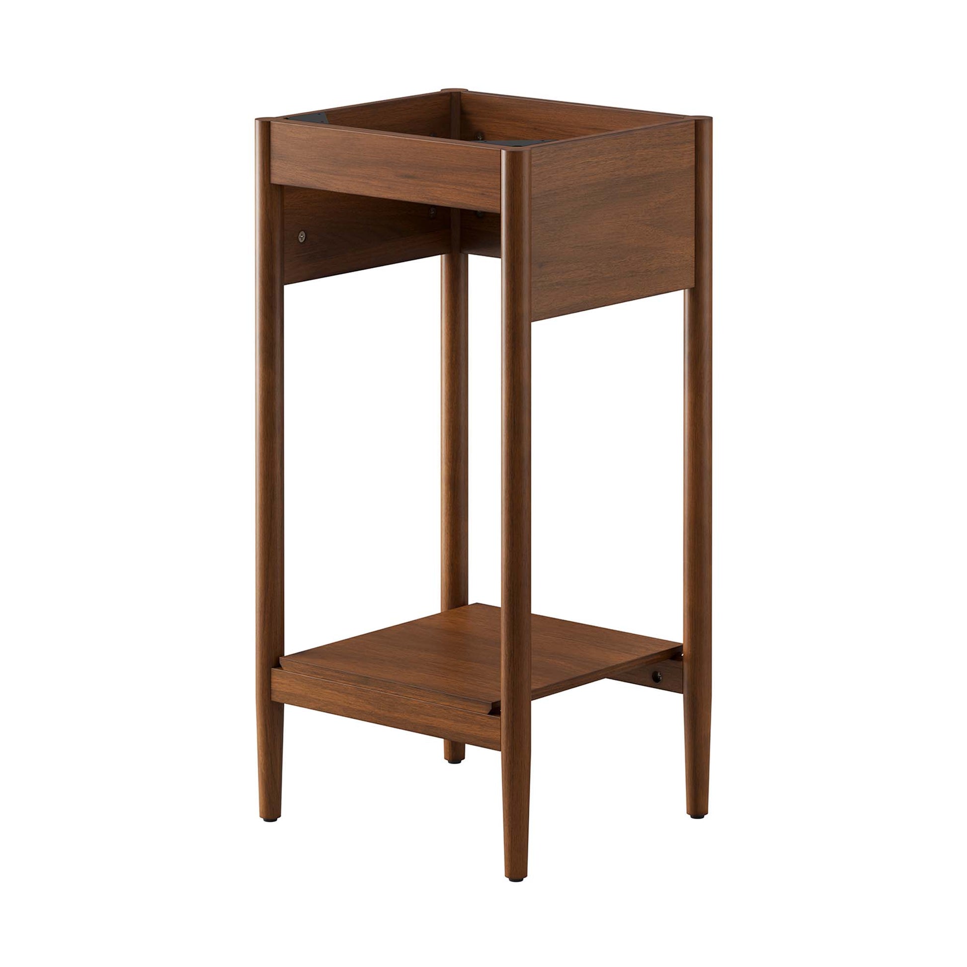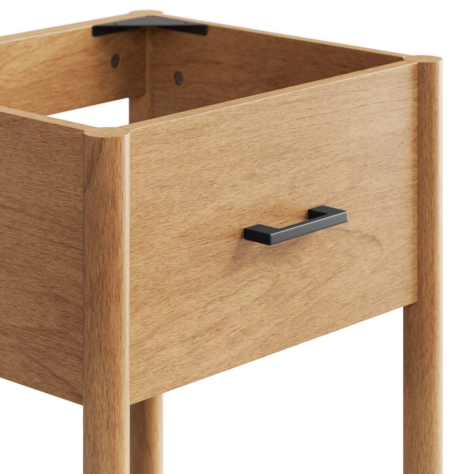 Infuse your bathroom decor with the subtle charm and simplicity of the Zaire 18” Bathroom Vanity Cabinet. This exquisite washstand combines sleek, contemporary lines with the natural beauty of wood in an organic minimalist design. Crafted from MDF and solid rubberwood and topped with a wood grain veneer, this vanity’s design is emphasized by a metal handle pull on its fixed drawer, giving it a touch of urban chic. Below this, you'll find an open shelf, ideal for holding towels or showcasing your favorite decorative pieces. This small vanity’s tapered wood legs are a modest and understated design choice that completes the overall simple mid-century aesthetic. Includes adjustable, non-marking feet for added stability and floor protection. Assembly required. Fixtures and sink basin not included. Weight Capacity: 240 lbs.