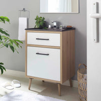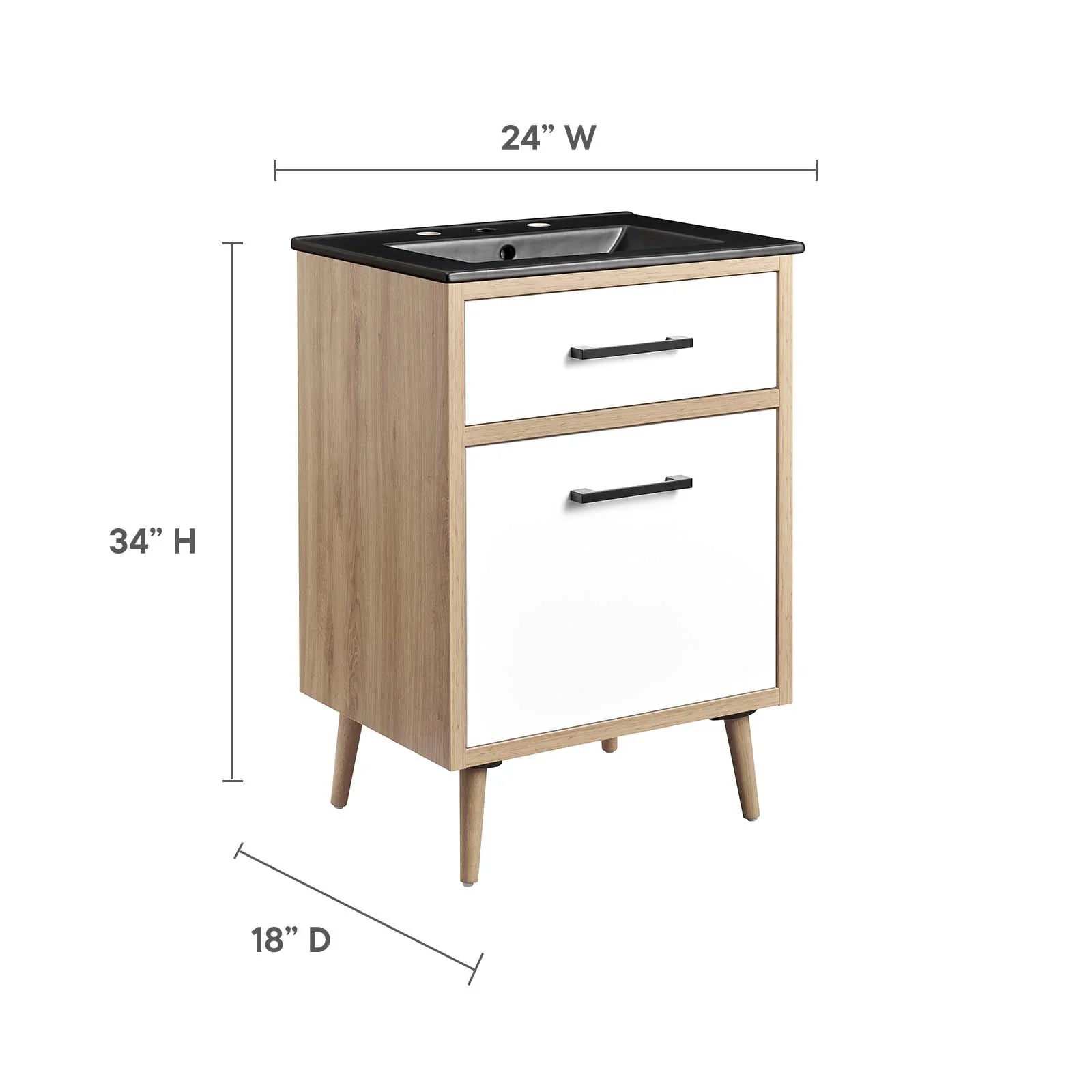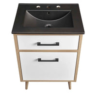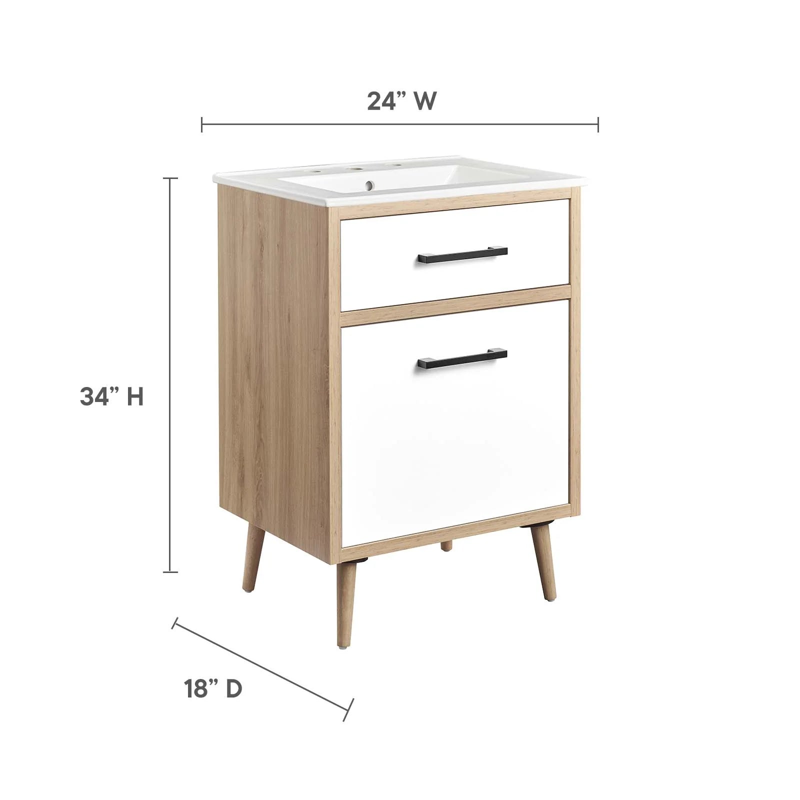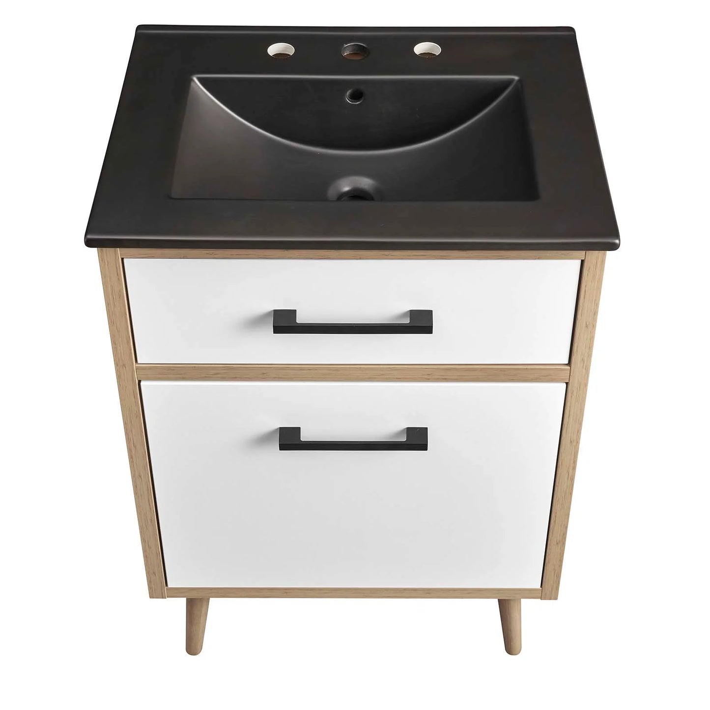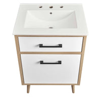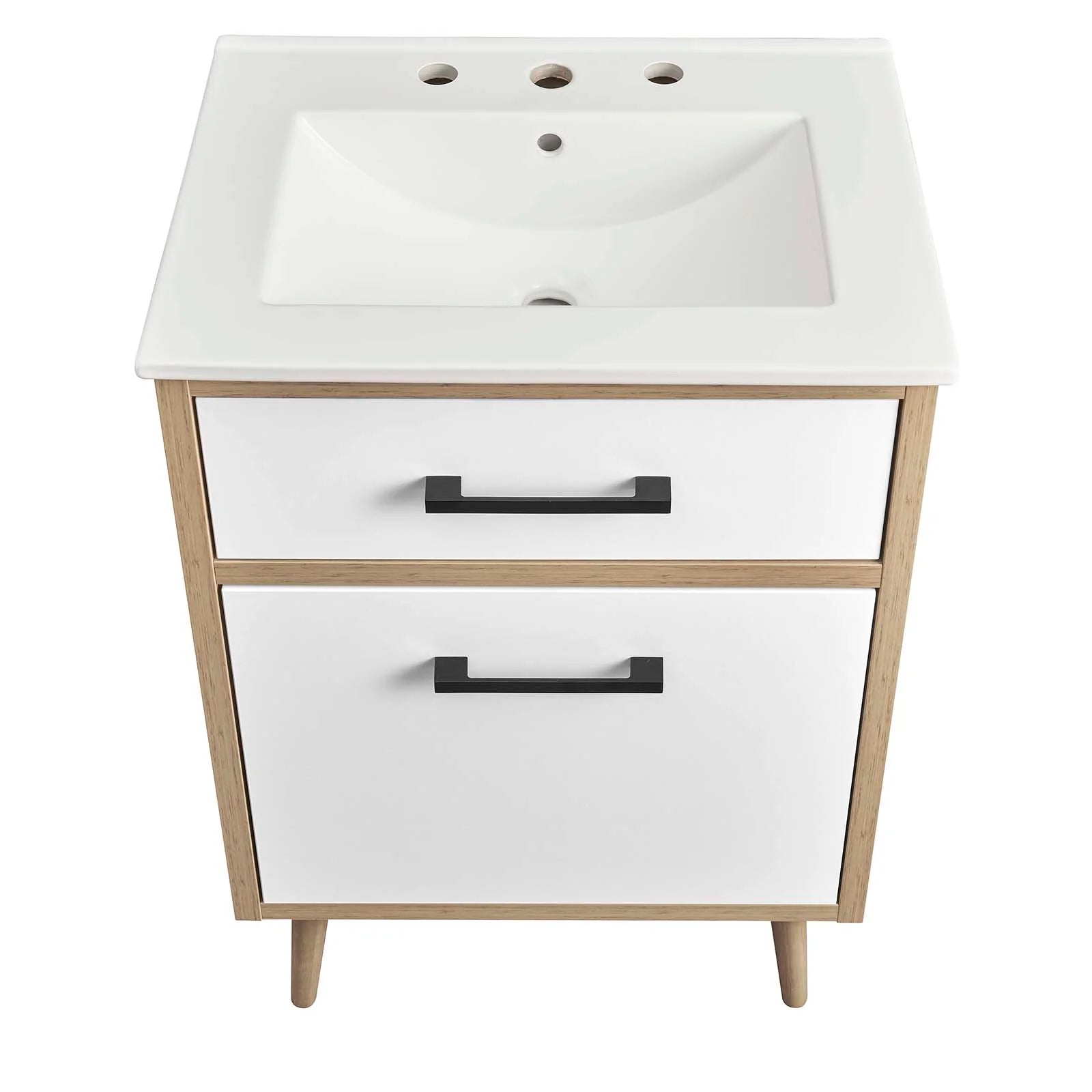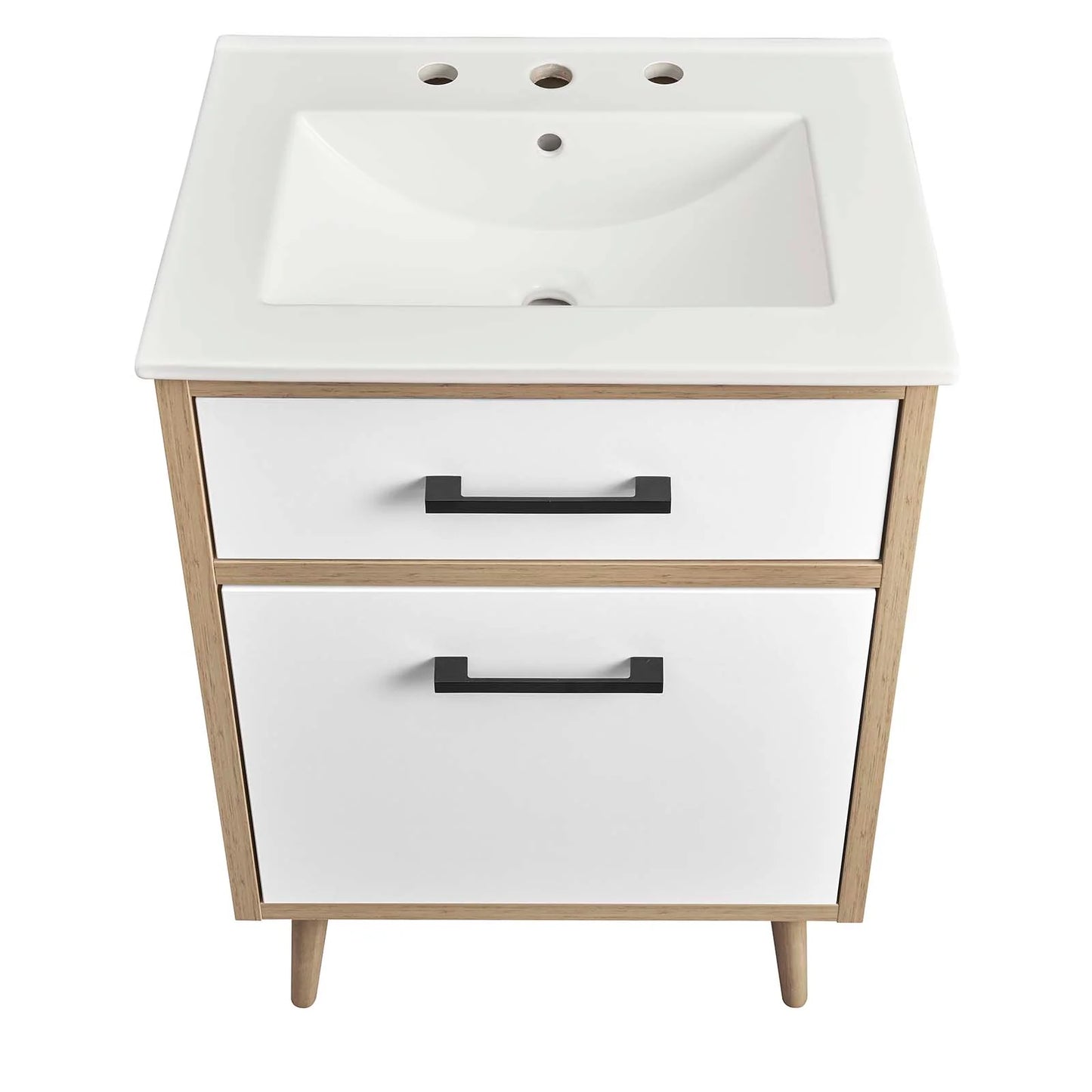 • The Maverick 24" Bathroom Vanity is the perfect blend of modern style and convenience. Crafted with particleboard and melamine, the simple yet elegant design is enhanced by modern metal handle pulls and tapered and splayed rubberwood legs. The spacious full-glide bottom drawer provides plenty of storage space for all your bathroom essentials, while the fixed top drawer adds complementing style. This bathroom vanity cabinet features a ceramic sink basin with an integrated countertop and 8" centerset faucet holes. This bathroom vanity instantly transforms your space, creating a beautiful, modern look that will last for years. Includes non-marking foot glides to protect flooring. Assembly required. Fixtures not included.