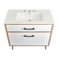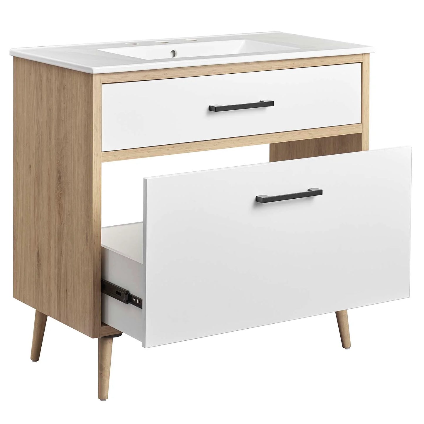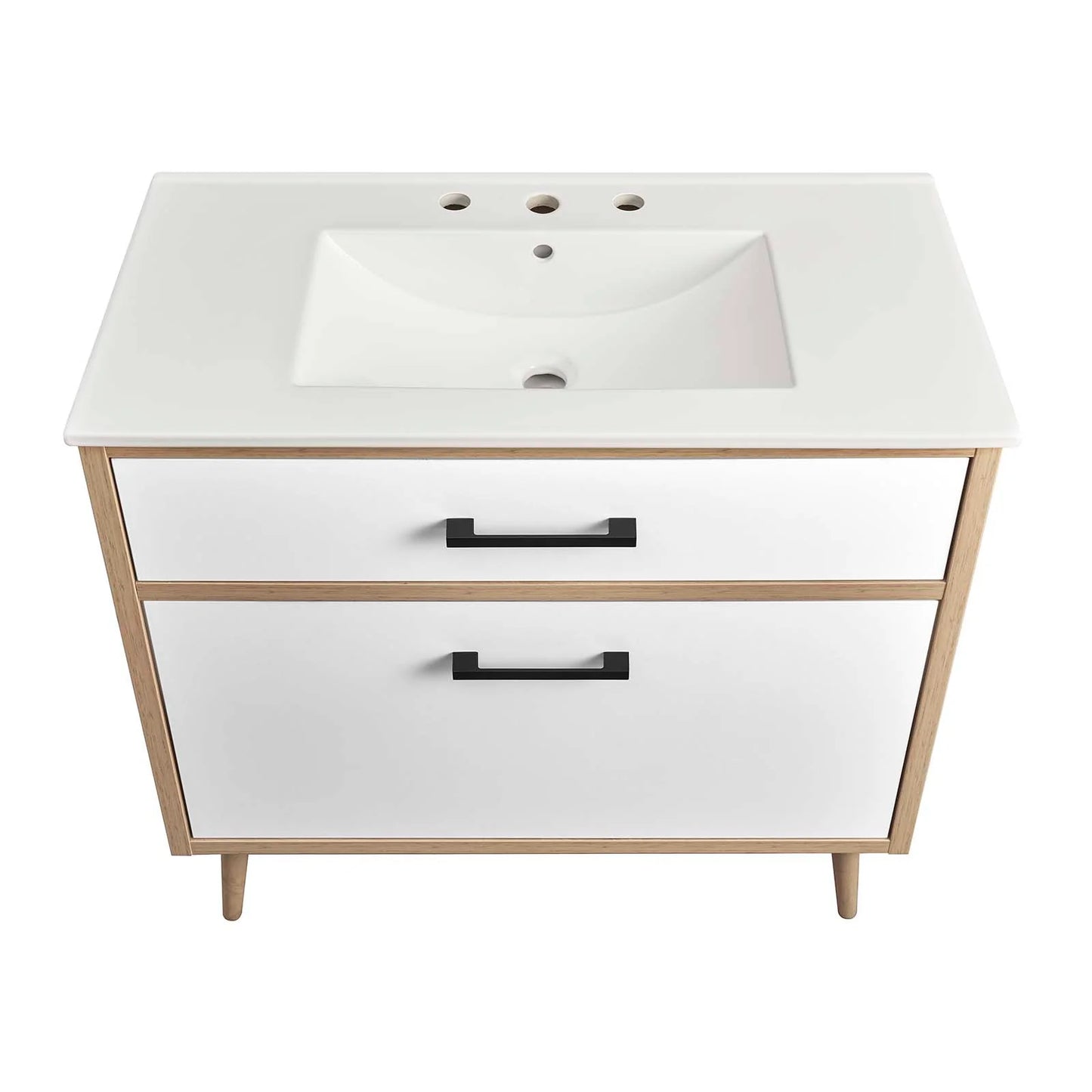 • The Maverick 36" Bathroom Vanity is the perfect blend of modern style and convenience. Crafted with particleboard and melamine, the simple yet elegant design is enhanced by modern metal handle pulls and tapered and splayed rubberwood legs. The spacious full-glide bottom drawer provides plenty of storage space for all your bathroom essentials, while the fixed top drawer adds complementing style. This bathroom vanity cabinet features a ceramic sink basin with an integrated countertop and 8" centerset faucet holes. This bathroom vanity instantly transforms your space, creating a beautiful, modern look that will last for years. Includes non-marking foot glides to protect flooring. Assembly required. Fixtures not included..
