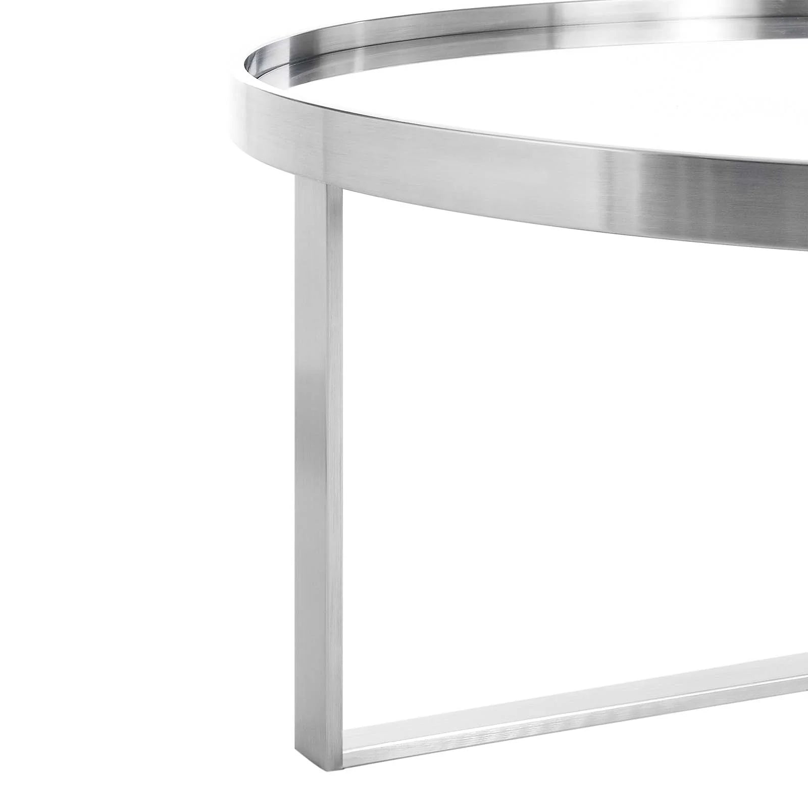 • Lighten up your living space with the modern design of the Relay Round Coffee Table. A powder-coated black frame encircles a round piece of tempered glass for a clear tabletop that brightens any room. This coffee table is the perfect addition when situated in a living room, lounge room, office space, or bedroom sitting area. Relay includes adjustable non-marking foot caps to protect flooring and provide added stability on uneven surfaces. Assembly required. Weight Capacity: 300 lbs.