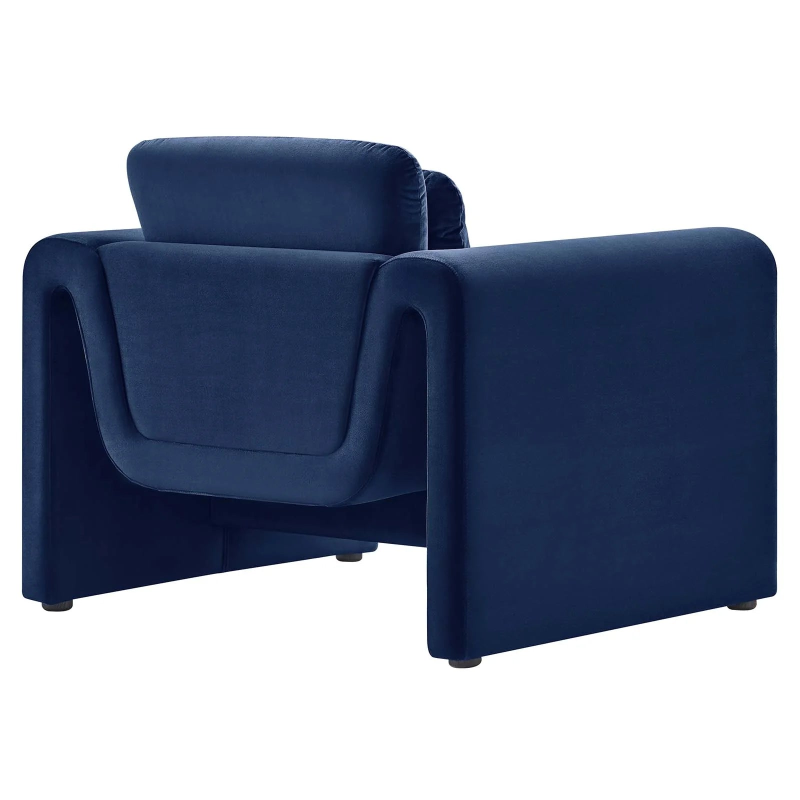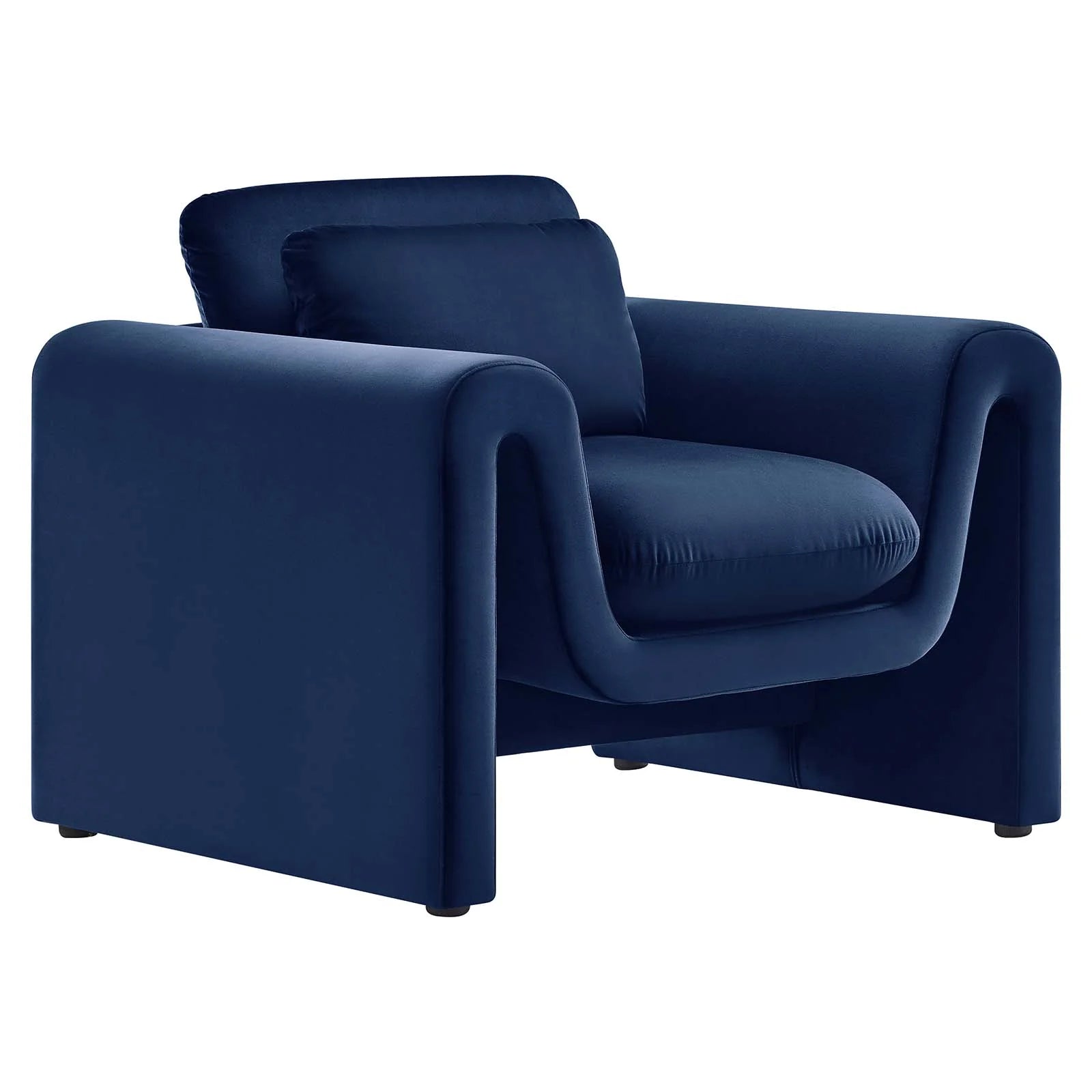 • Divulge in the luxe splendor of the one-of-a-kind Waverly Performance Velvet Armchair. This living room chair features a unique, wavy shape complete with bent lines and rounded edges. With dense foam padding for superior comfort, this accent chair is upholstered in stain-resistant performance velvet with a soft and luxurious feel. The spacious seat and plush removable cushions create an inviting look and offer superior comfort while resting and relaxing. The adjustable non-marking foot pads elevate the upholstered armchair to perfectly fit your space and protect your floors. With its beautiful silhouette and cozy comfort, this performance velvet chair is a stylish piece for the living room, bedroom, office, or reception area. No assembly required. Weight Capacity: 330 lbs.