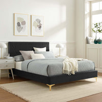 • Introduce a polished aesthetic in your master bedroom or a guest room with the sleek and elegant Yasmine Channel Tufted Performance Velvet King Platform Bed. The king-sized upholstered bed brings contemporary refinement with subtle glam deco style into mid-century modern or eclectic settings, featuring vertical channel tufting set within soft angular lines. Tailored in stain-resistant performance velvet, the durable MDF bed frame provides a sturdy foundation for memory foam, innerspring, latex, and hybrid mattresses. The well-crafted poplar wood slat support system features a reinforced center beam and two support legs, granting endless support and eliminating the need for a box spring. The slatted king bed frame rests on gold metal legs with non-marking foot caps. Assembly required. Weight Capacity: 800 lbs.