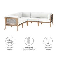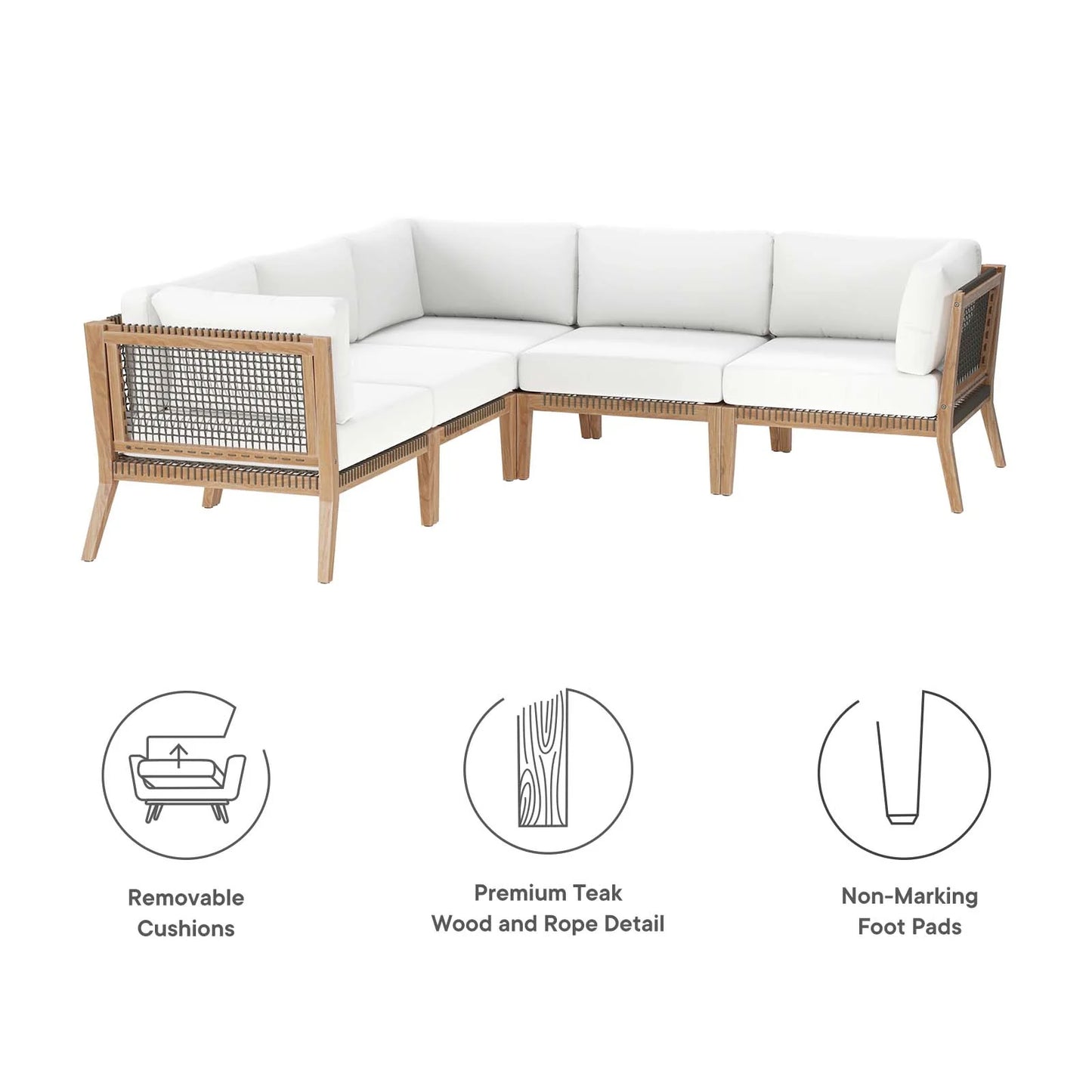 • Bask in warm weather as you lounge on the Clearwater Outdoor Patio Furniture Collection. Bringing contemporary aesthetics to a backyard, porch, patio, deck, or poolside, this outdoor sectional sofa features woven rope webbing underneath the foam padded cushions that grants breezy, coastal charm. Rest and relax amidst comfortable cushions with removable all-weather covers for easy cleaning. The base of this patio set is crafted with grade A premium teak wood that boasts a beautiful, rich wood grain and is naturally weather-resistant. Includes non-marking foot glides to protect flooring. Each Seat Weight Capacity: 498 lbs.