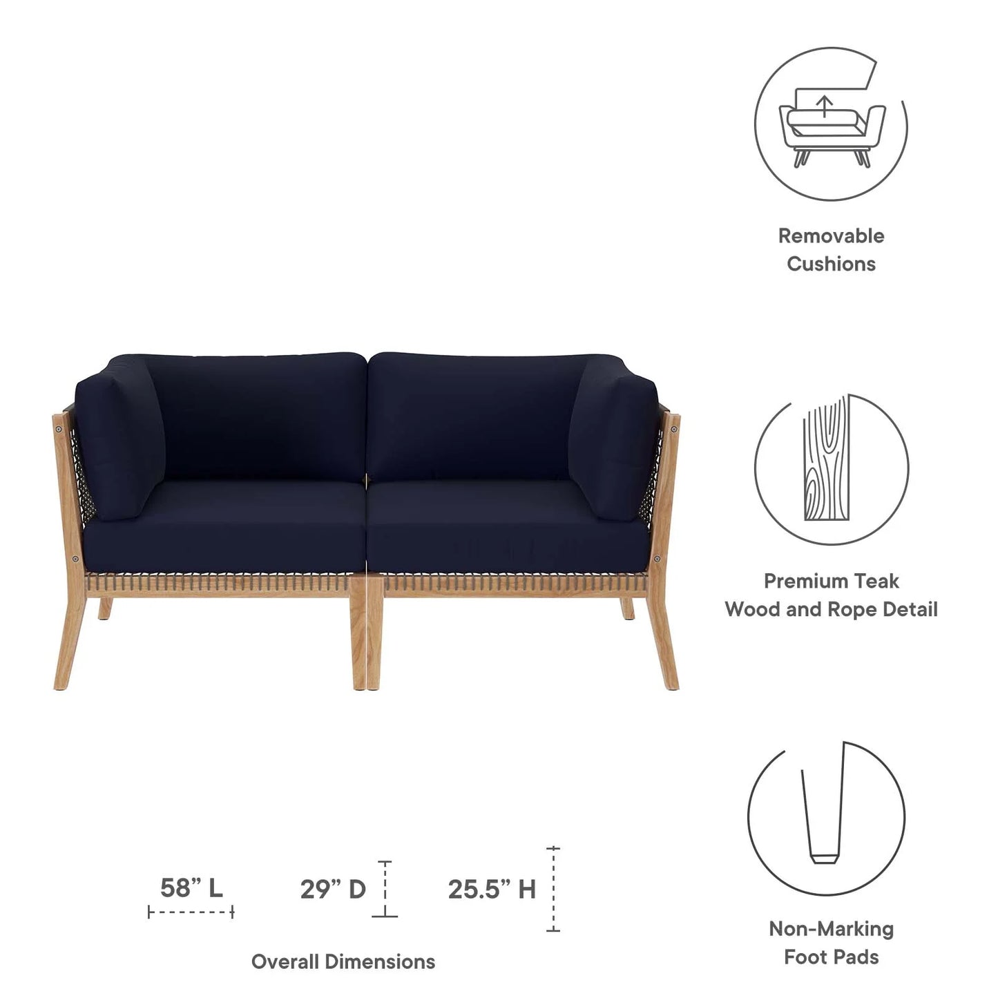• Bask in warm weather as you lounge on the Clearwater Outdoor Patio Furniture Collection. Bringing contemporary aesthetics to a backyard, porch, patio, deck, or poolside, this outdoor sectional sofa features woven rope webbing underneath the foam padded cushions that grants breezy, coastal charm. Rest and relax amidst comfortable cushions with removable all-weather covers for easy cleaning. The base of this patio set is crafted with grade A premium teak wood that boasts a beautiful, rich wood grain and is naturally weather-resistant. Includes non-marking foot glides to protect flooring. Each Seat Weight Capacity: 498 lbs.