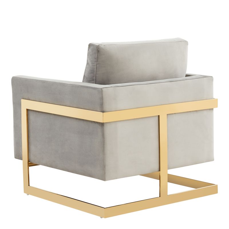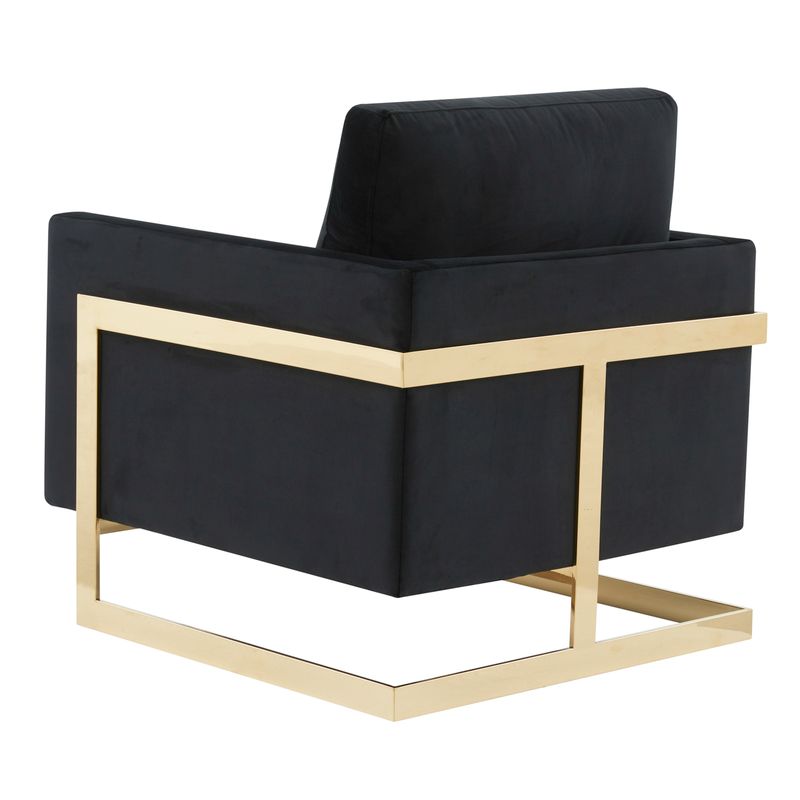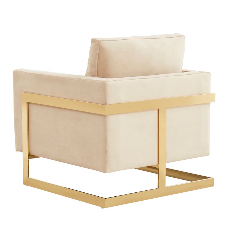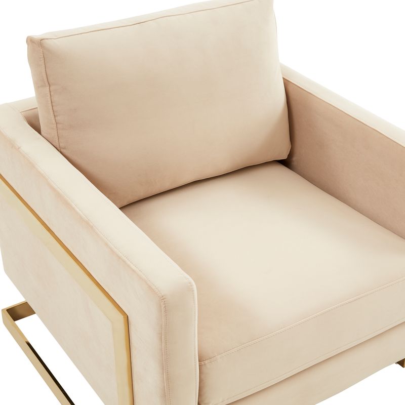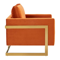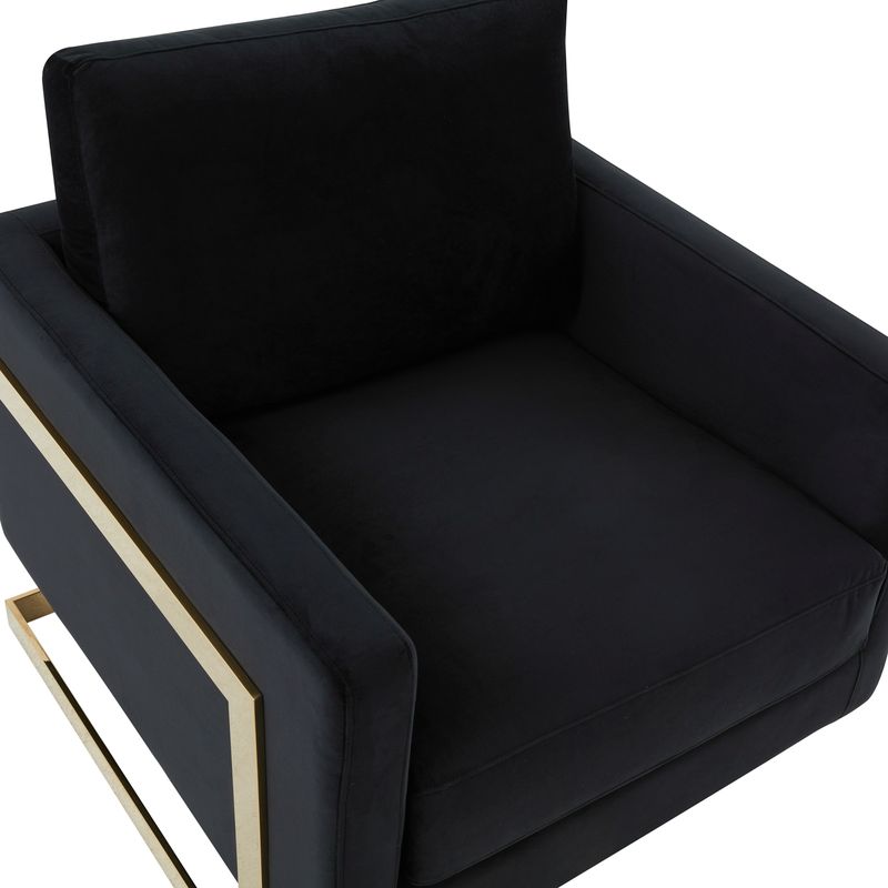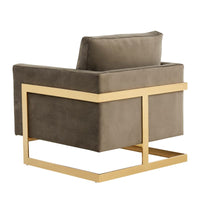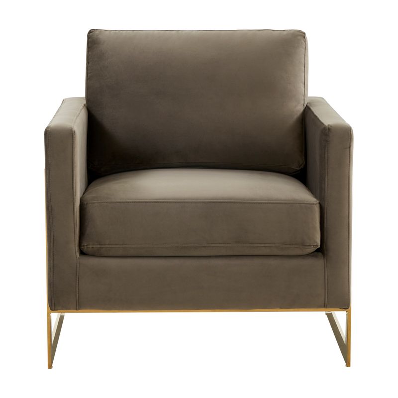 The Elton Collection features a classic style that elicits thoughts of modern elegance and grace. Add glamorous definition to your interior space with a Elton armchair, Designed with simple, modern lines and scaled for use anywhere in your home, the chair’s seating area is covered in an elegant velvet that is set off by the splendid gold metal legs. The chair is built with durability and supportive comfort in mind, from the sturdy hardwood solids in the frame to the stainless-steel legs to the high-density foam and fiber padding in the seat and back. The Accent Armchair brings a regal ambiance to this piece, making this a glamorous addition to your home.