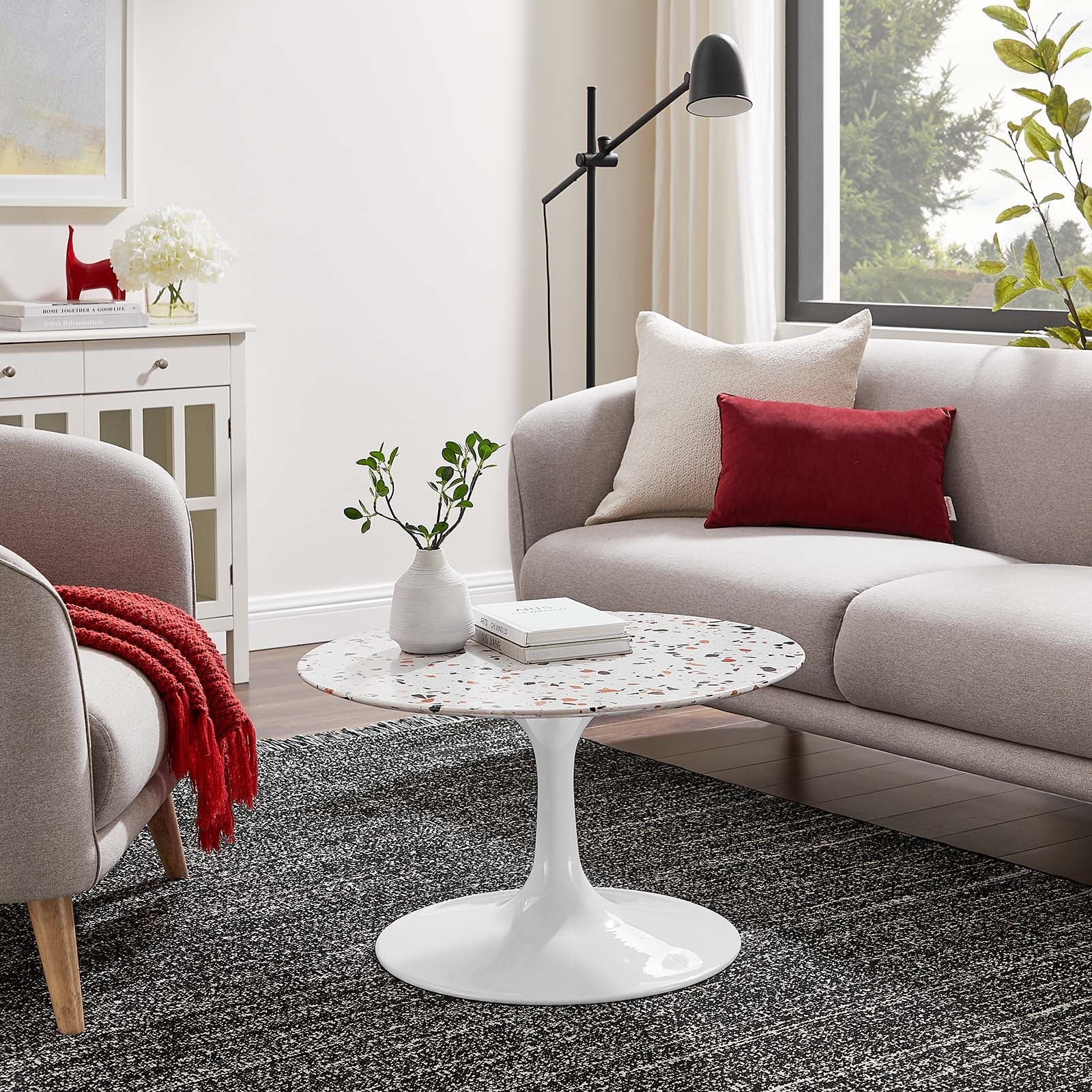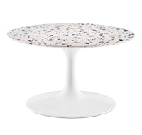 • Let modern inspiration flow while gathered around the Lippa 28" Round Terrazzo Coffee Table. Perfect for hosting a morning cup of coffee or entertaining family and friends, this pedestal table features a spacious surface. Its round tabletop features a durable terrazzo construction and beveled edge for a contemporary yet timeless design. Embodying an iconic mid-century silhouette, this pedestal coffee table floats on a sleek tapered metal pedestal base with a chip-resistant lacquered finish. Includes non-marking felt pad to protect flooring. Assembly required.