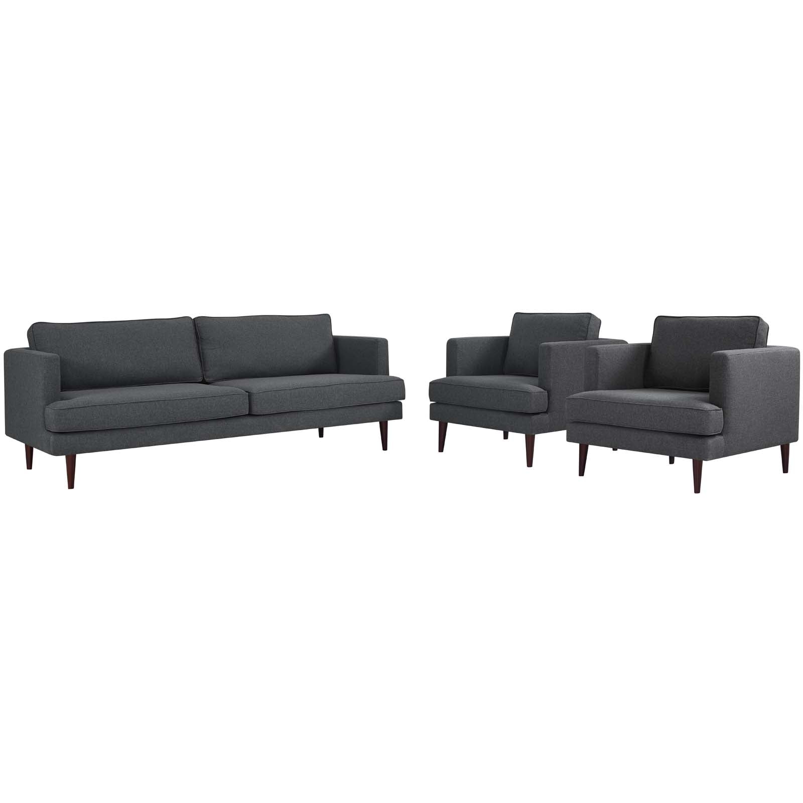 Versatility abounds in the streamlined silhouette of Agile Sofa and 2 Armchair Set. Whether mid-century, contemporary or modern décors suit your style, the clean lines, squared edges, tapered wood legs with non-marking foot caps of this low-profile collection are sure to make a statement in virtually any setting. Densely padded foam cushions with removable, machine-washable covers grant a superior lounge spot perfect for relaxing or casual entertaining.