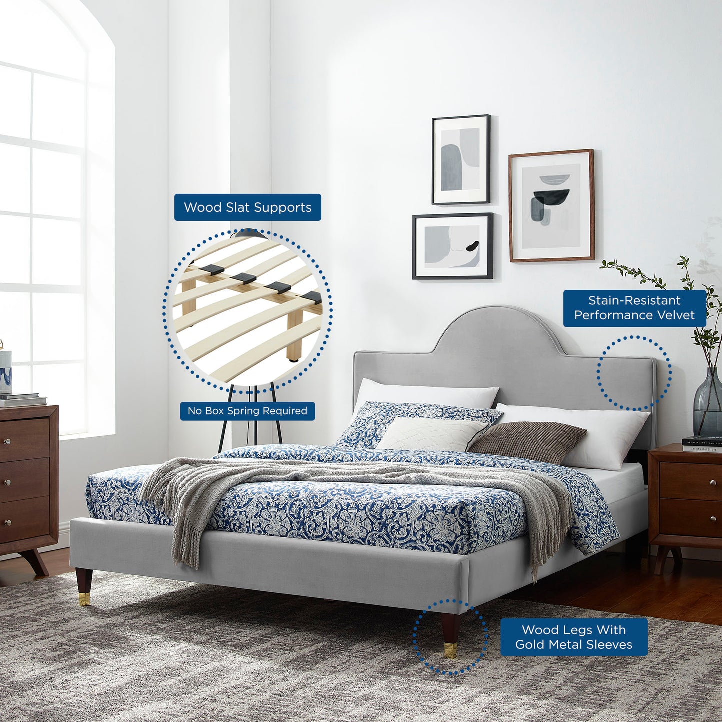 Awaken a teenager's bedroom or guest bedroom with the energizing style of the Aurora Performance Velvet Full. Offering luxe texture and a glam deco look, the full headboard of this bed features an arching silhouette reminiscent of the morning sunrise. This full size bed is upholstered in stain-resistant performance velvet and padded with dense foam creating a soft, supportive place to rest and relax while sitting up in bed. Eliminating the need for a box spring, the MDF frame of this full bed is complete with a wood slat support system crafted with poplar for lasting durability and support. A sturdy mattress foundation for memory foam, innerspring, latex, and hybrid mattresses, this slatted bed frame rests atop wood legs with gold sleeves and non-marking foot caps and includes a reinforced center beam with two support legs for enhanced stability. Full Bed Weight Capacity: 800 lbs.