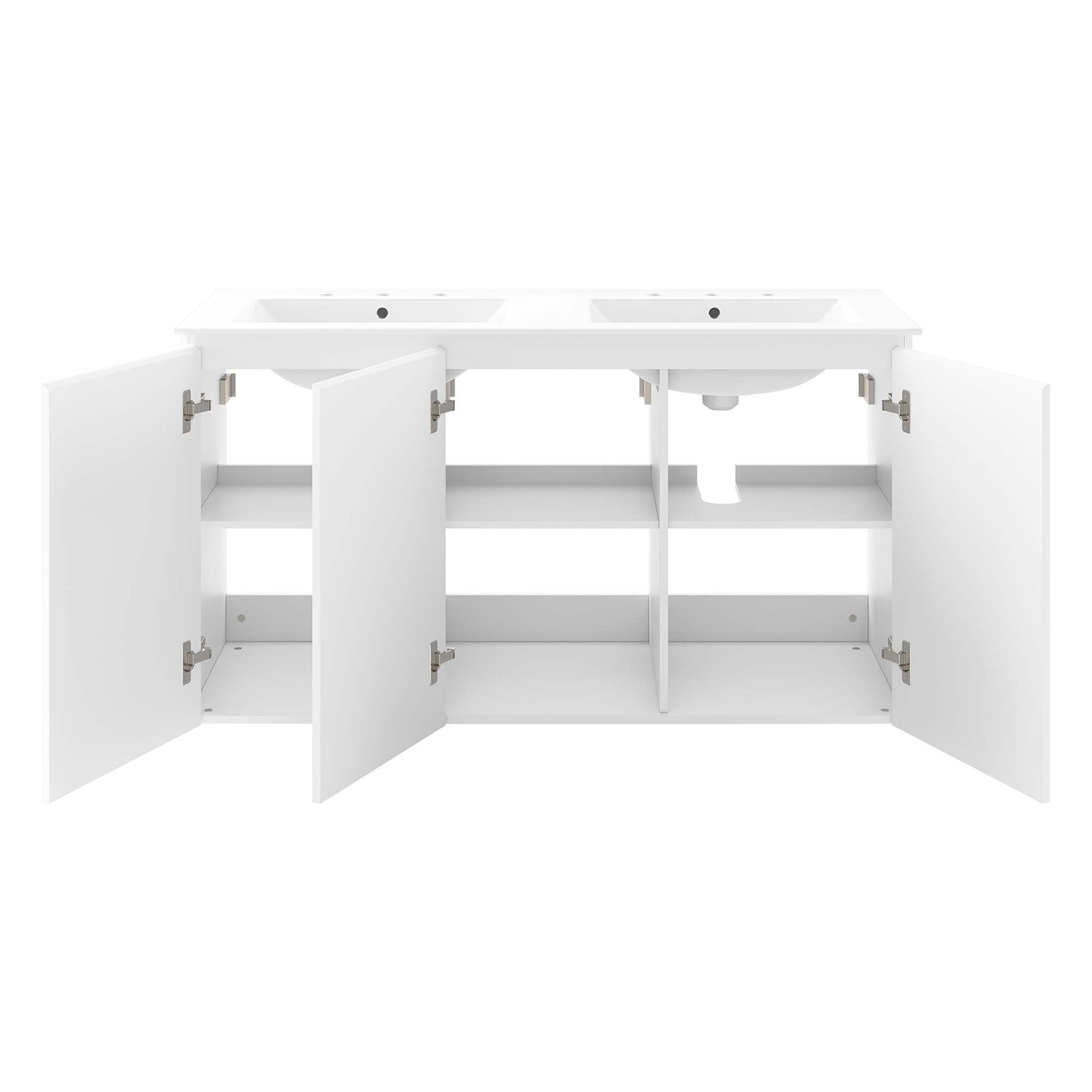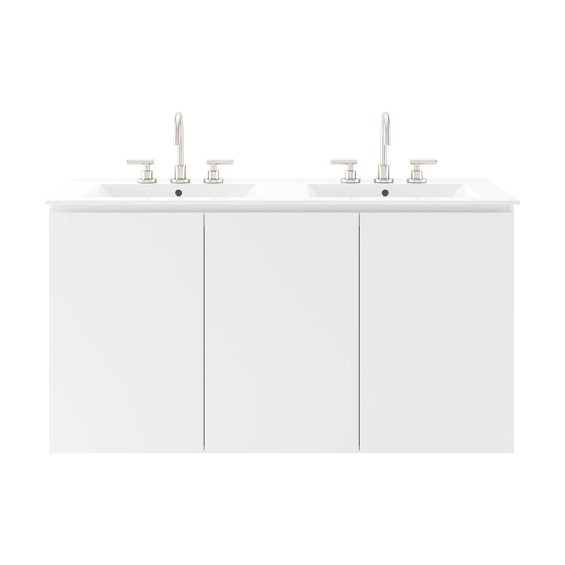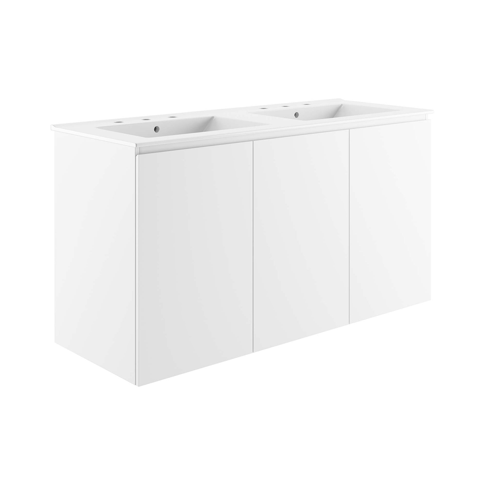 The sleek look and clean-lined silhouette of the Bryn 48" Wall-Mount Double Sink Bathroom Vanity add modern style to your bathroom space. Durably crafted with particleboard and melamine, this vanity mounts directly to the wall and features ample storage space under the sink behind three soft-close doors. Bryn features a cut-out design to accommodate plumbing. This vanity is complete with a double sink ceramic basin with 8-inch centerset holes and an integrated countertop. This double sink has 8” between basins and 24” between basin sink holes. Fixtures not included. Assembly required.