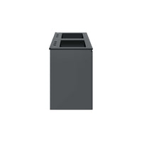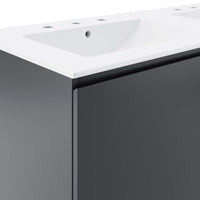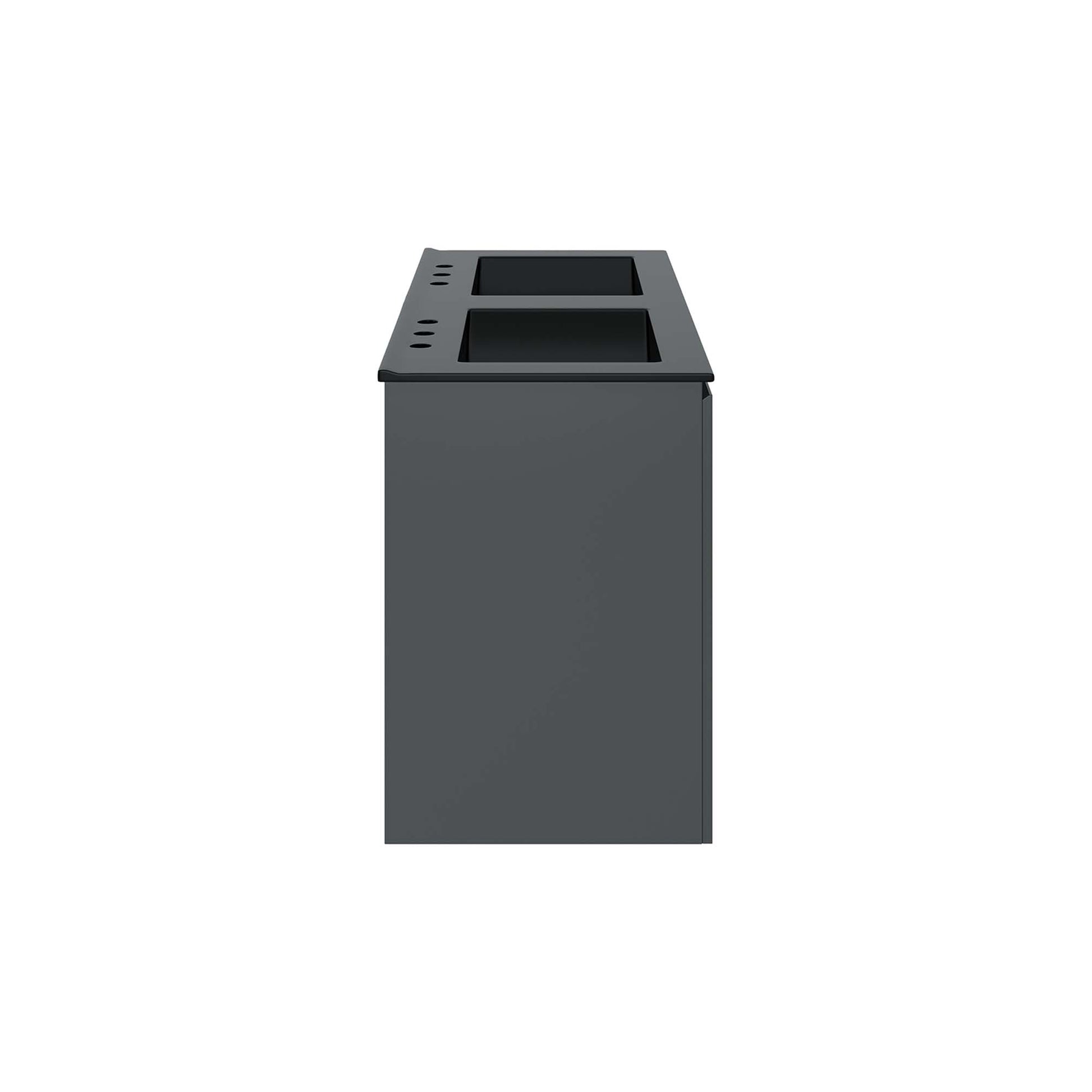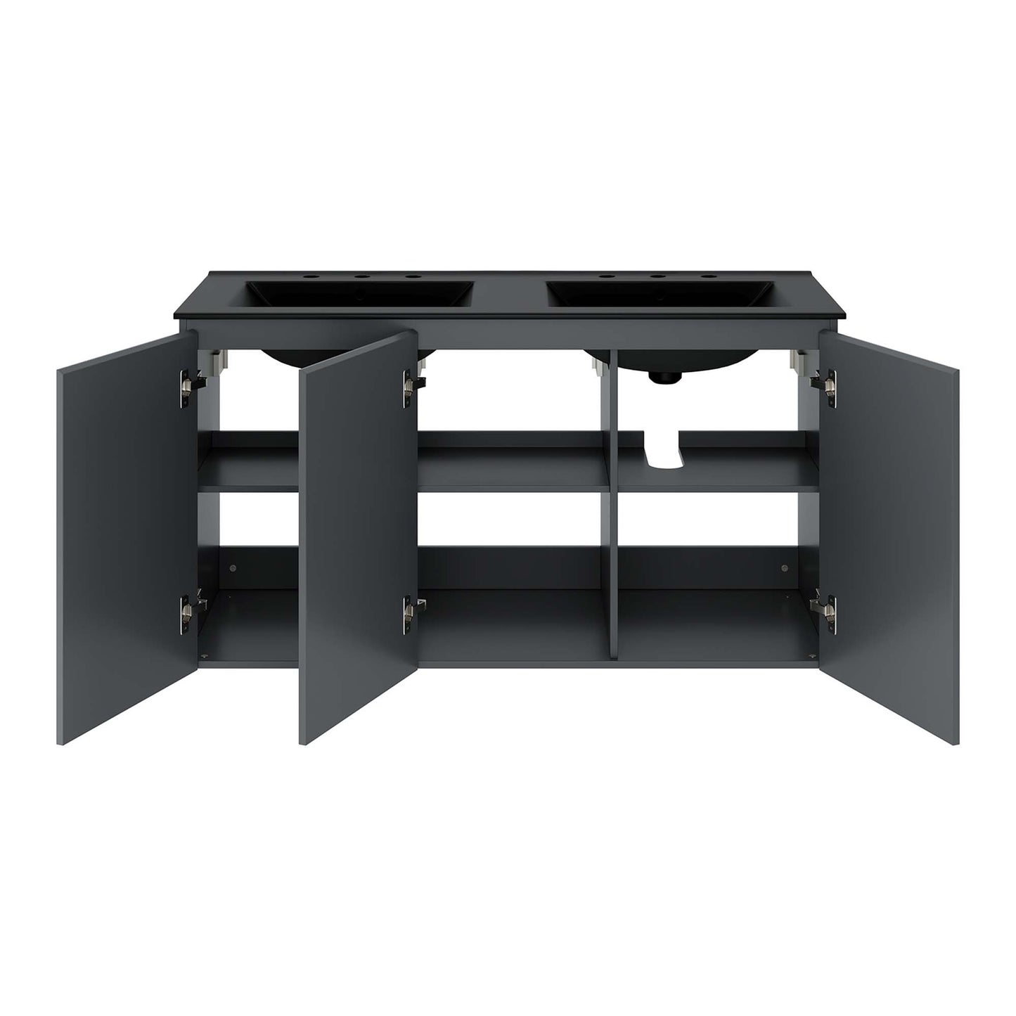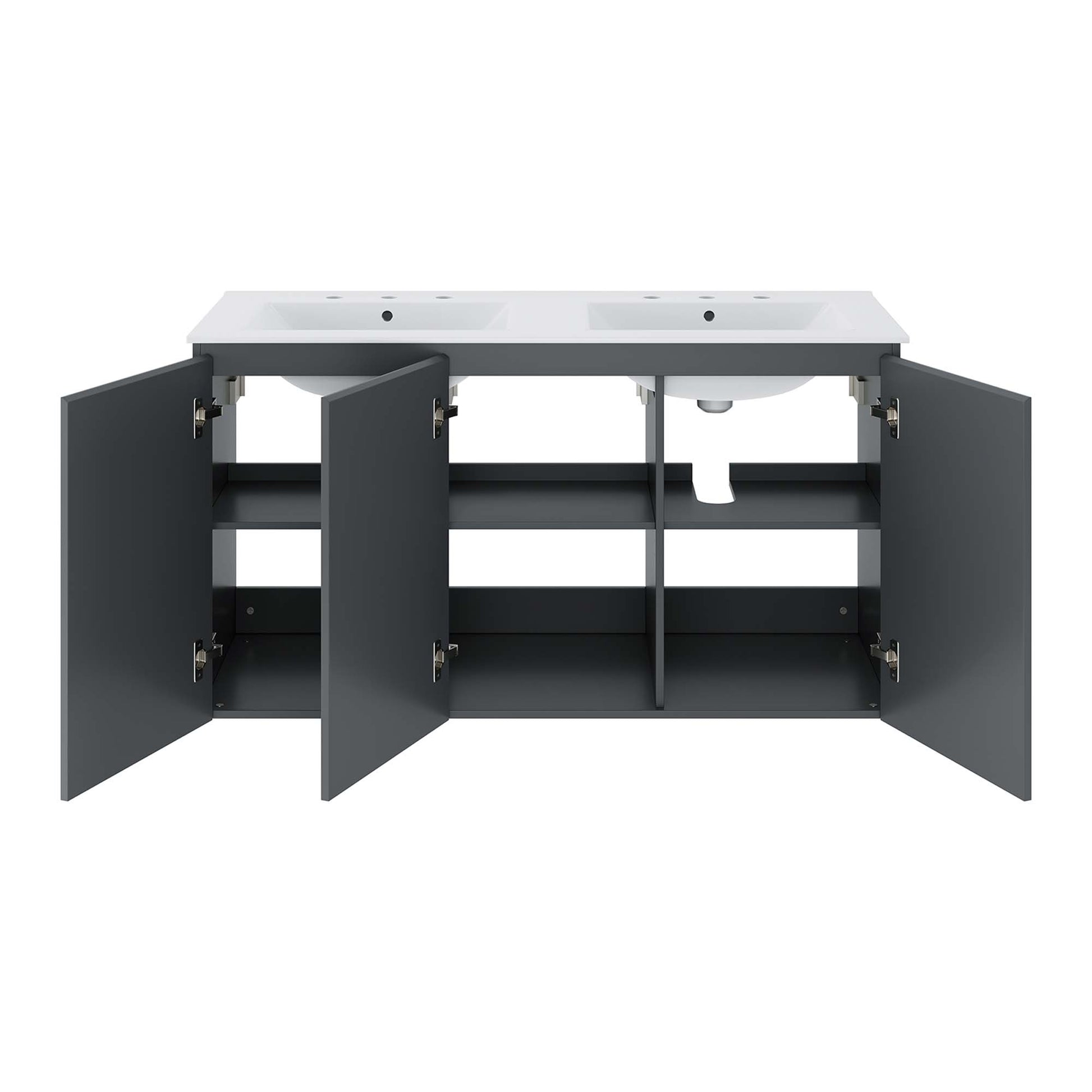 The sleek look and clean-lined silhouette of the Bryn 48" Wall-Mount Double Sink Bathroom Vanity add modern style to your bathroom space. Durably crafted with particleboard and melamine, this vanity mounts directly to the wall and features ample storage space under the sink behind three soft-close doors. Bryn features a cut-out design to accommodate plumbing. This vanity is complete with a double sink ceramic basin with 8-inch centerset holes and an integrated countertop. This double sink has 8” between basins and 24” between basin sink holes. Fixtures not included. Assembly required.