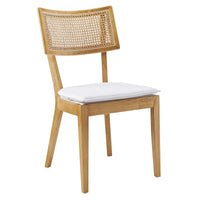 Charming cottage style blends with farmhouse whimsy on the Caledonia Wood Dining Chair Set of Two. Serving as an accent chair or a kitchen chair, this pair adds a touch of retro elegance to the dining or living room. Featuring a curved backrest and airy design thanks to its open weave rattan detail, this dining chair set is crafted with solid elm wood and boasts upholstered seats with foam padding for comfort and support. The fabric seat covers, featuring a hidden zipper for easy removal, are elegantly accentuated with a French seam, adding a refined detail that echoes the artistic vibe of boho dining chairs. A versatile addition to the modern home, these wood chairs make a statement in the dining room or as accent chairs in the living room, office, entryway, or other seating area. Whether you're looking for a dining chair set for your home bistro or a simple chair to complete your dining area, the Caledonia collection has a unique aesthetic that fuses classic comfort with sleek, modern lines. This set includes two elm wood and rattan dining chairs, with non-marking foot caps to protect floors. Assembly required. Weight Capacity: 330 lbs.