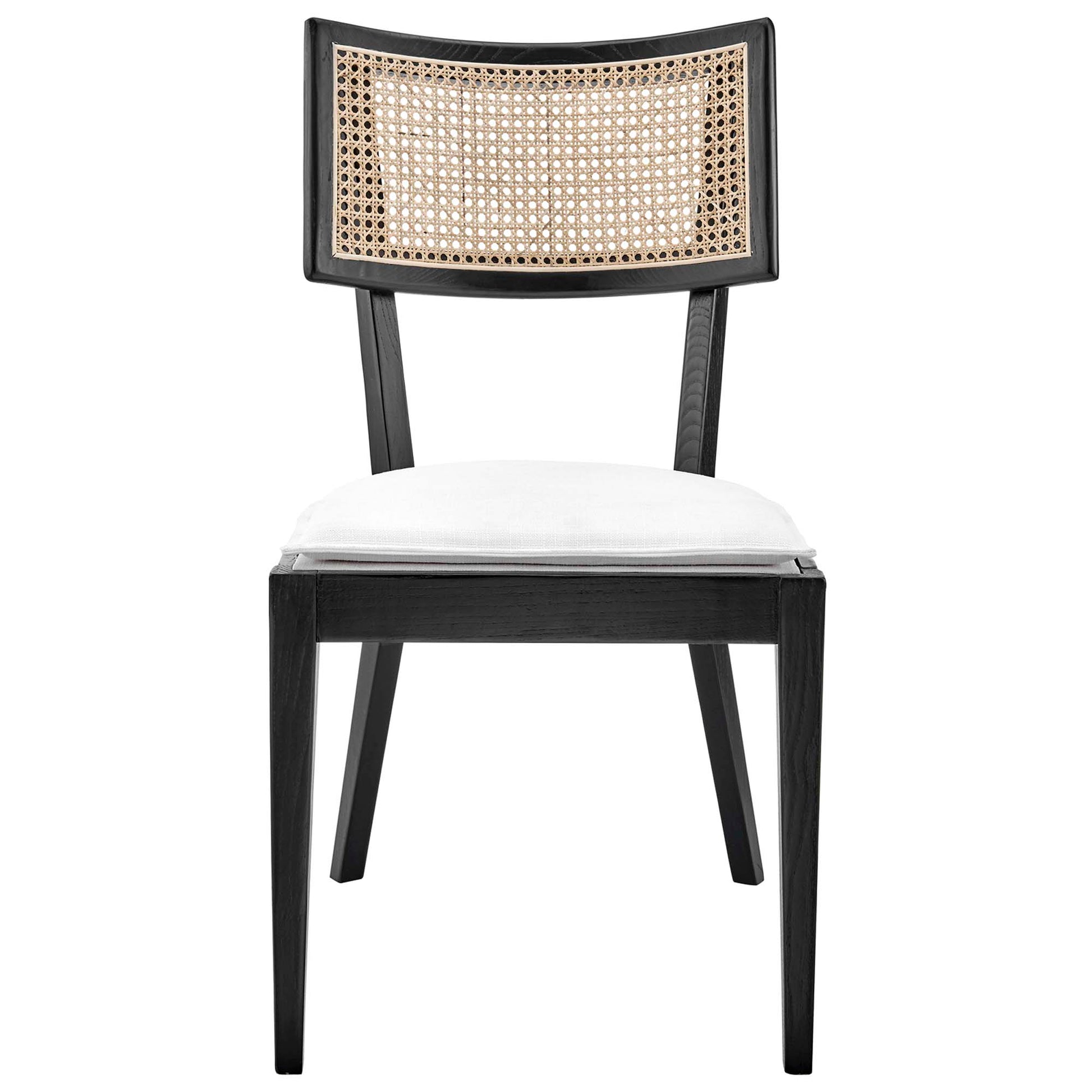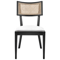 Charming cottage style blends with farmhouse whimsy on the Caledonia Wood Dining Chair. Featuring a curved backrest and airy design with a woven rattan cane detail, this dining chair is crafted with solid elm wood and features a fabric upholstered seat for comfort and support. A versatile addition to the modern home, this wood chair makes a statement in the dining room or as an accent chair in the living room, office, entryway, or other seating area. Includes non-marking foot caps. Assembly Required. Weight Capacity: 330 lbs.