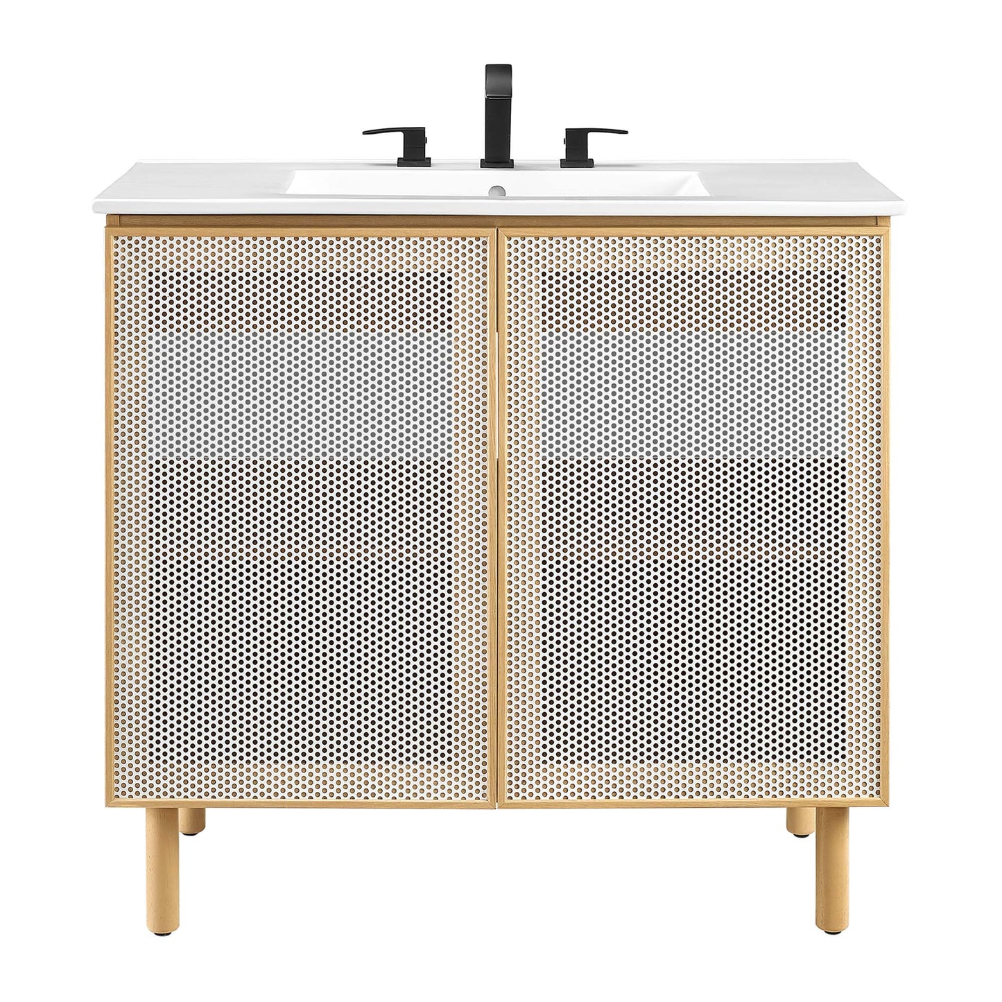 Elevate your bathroom space with the Calla 36" Bathroom Vanity, where contemporary design meets everyday practicality. This single bathroom vanity features a durable particleboard construction with a smooth laminate finish that adds a modern touch to your bathroom decor. The unique perforated metal door fronts of this bathroom sink cabinet offer a stylish update while concealing ample storage space for all your bathroom essentials. This small space vanity single is customizable with its adjustable shelf, designed to accommodate your plumbing needs with ease. The push-to-open doors and sleek dowel legs highlight its minimalist design, while the bathroom vanity sink's non-marking, adjustable foot levelers protect your flooring. A high-quality ceramic sink basin with 8" centerset holes completes the look, ready for faucet installation (not included). The Calla vanity sink requires simple assembly, with clear instructions to guide you through the setup. Fixtures not included.